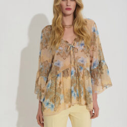 Boho chic floral πουκαμίσα με V-ντεκολτέ με δέσιμο και μανίκια καμπάνα για κομψές εμφανίσεις