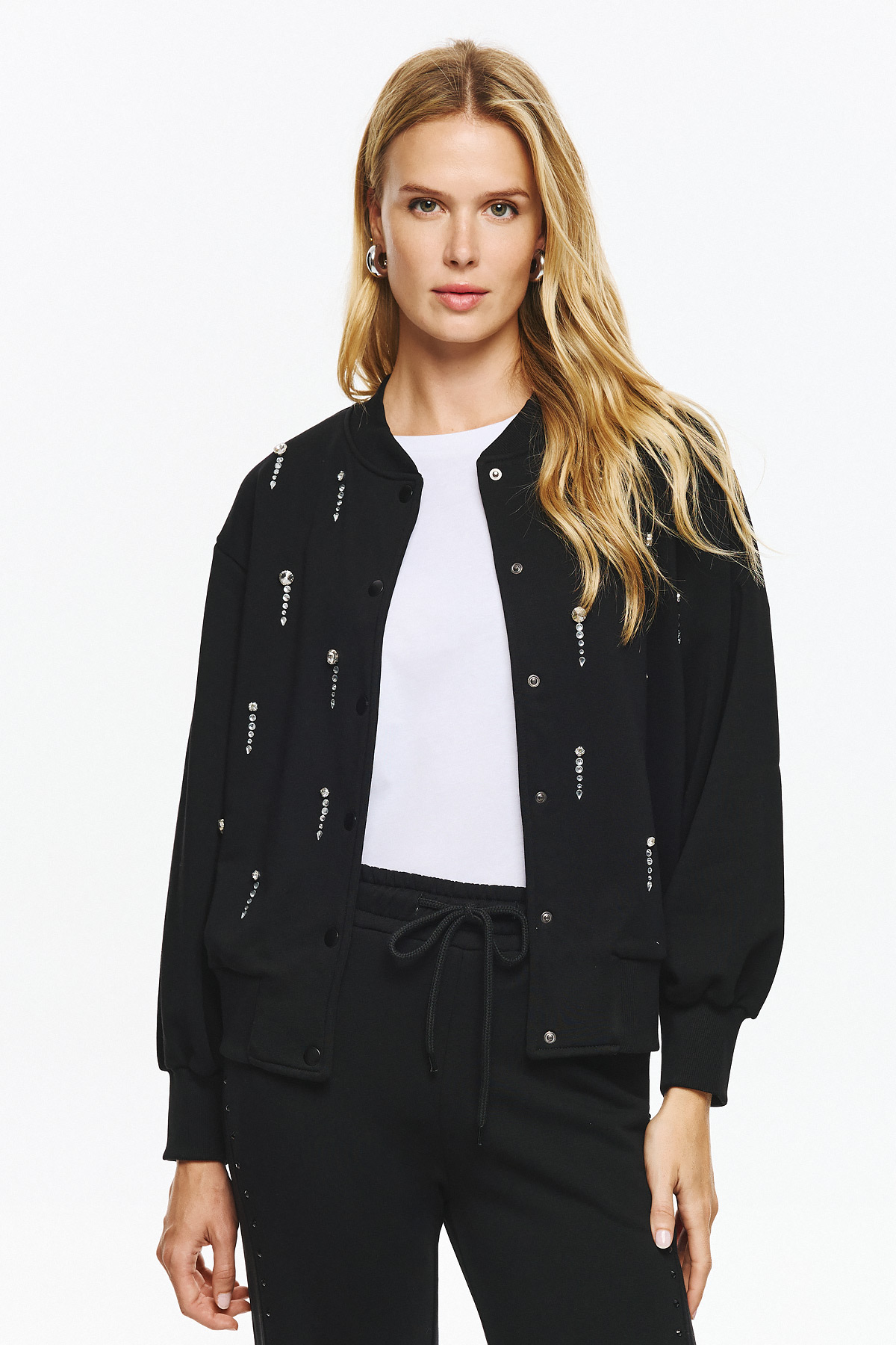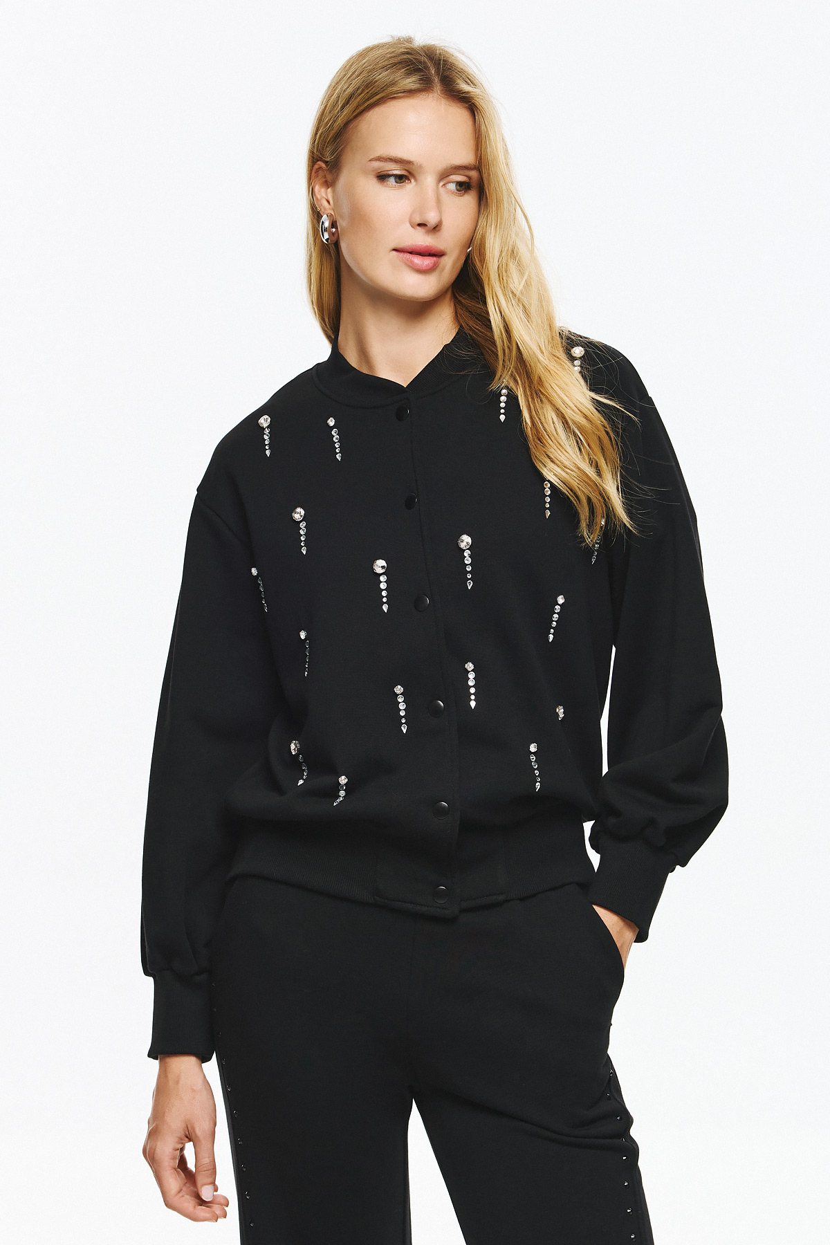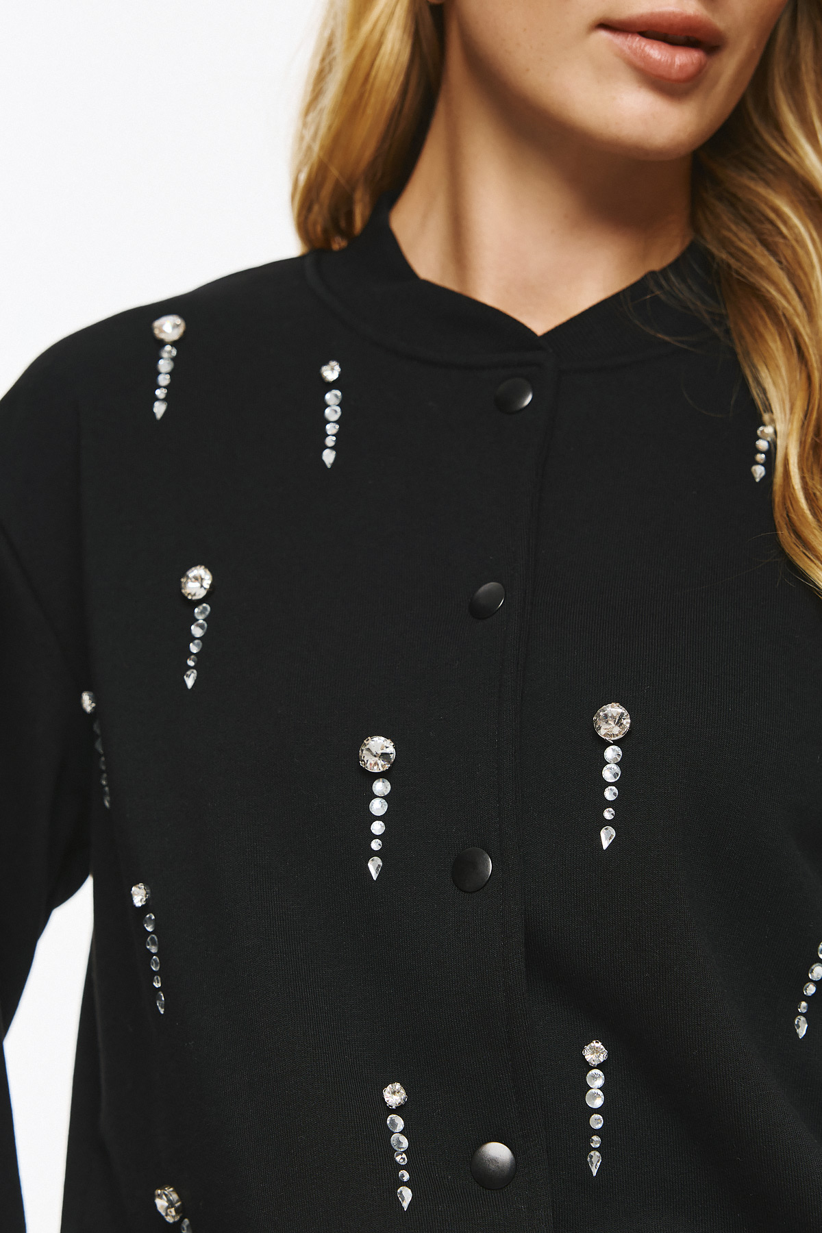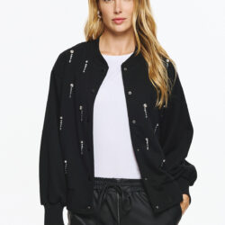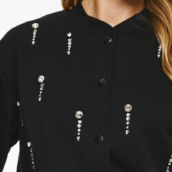 Φούτερ τζάκετ με ματ κουμπιά και διακριτική ριπ λαιμόκοψη-μανσέτα, σε loose γραμμή. Όλη η επιφάνεια διακοσμείται με κάθετες σειρές από κρυστάλλινες πέτρες που δημιουργούν λαμπερό αποτέλεσμα και high-fashion διάθεση.
