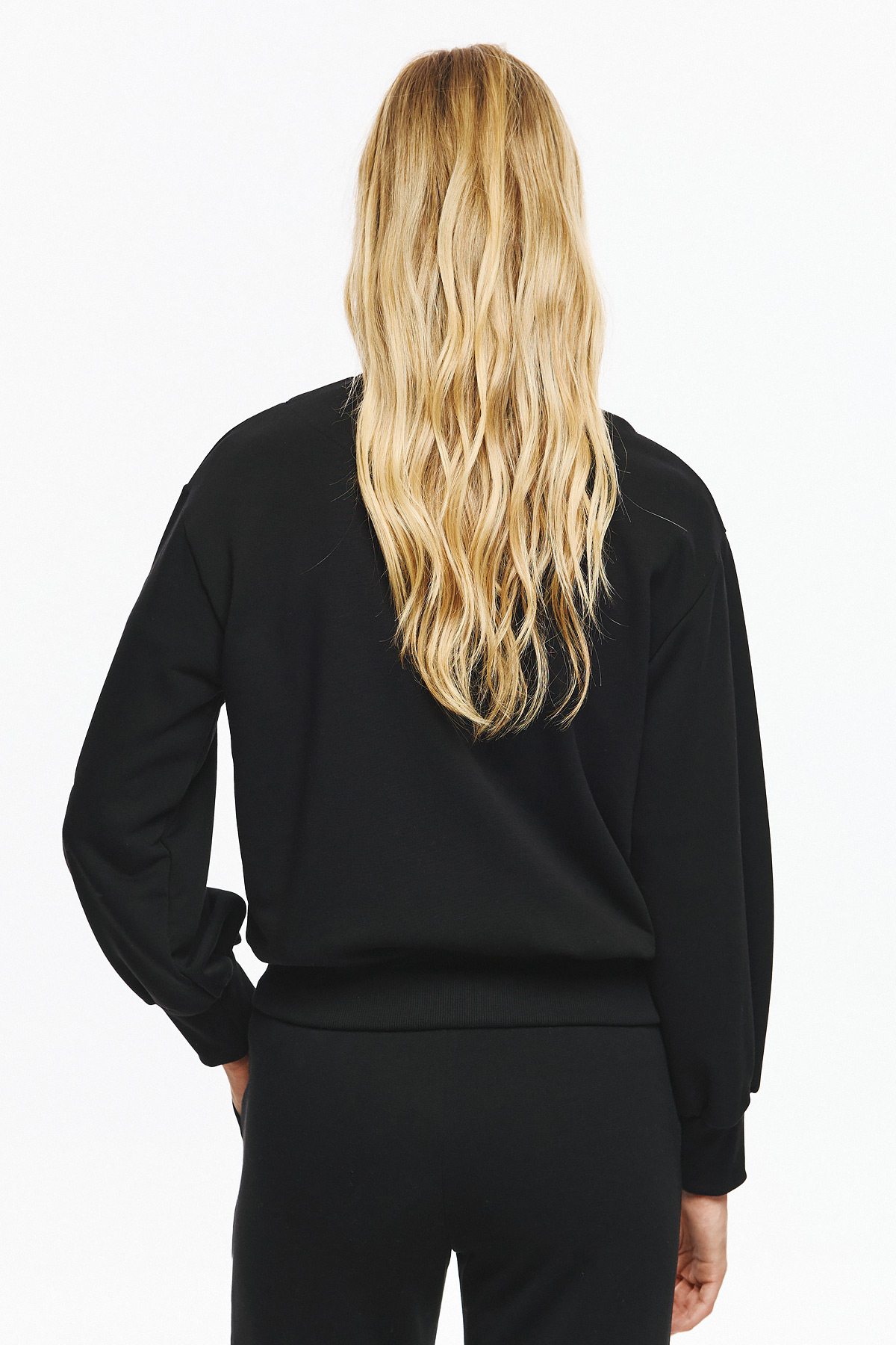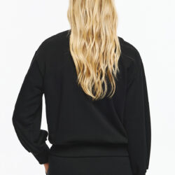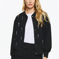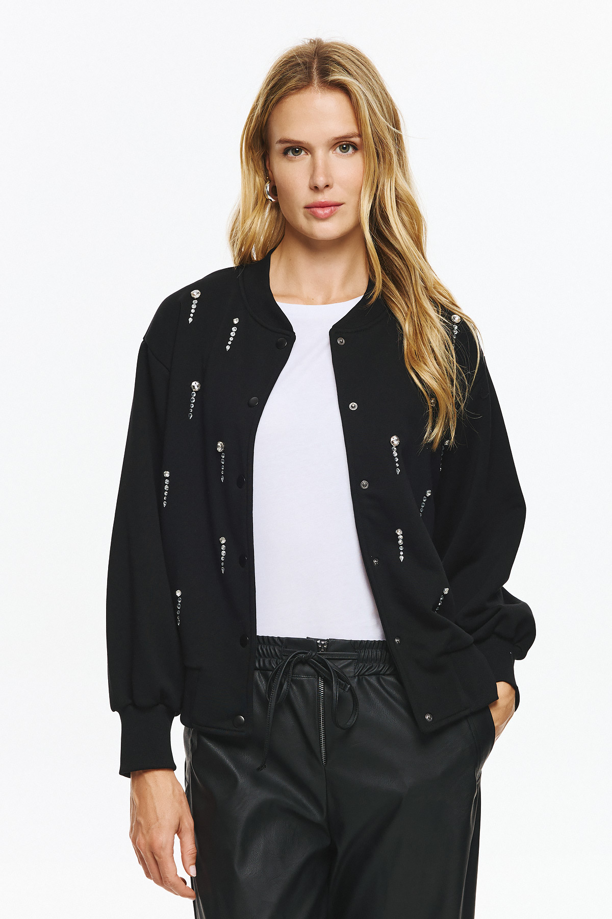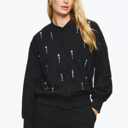 Φούτερ τζάκετ με ματ κουμπιά και διακριτική ριπ λαιμόκοψη-μανσέτα, σε loose γραμμή. Όλη η επιφάνεια διακοσμείται με κάθετες σειρές από κρυστάλλινες πέτρες που δημιουργούν λαμπερό αποτέλεσμα και high-fashion διάθεση.