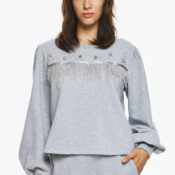 Γυναικείο φούτερ με πολυτελή διακόσμηση: εντυπωσιακά στρας και διακοσμητικά κρύσταλλα στο στήθος, συνδυασμένα με φτερά που χαρίζουν ένα glamorous, θηλυκό twist στο casual style. Η κοντή, boxy γραμμή με balloon μανίκια προσφέρει άνεση και μοντέρνα αίσθηση, ενώ το αποτέλεσμα είναι μοναδικό τόσο για καθημερινό όσο και για statement outfit.