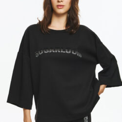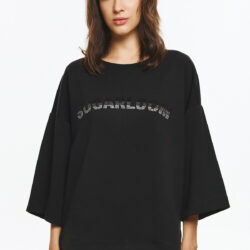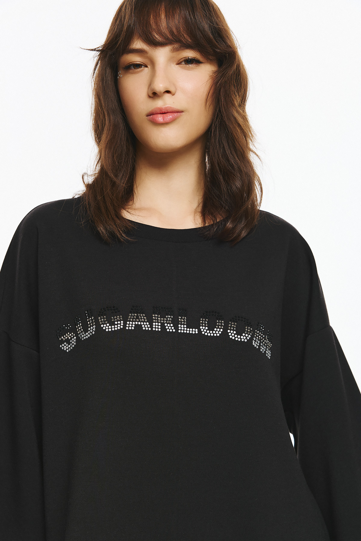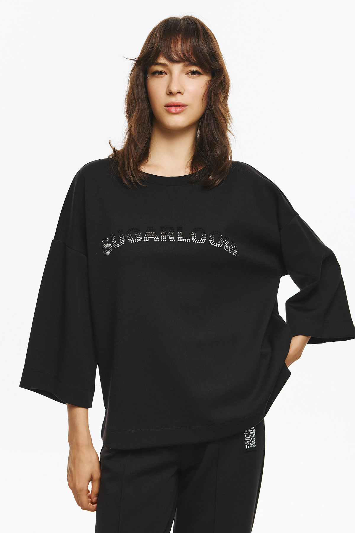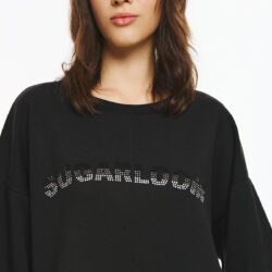 Φούτερ μπλούζα με glittery στρας γράμματα μπροστά. Διαθέτει φαρδιά γραμμή, τρουακάρ μανίκια και υπέρκομψο, minimal design. Το ύφασμα προσφέρει άνεση και διαχρονικό στυλ, ενώ το διακριτικό logo χαρίζει παιχνιδιάρικη και σύγχρονη διάθεση.