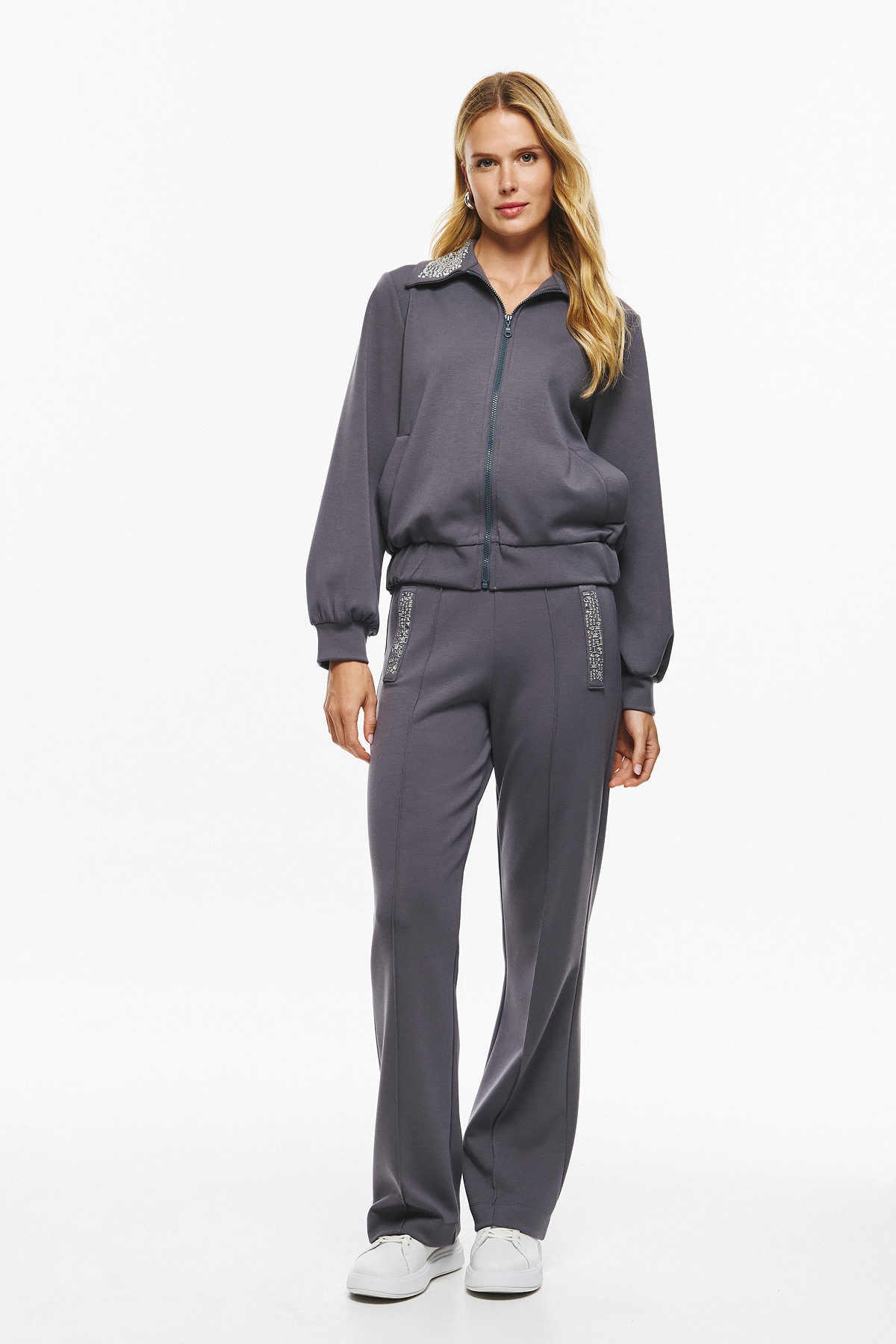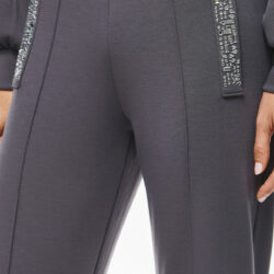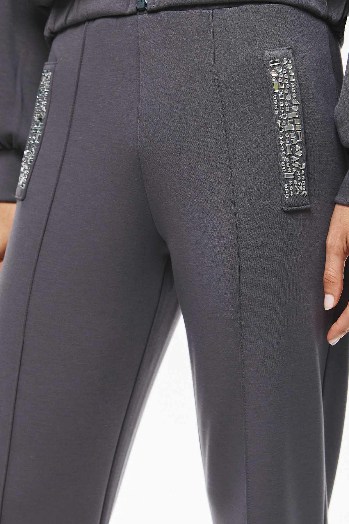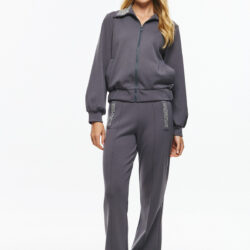 Γυναικείο παντελόνι από μαλακό, χονδρό φούτερ ύφασμα. Έχει ίσια, άνετη γραμμή και διακοσμητικά κρύσταλλα σε κάθε τσέπη που προσφέρουν glamorous πινελιά στο minimal loungewear look. Το ύφασμα προσφέρει ελαστικότητα και άνεση, ενώ η λεπτομέρεια με στρας αναβαθμίζει στιγμιαία το casual outfit.