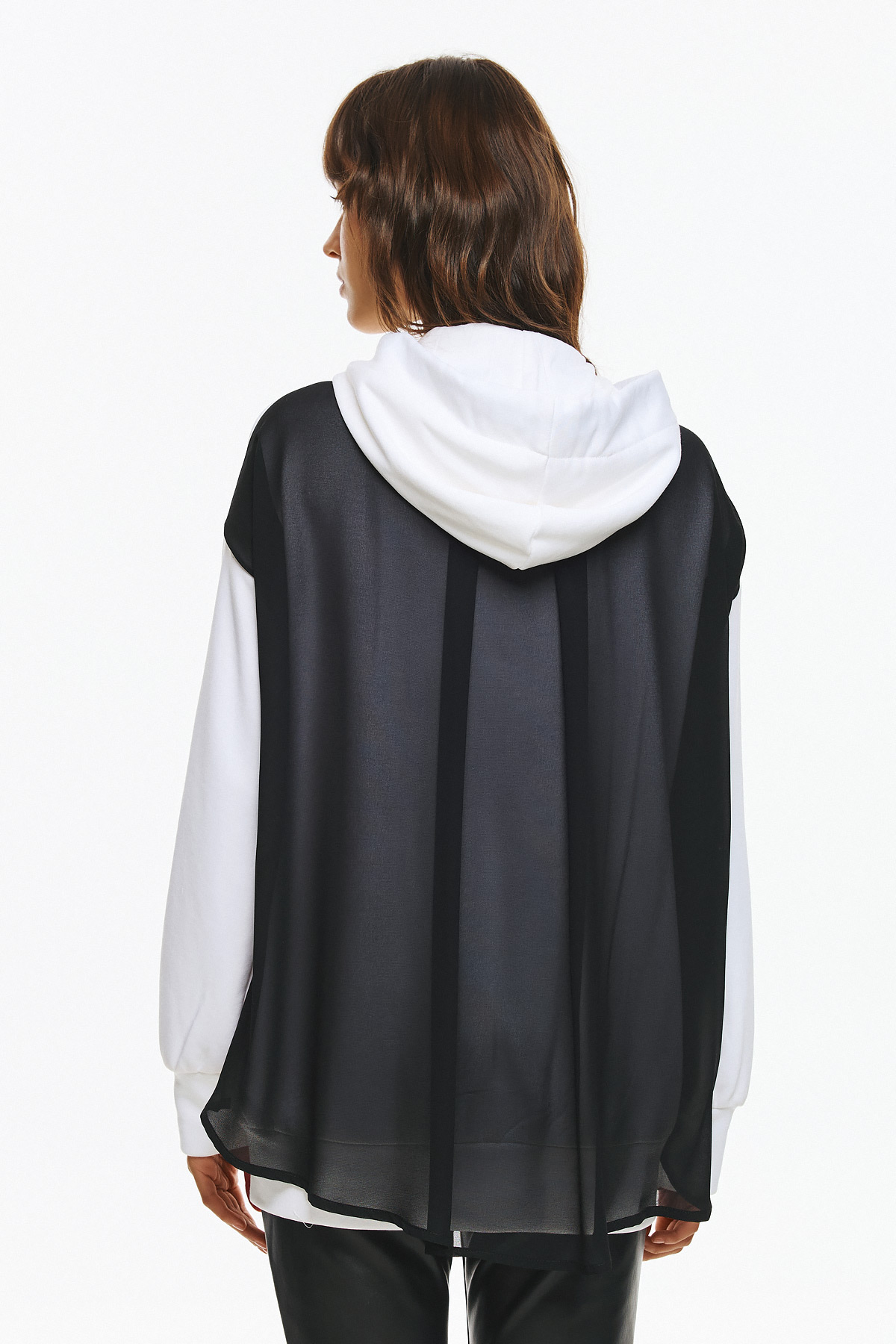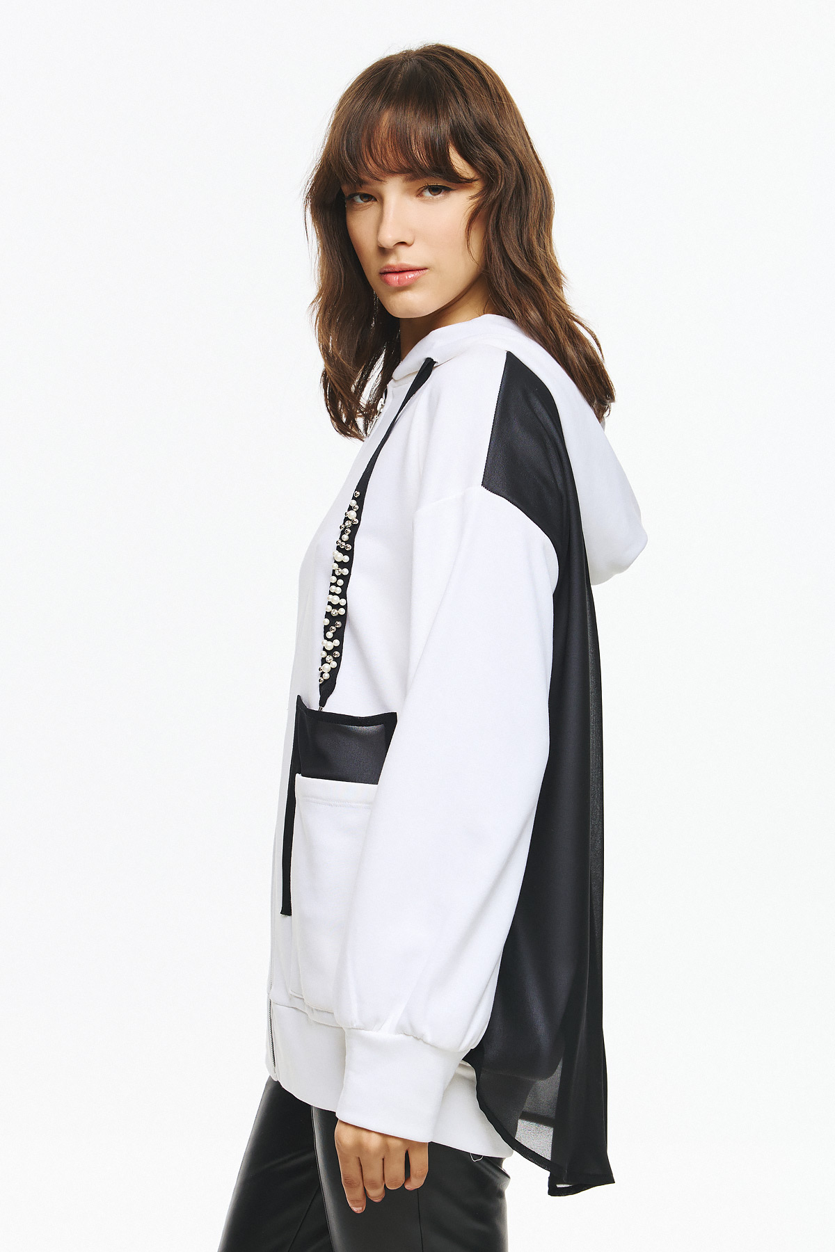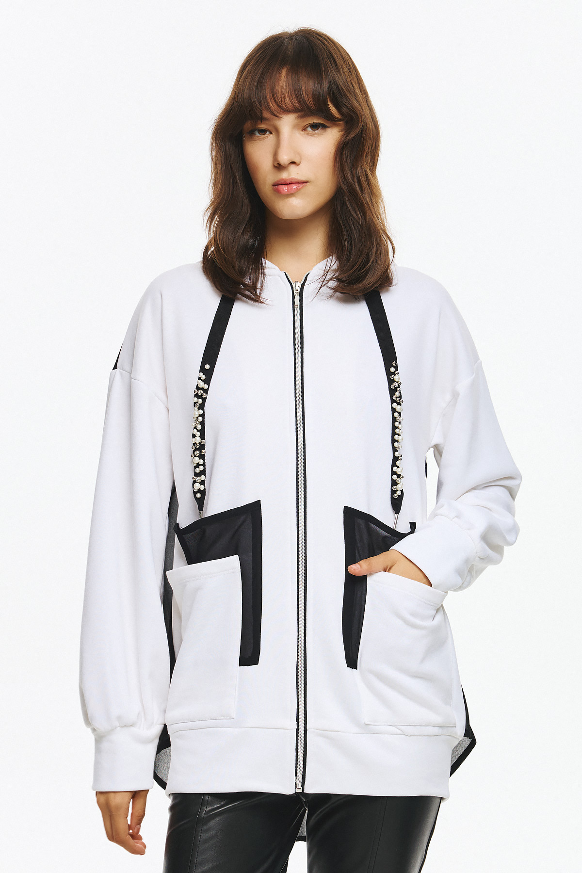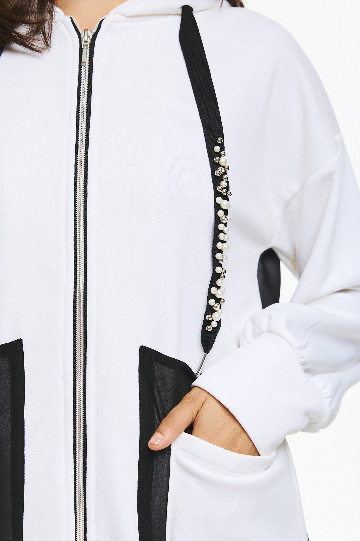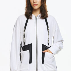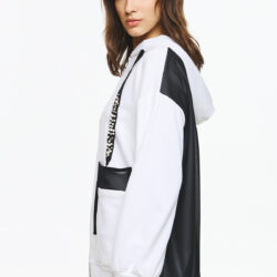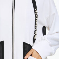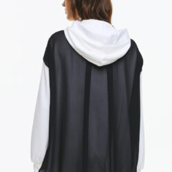 Φούτερ ζακέτα με κουκούλα, φερμουάρ μπροστά και ιδιαίτερο διχρωμία σε μαύρες λεπτομέρειες. Τα κορδόνια της κουκούλας είναι διακοσμημένα με γυαλιστερές πέρλες και στρας, που προσθέτουν glamorous χαρακτήρα στο athleisure look. Οι μεγάλες εξωτερικες τσέπες με το μαύρο διάφανο layering στην πλάτη συμπληρώνουν το μοντέρνο, statement στυλ της ζακέτας.