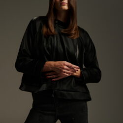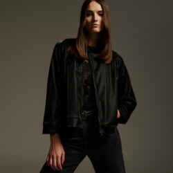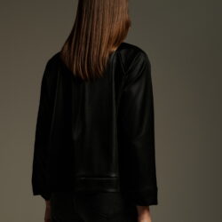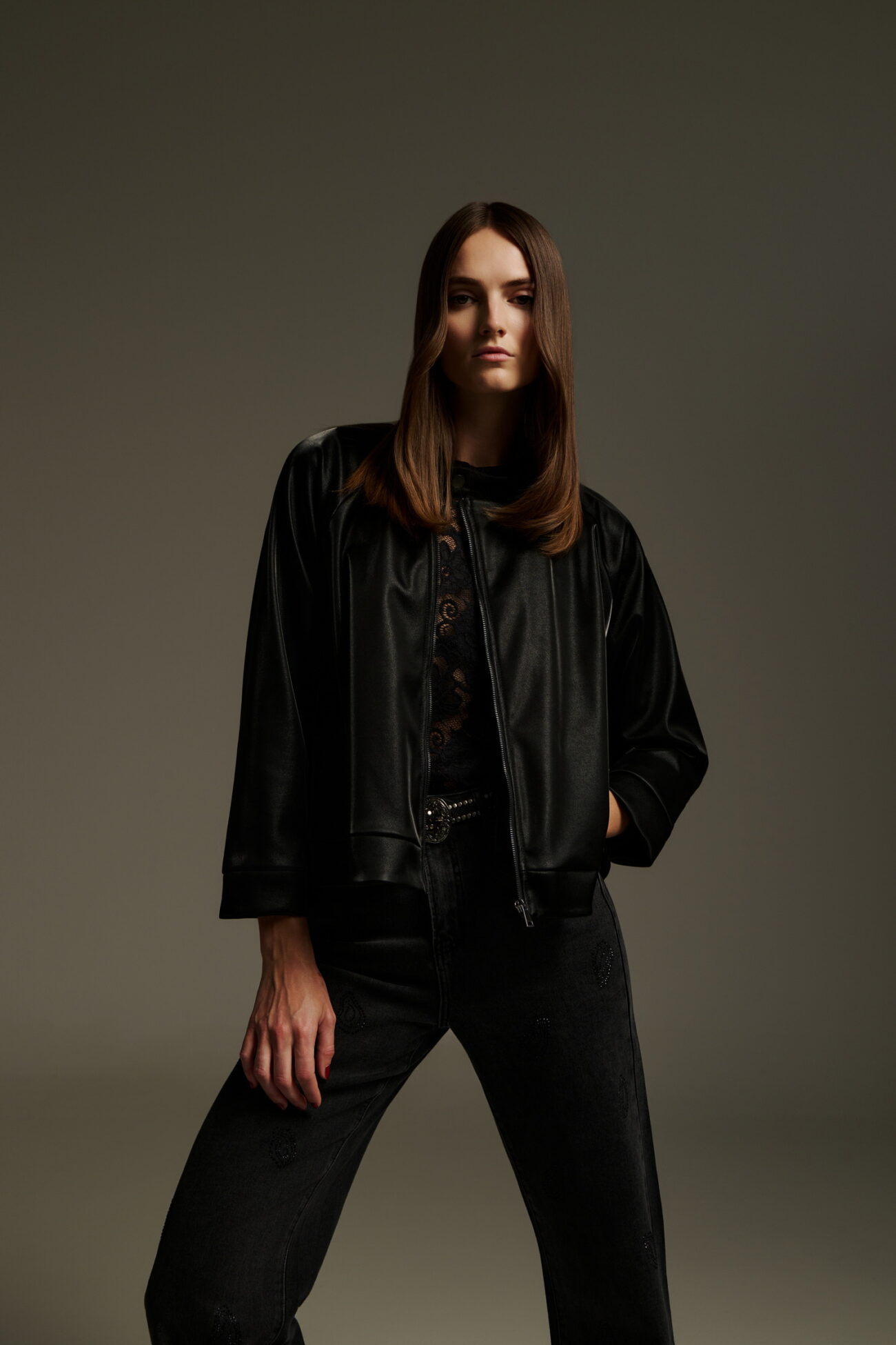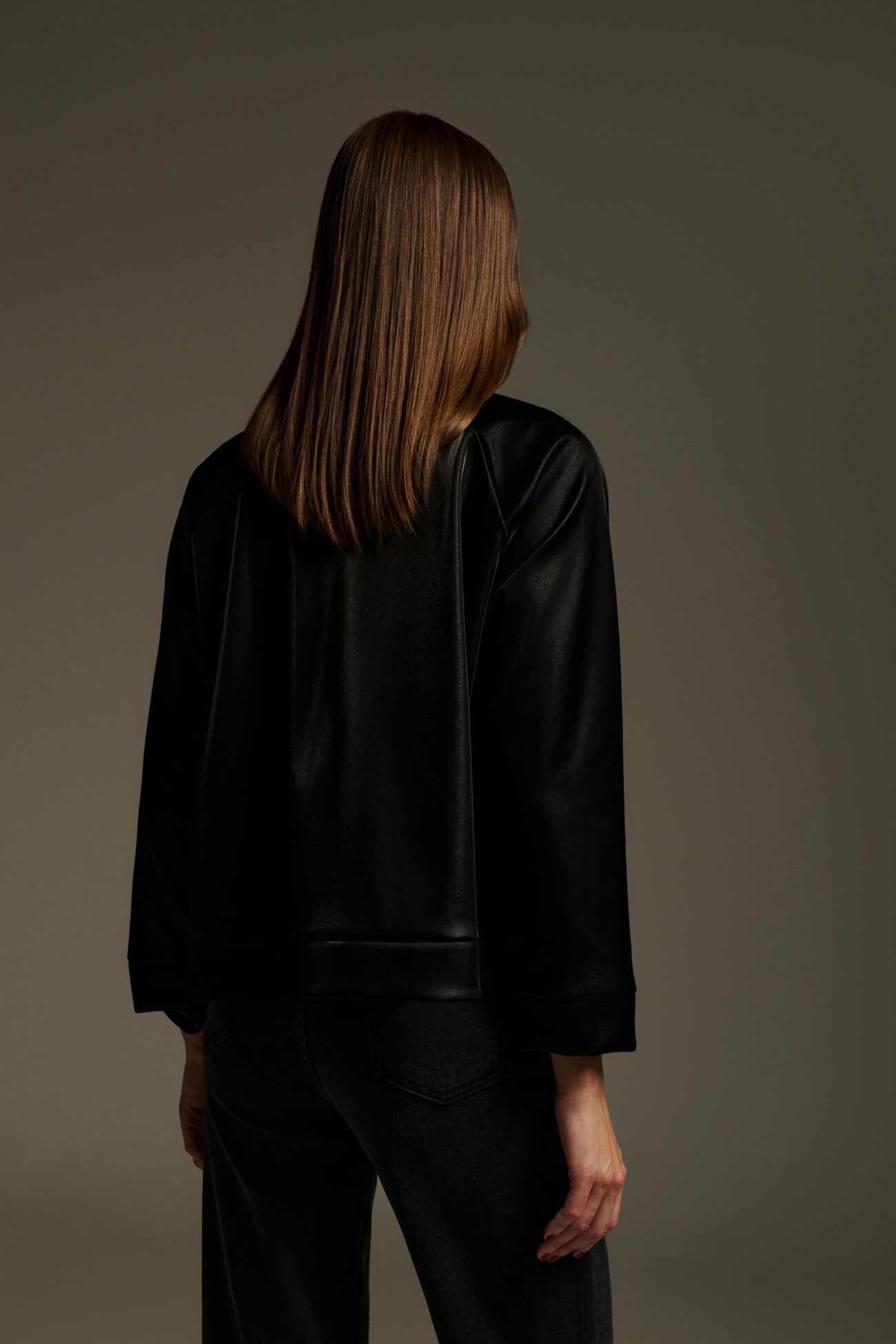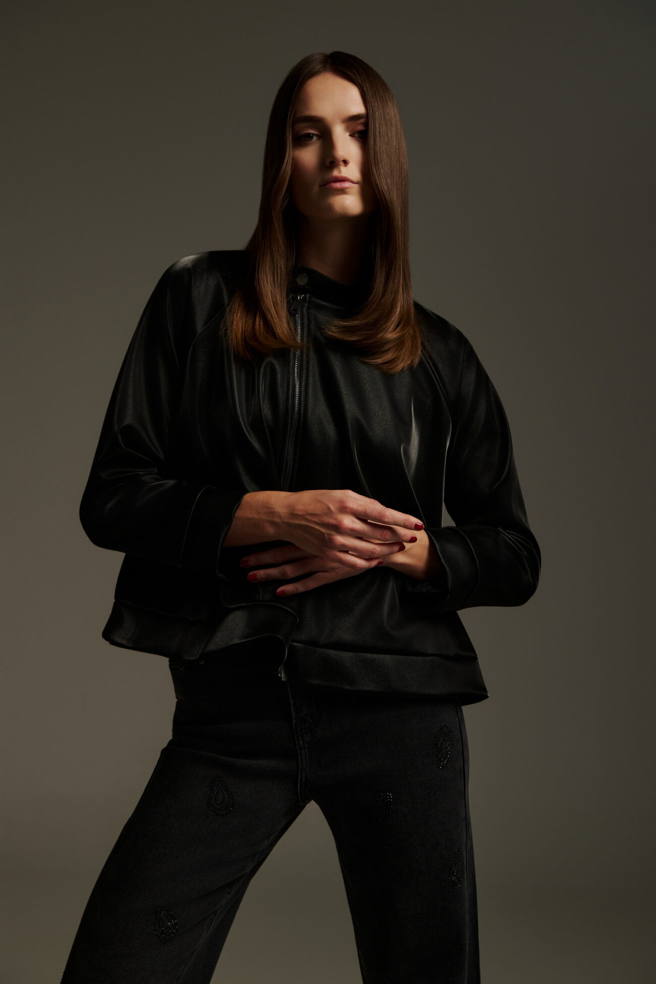 Κοντό oversized μπουφάν από μαύρη οικολογική δερματίνη, με ίσια γραμμή. Το σχέδιο διαθέτει χαμηλούς ώμους και διακριτικό φινίρισμα στις ραφές, προσδίδοντας πολυτελή υφή και sleek αποτέλεσμα. Συνδυάζεται ιδανικά με μαύρο denim, για μοντέρνο urban στυλ με διαχρονικό χαρακτήρα.