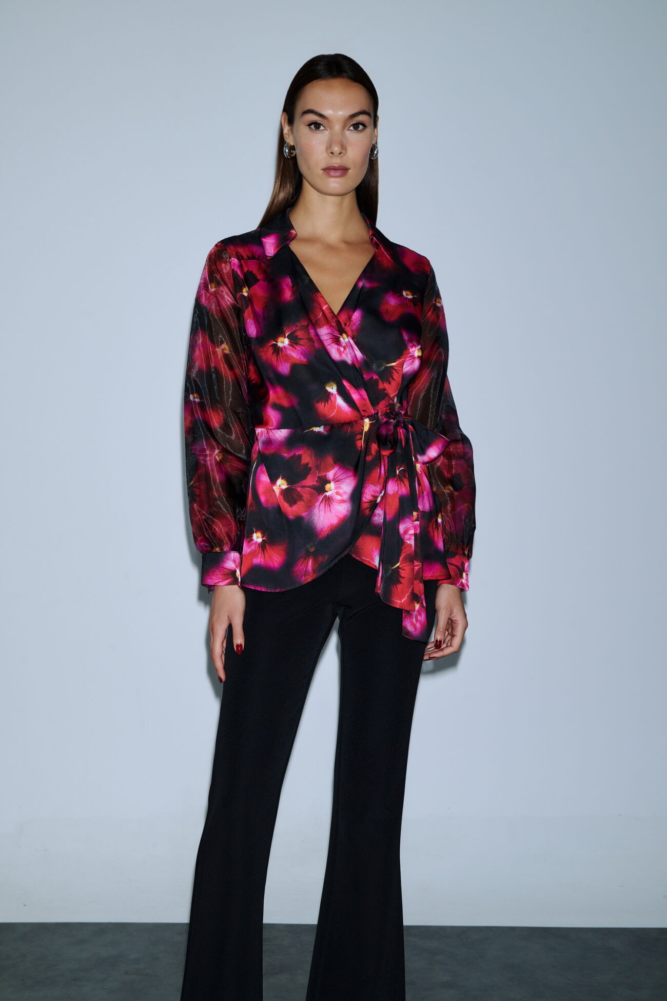 Κρουαζέ wrap μπλούζα με εντυπωσιακό εμπριμέ floral μοτίβο σε τόνους φούξια, κόκκινου και μαύρου, που δίνει ένταση και δυναμισμό στην εμφάνιση. Τα μανίκια είναι μακριά, διαφανή και ελαφρώς balloon, ενώ στη μέση δένει με φαρδιά ζώνη από το ίδιο ύφασμα για έξτρα θηλυκότητα και σμίλευση της σιλουέτας. Το ύφασμα είναι αέρινο, με σατινέ φινίρισμα που αναδεικνύει τα ζωηρά χρώματα του print.