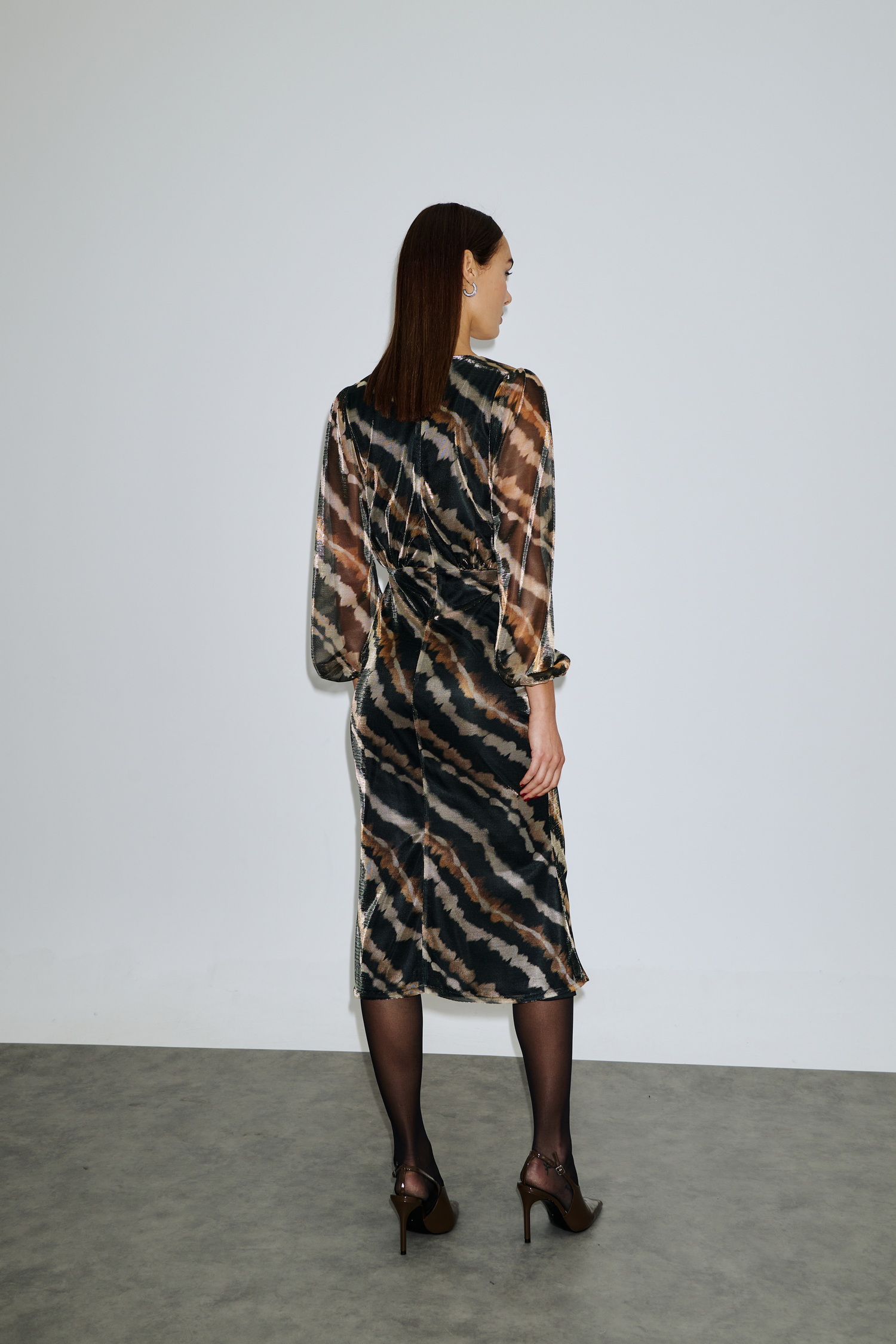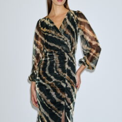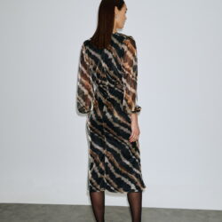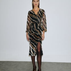 Midi φόρεμα με ιδιαίτερο animal print σε αποχρώσεις μαύρου, καφέ και μπεζ, από ελαφρώς ελαστικό ύφασμα με shine υφή. Διαθέτει ιδιαίτερη πλισέ/σούρα λεπτομέρεια μπροστά, που αγκαλιάζει το σώμα και προσθέτει εφέ κίνησης. Τα balloon μανίκια σε see-through ύφασμα χαρίζουν romantic touch, ενώ το άνοιγμα μπροστά στη φούστα εξασφαλίζει άνεση και πιο θηλυκό look. Το φόρεμα είναι ιδανικό για βραδινές εξόδους αλλά και statement εμφανίσεις στο γραφείο.