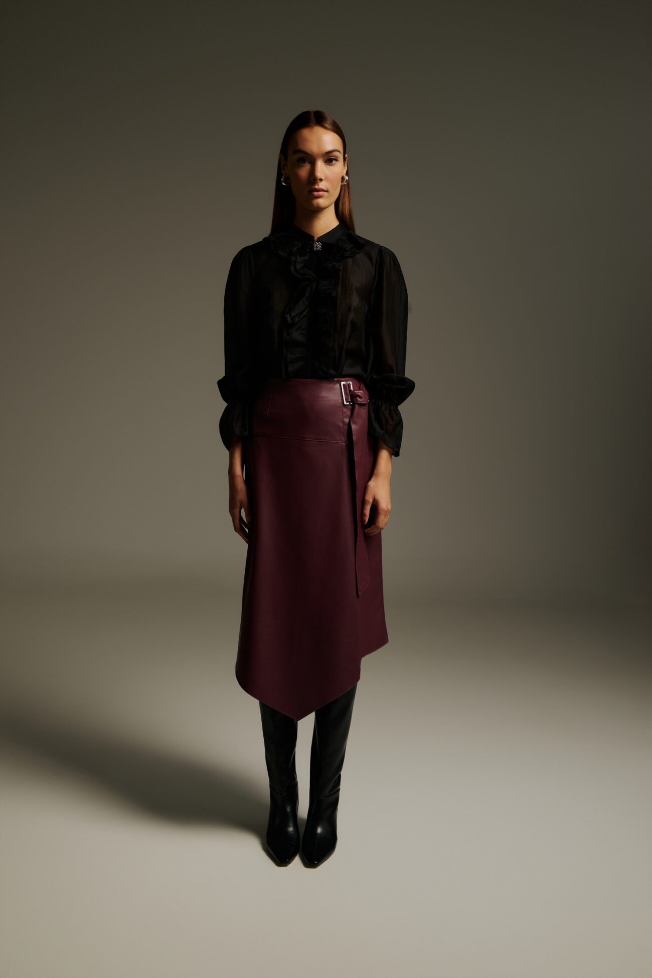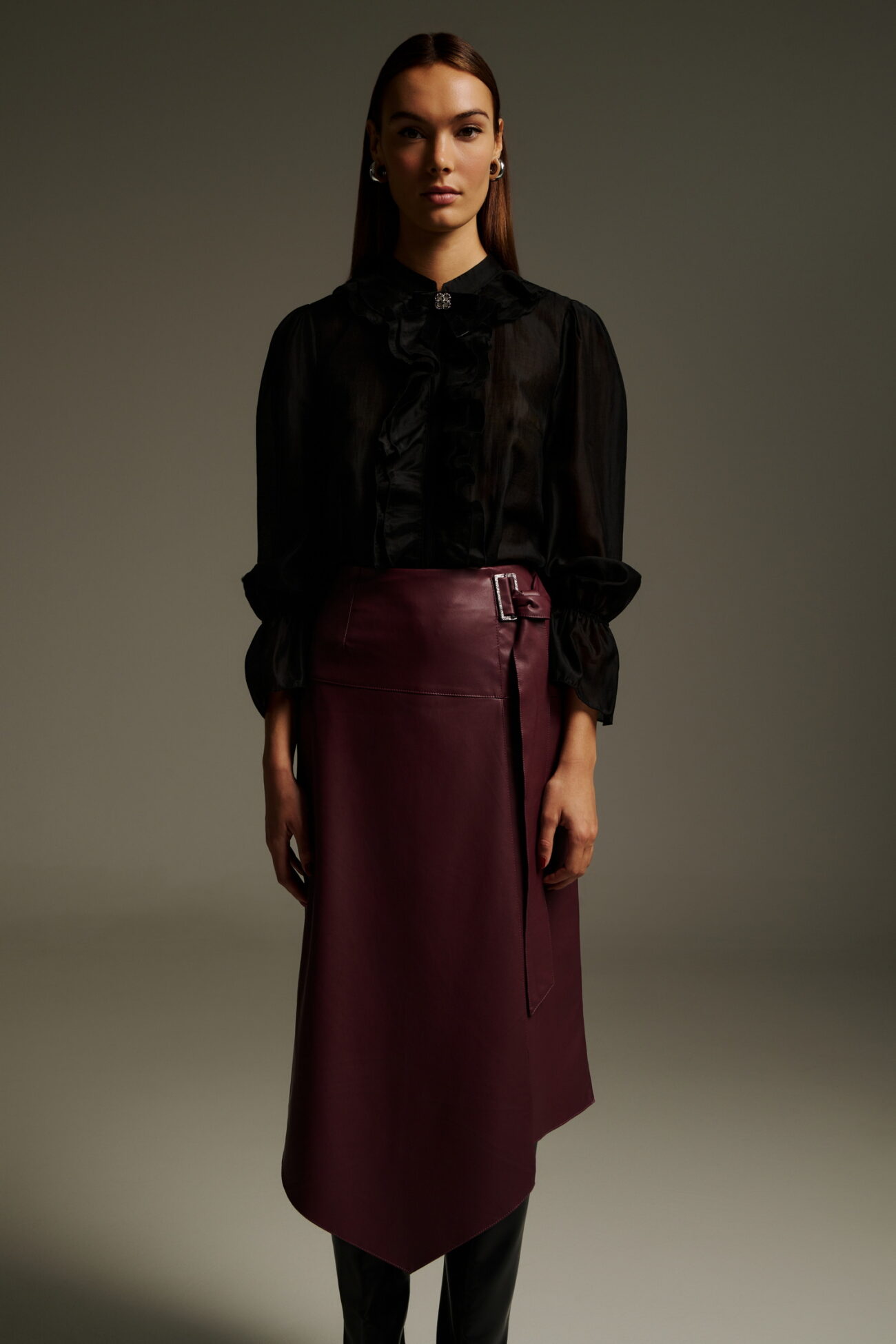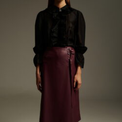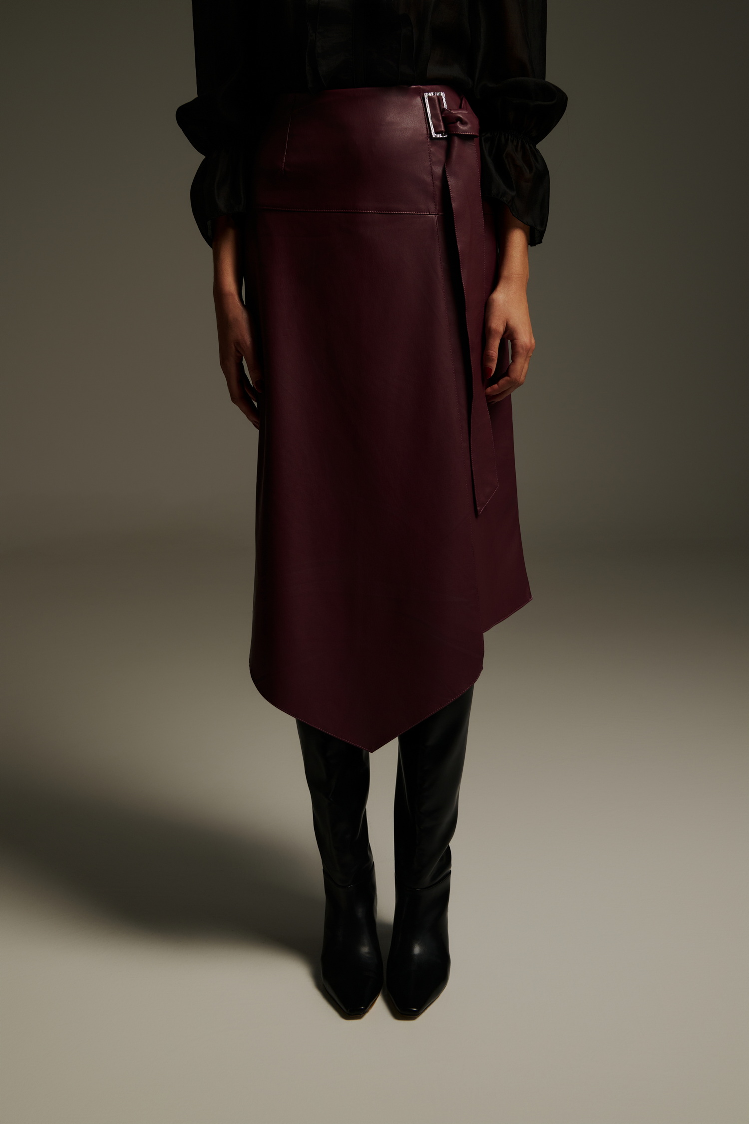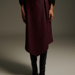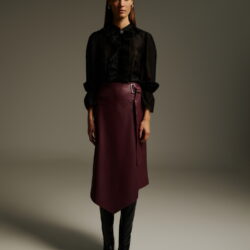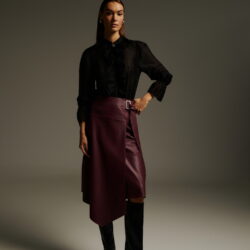 Μίντι ασύμμετρη φούστα δερματίνη. Το κλείσιμο γίνεται με μοντέρνα μεταλλική αγκράφα στο πλάι, ενώ το ύφασμα αγκαλιάζει τη σιλουέτα χαρίζοντας δυναμισμό στο look. Η ιδιαίτερη ασύμμετρη γραμμή δίνει minimal αλλά statement χαρακτήρα. Συνδυάζεται ιδανικά με μαύρο διαφανές πουκάμισο και δερμάτινες μπότες για σύγχρονο, urban chic αποτέλεσμα.