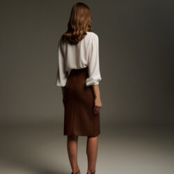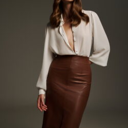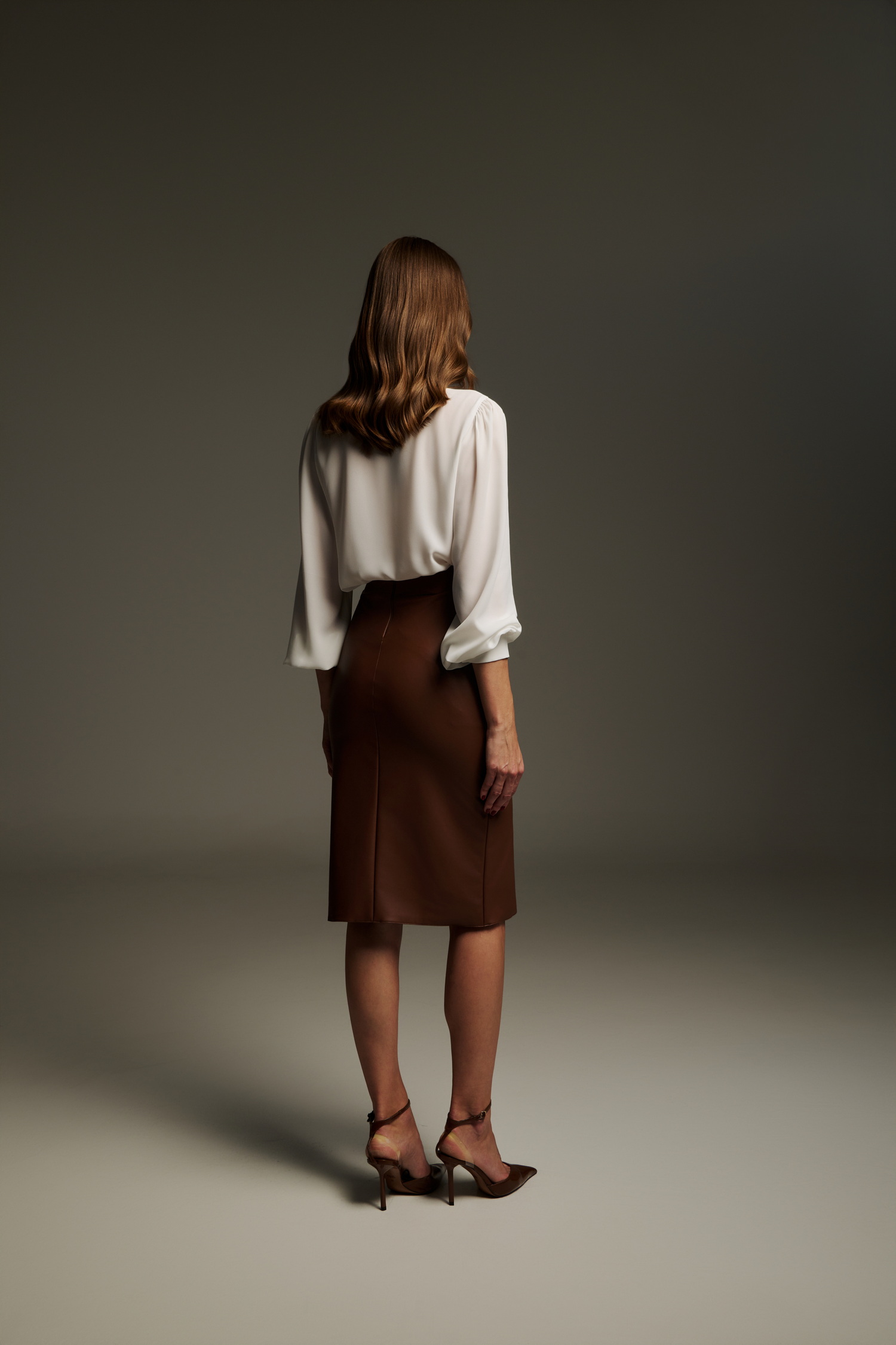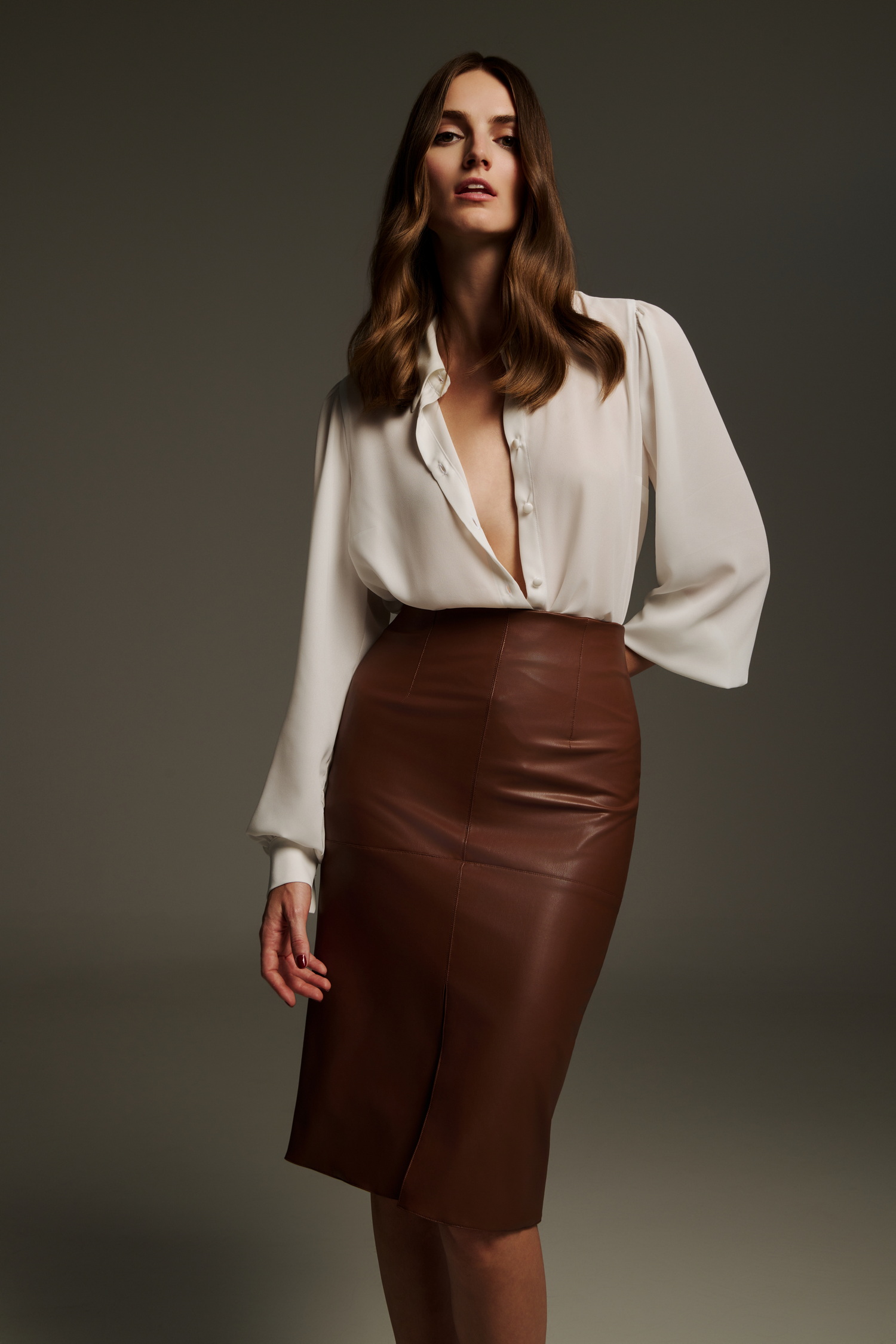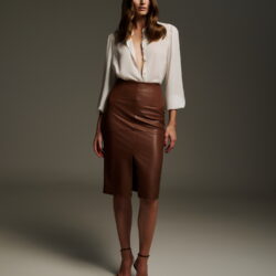 Ψηλόμεση pencil φούστα από δερματίνη,με μήκος μέχρι το γόνατο και στενή εφαρμογή που αναδεικνύει τη σιλουέτα. Το σχέδιο είναι μίνιμαλ και καθαρό, με clean cut γραμμές και διακριτική ραφή στο πίσω μέρος για άνεση.