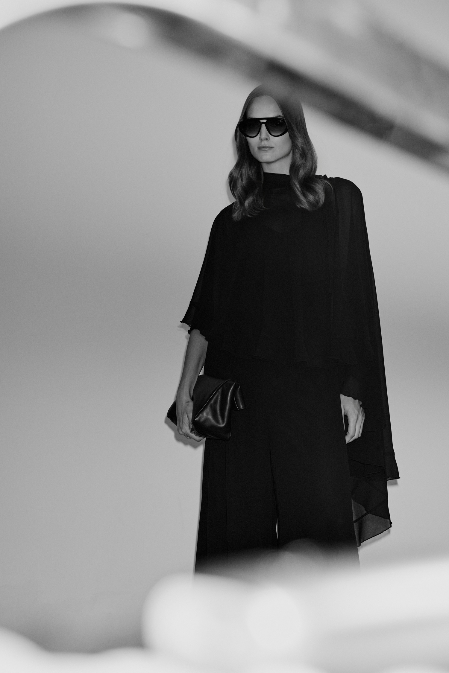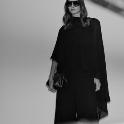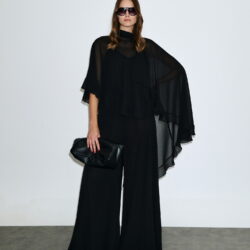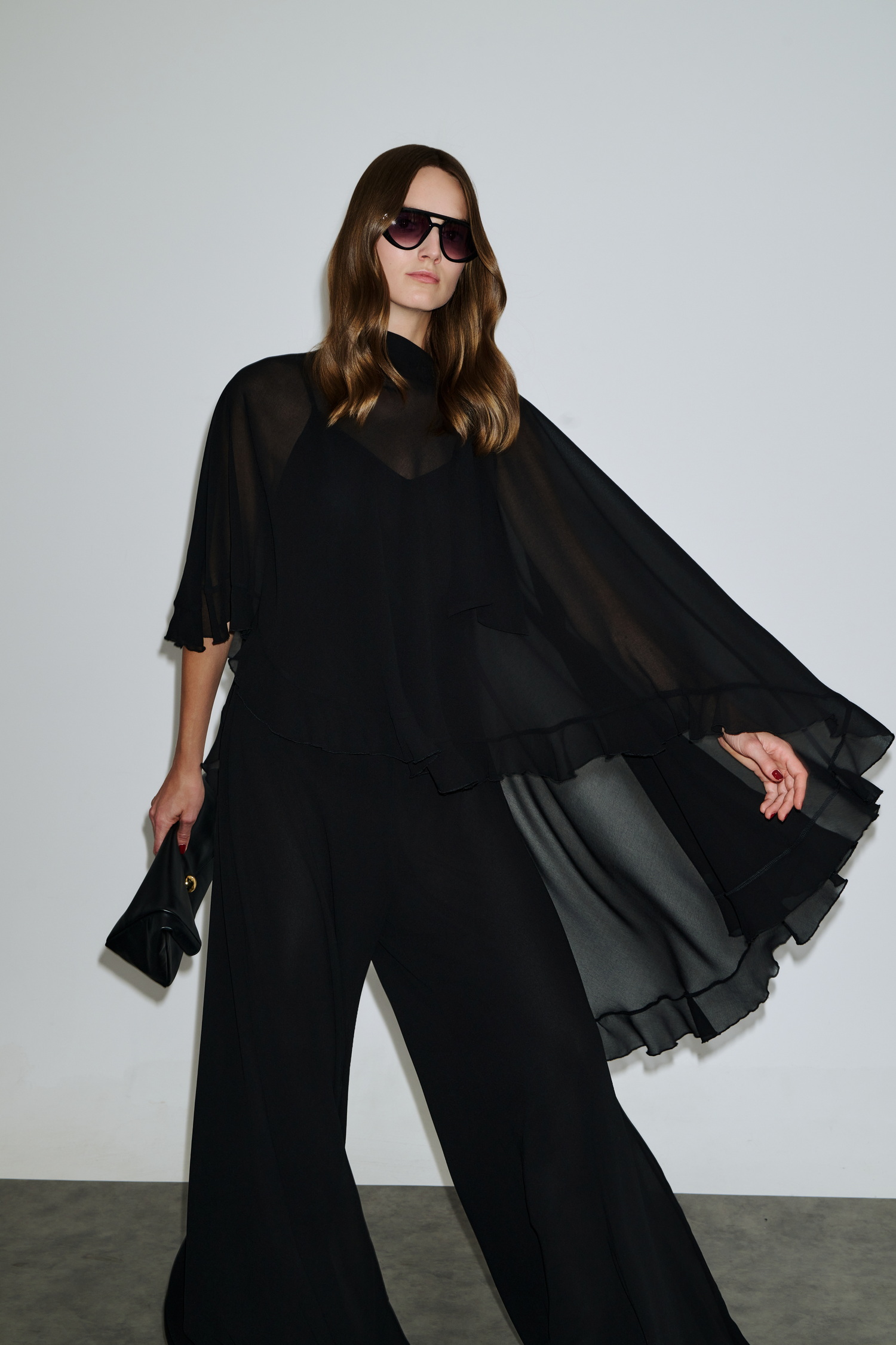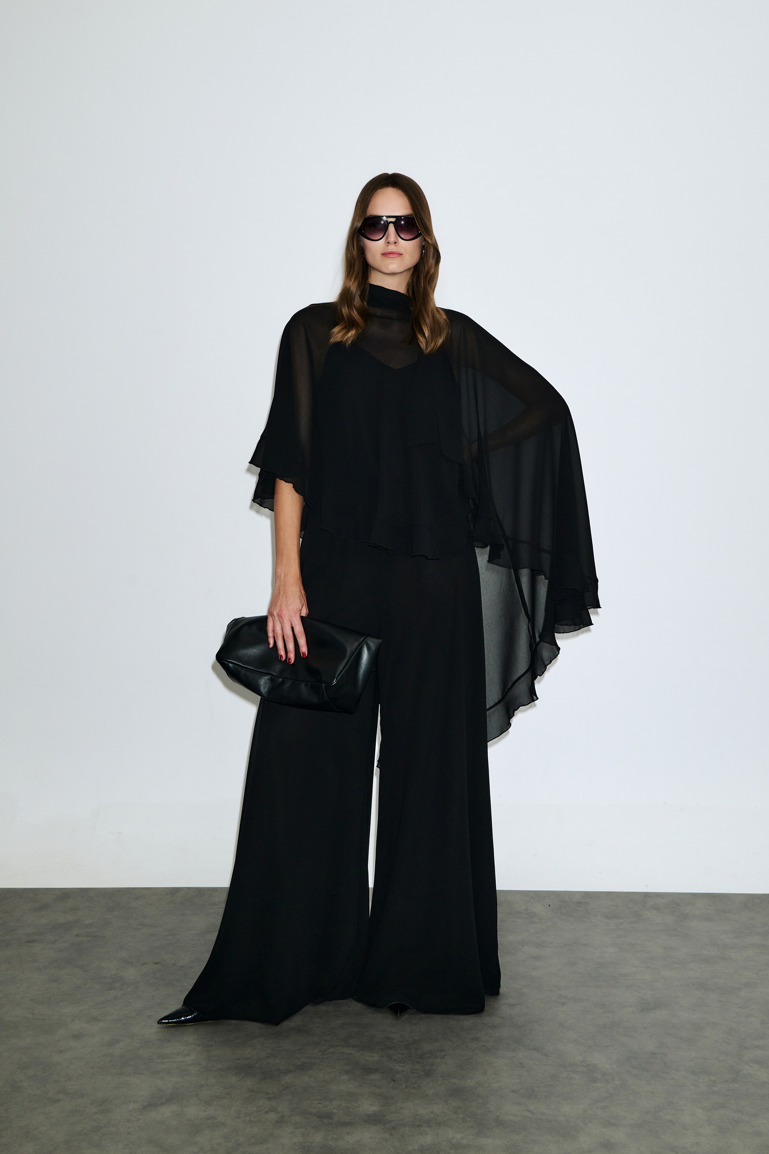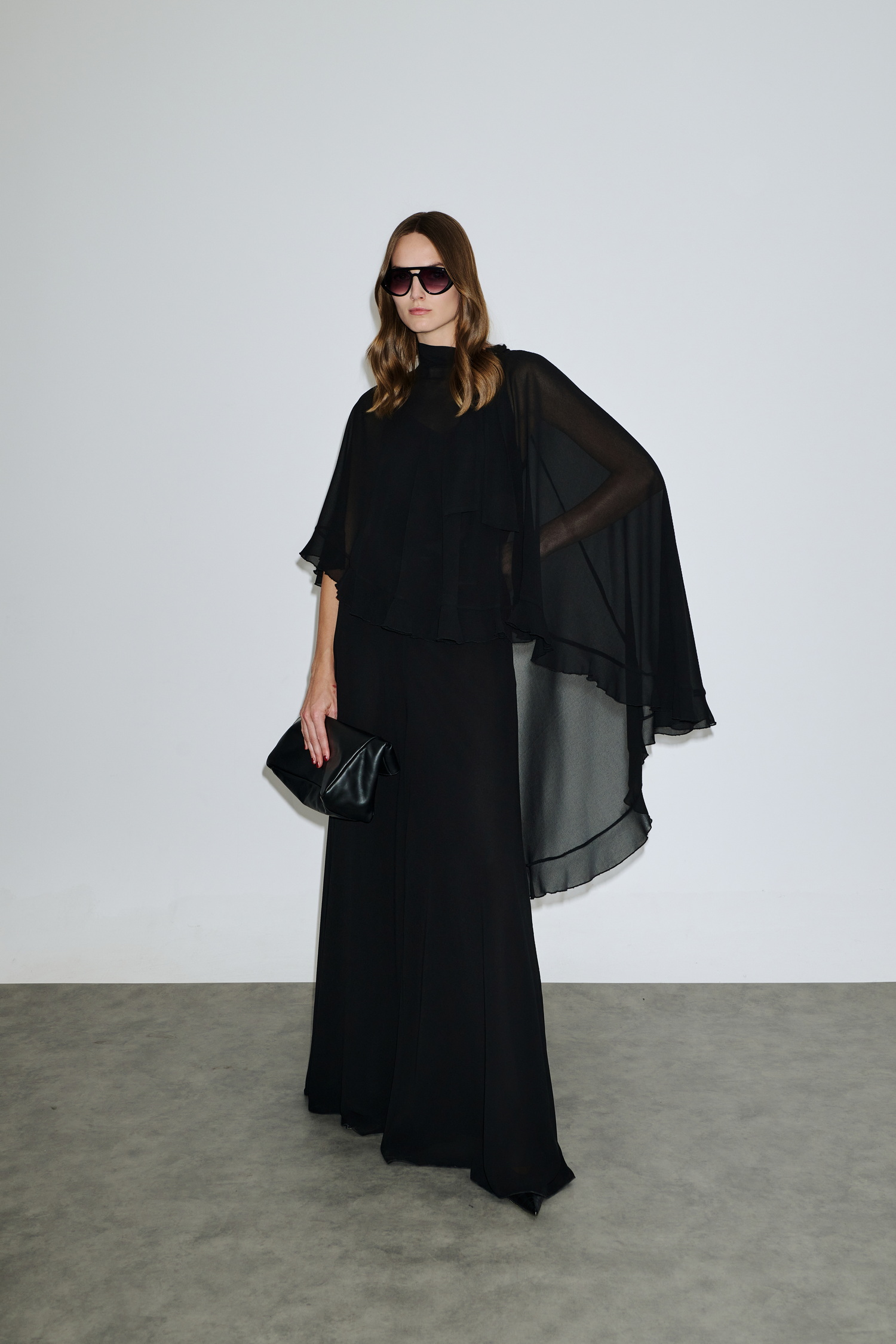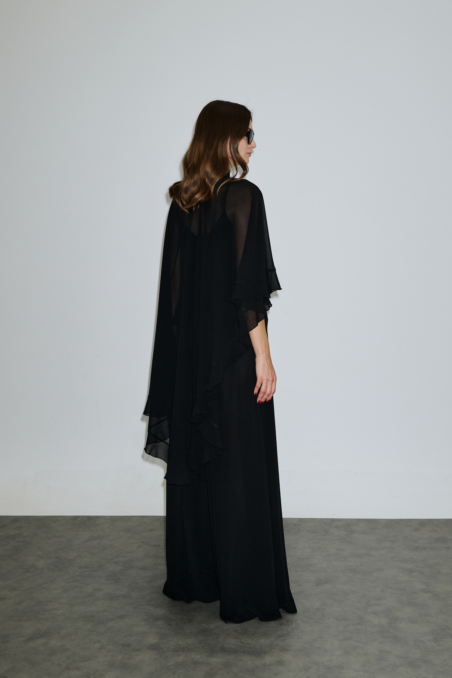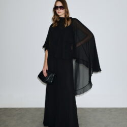 Ασύμμετρο cape από ελαφρύ σιφόν, είναι διπλό, ντραπέ και πέφτει αέρινα στους ώμους, δημιουργώντας εντυπωσιακή κίνηση και elegance.