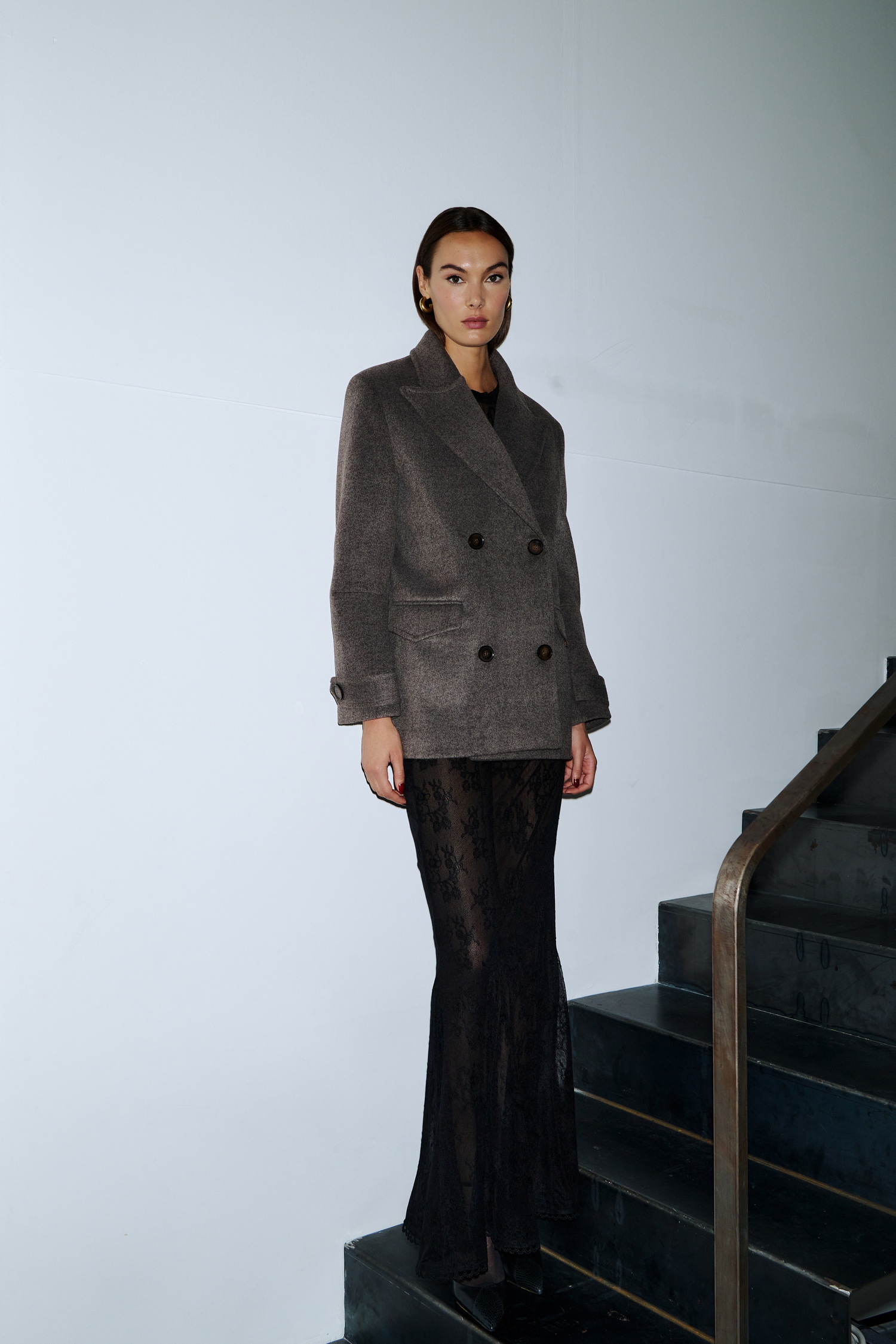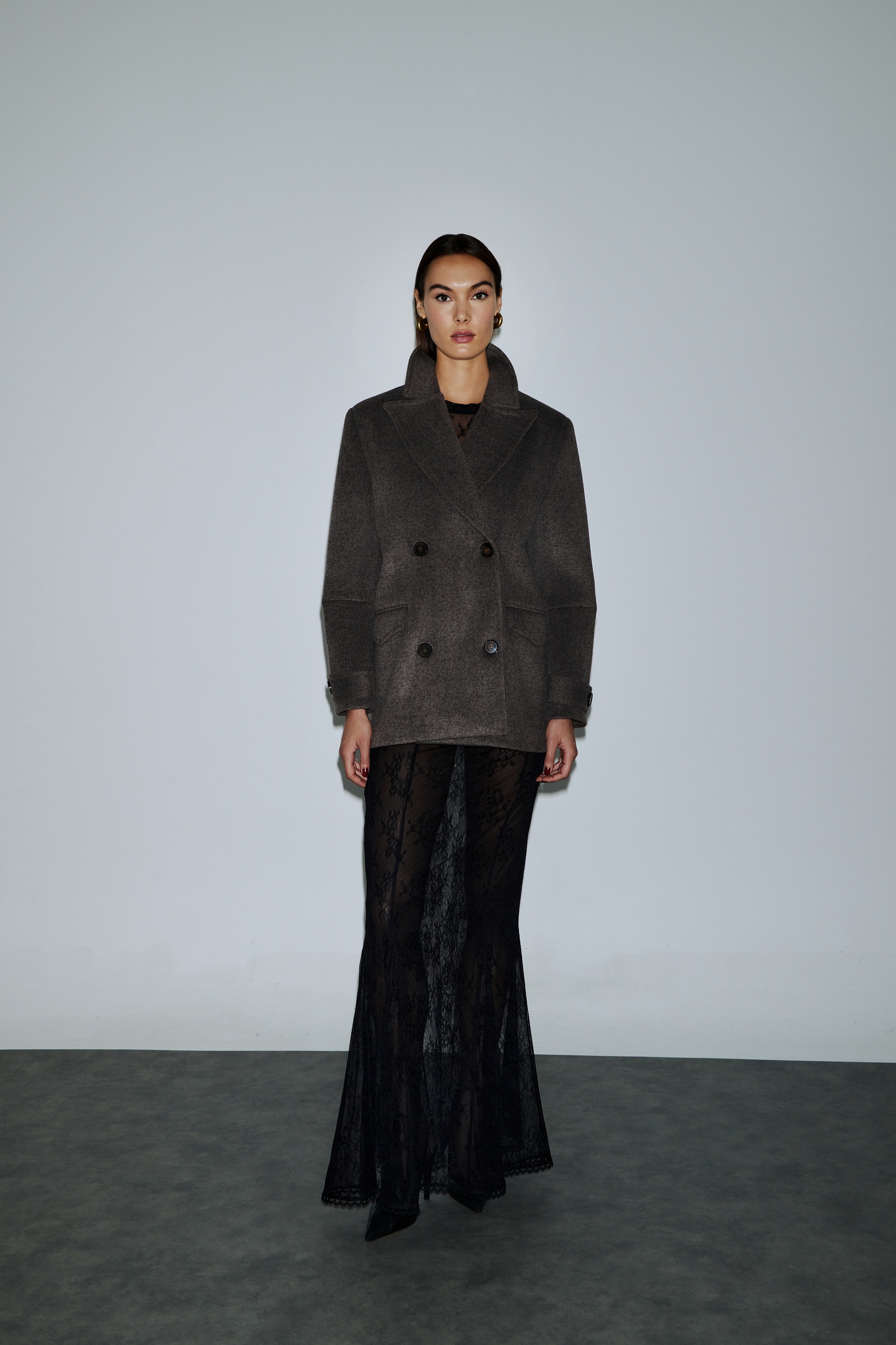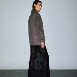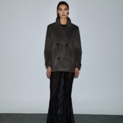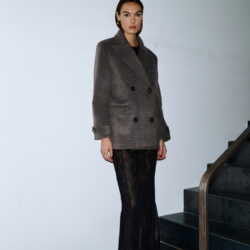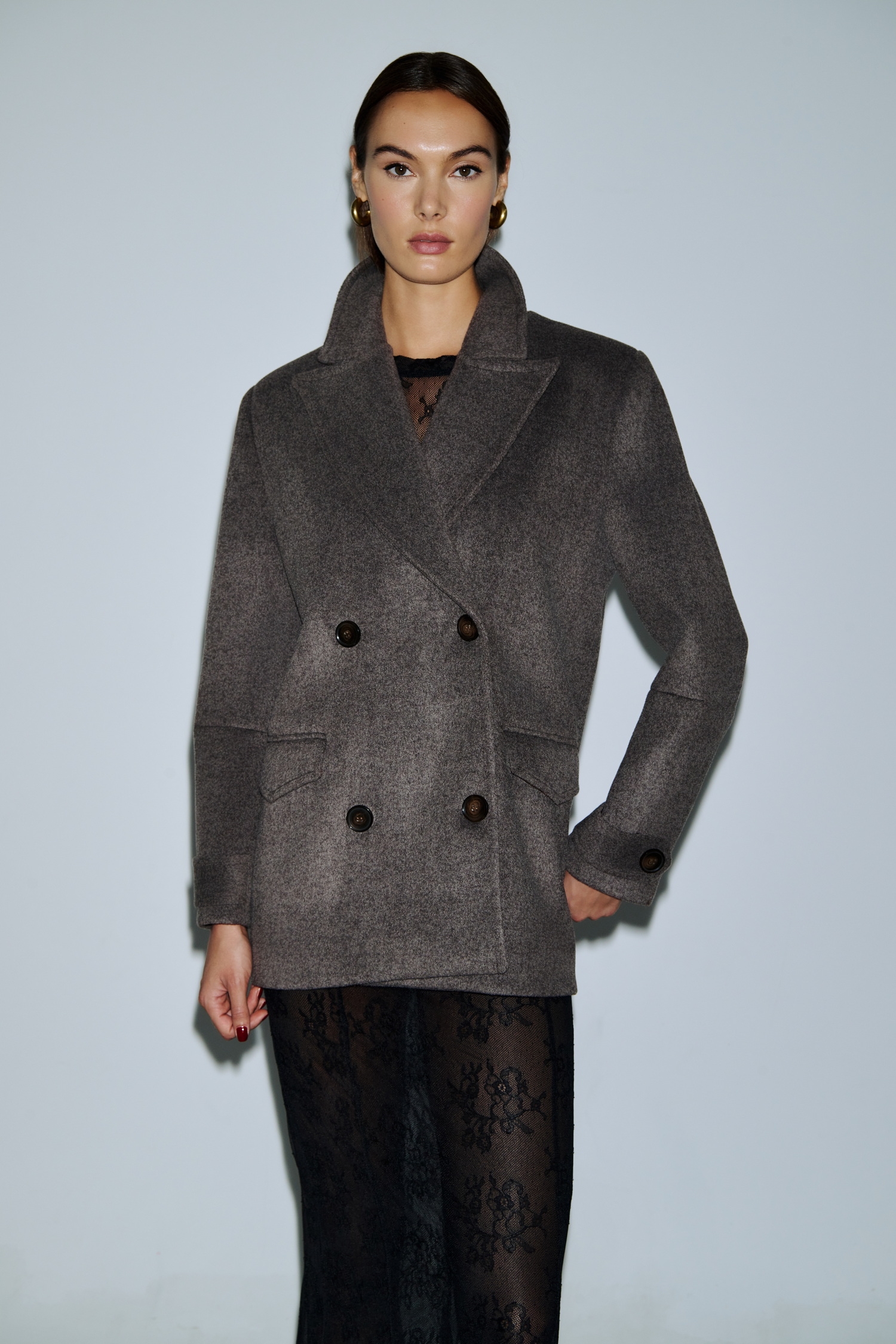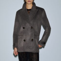 Κοντό παλτό τύπου boxy pea coat, διπλόκουμπο με φαρδύ ανδρικό πέτο. Το μάλλινο ύφασμα προσφέρει σταθερή δομή και κομψή γραμμή. Οι τσέπες με καπάκι, τα μεγάλα κουμπιά, και οι λεπτομέρειες στα μανίκια αποπνέουν διαχρονικό χαρακτήρα. Φοριέται πάνω από δαντελένιο μαύρο φόρεμα για έξτρα layering ή και με tailored σύνολα για office chic.