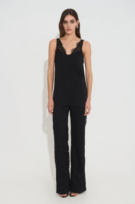 Διαφανές μαύρο τοπ από δαντέλα με λεπτές τιράντες και δαντελένιο τελείωμα στο ντεκολτέ, σε lingerie αισθητική για sexy chic αποτέλεσμα. Ιδανικό για layering αλλά και για να φορεθεί μόνο του με bralette για πιο εντυπωσιακές εμφανίσεις .