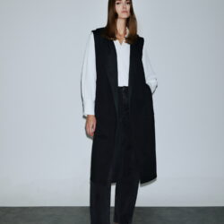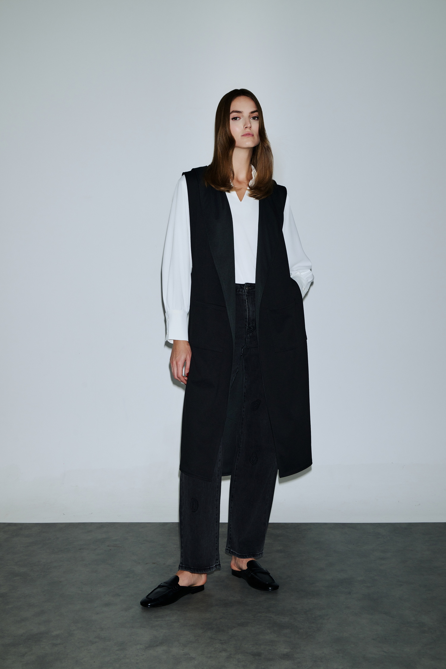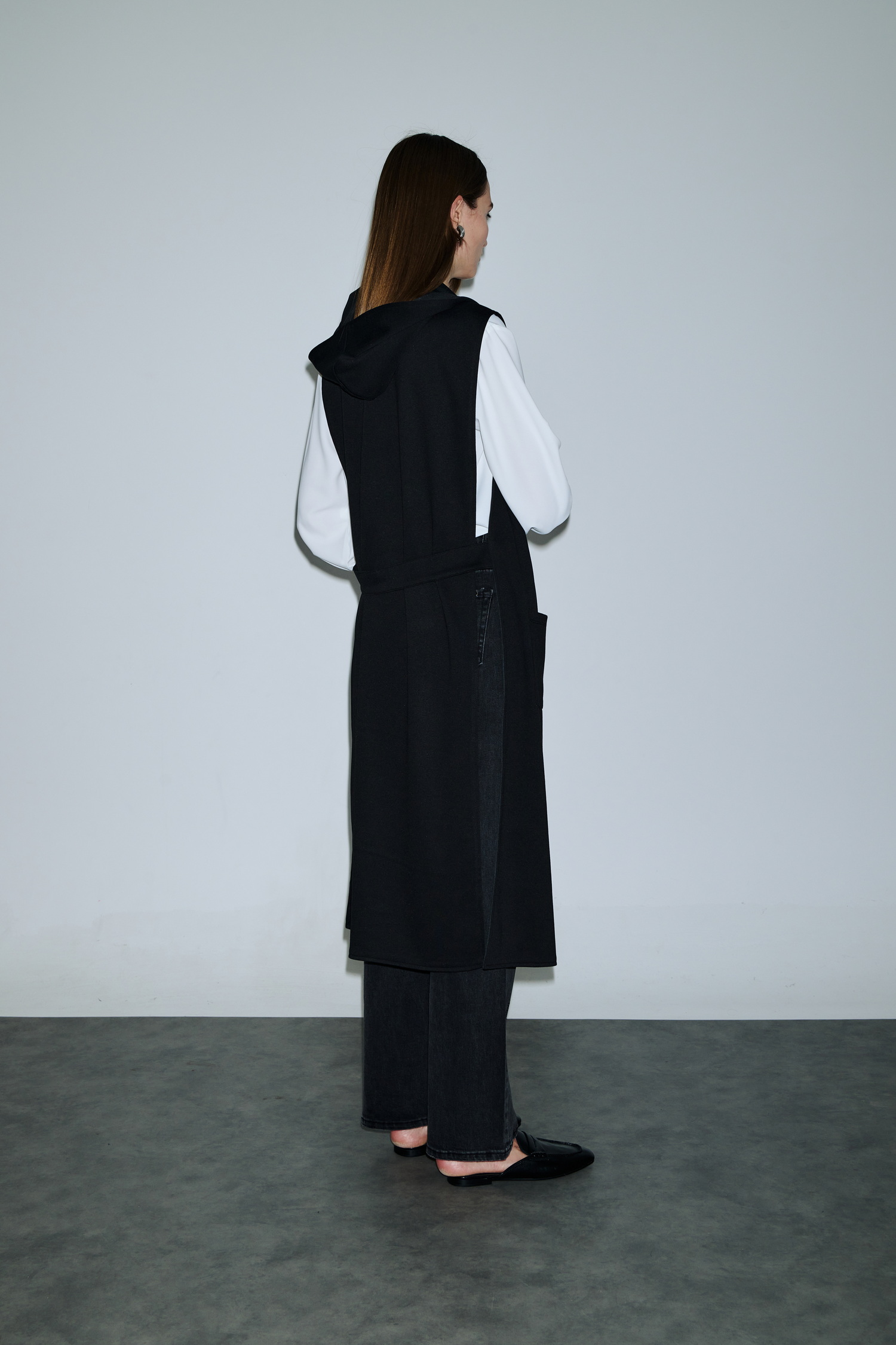 Μακρύ αμάνικο ανοιχτό γιλέκο με κουκούλα, μπροστινές μεγάλες τσέπες και χαλαρή ίσια γραμμή, ιδανικό για layering πάνω από πουκάμισα και jeans. Το πίσω μέρος αναδεικνύει το πρακτικό ύφος του, ενώ η κουκούλα προσδίδει μοντέρνα urban αισθητική. Η μέση αφήνεται ελεύθερη χωρίς ζώνη, προσφέροντας άνεση και ευκολία στις κινήσεις.