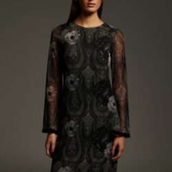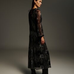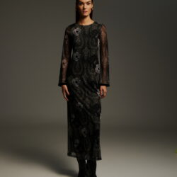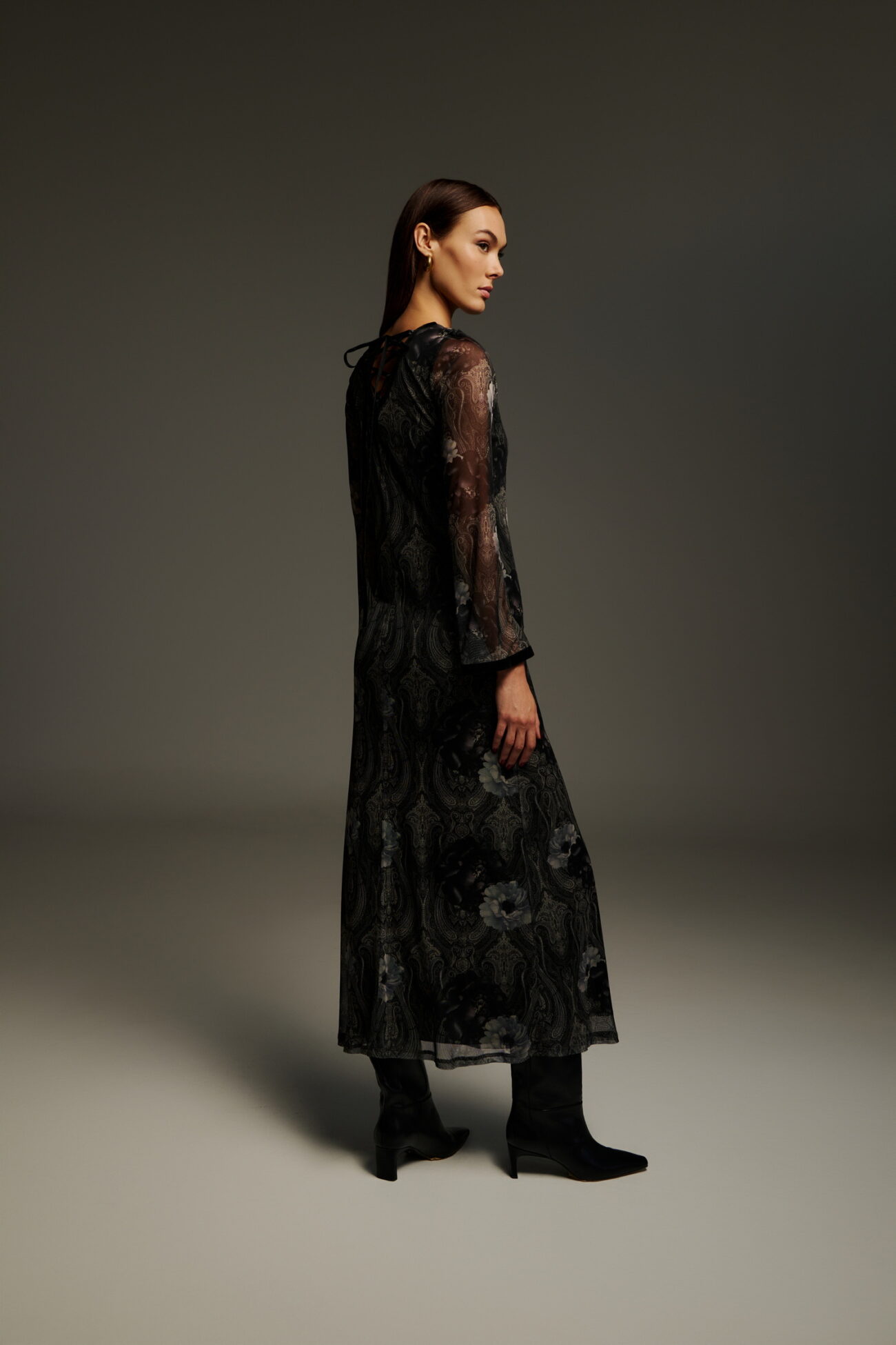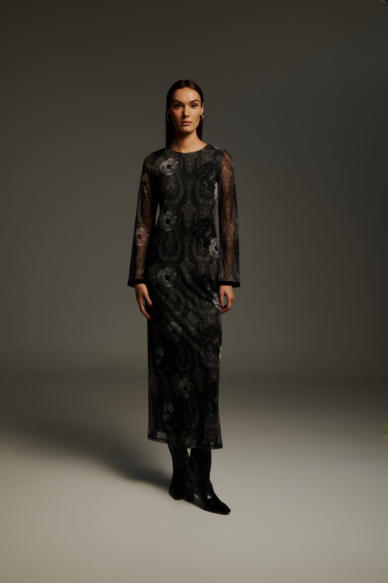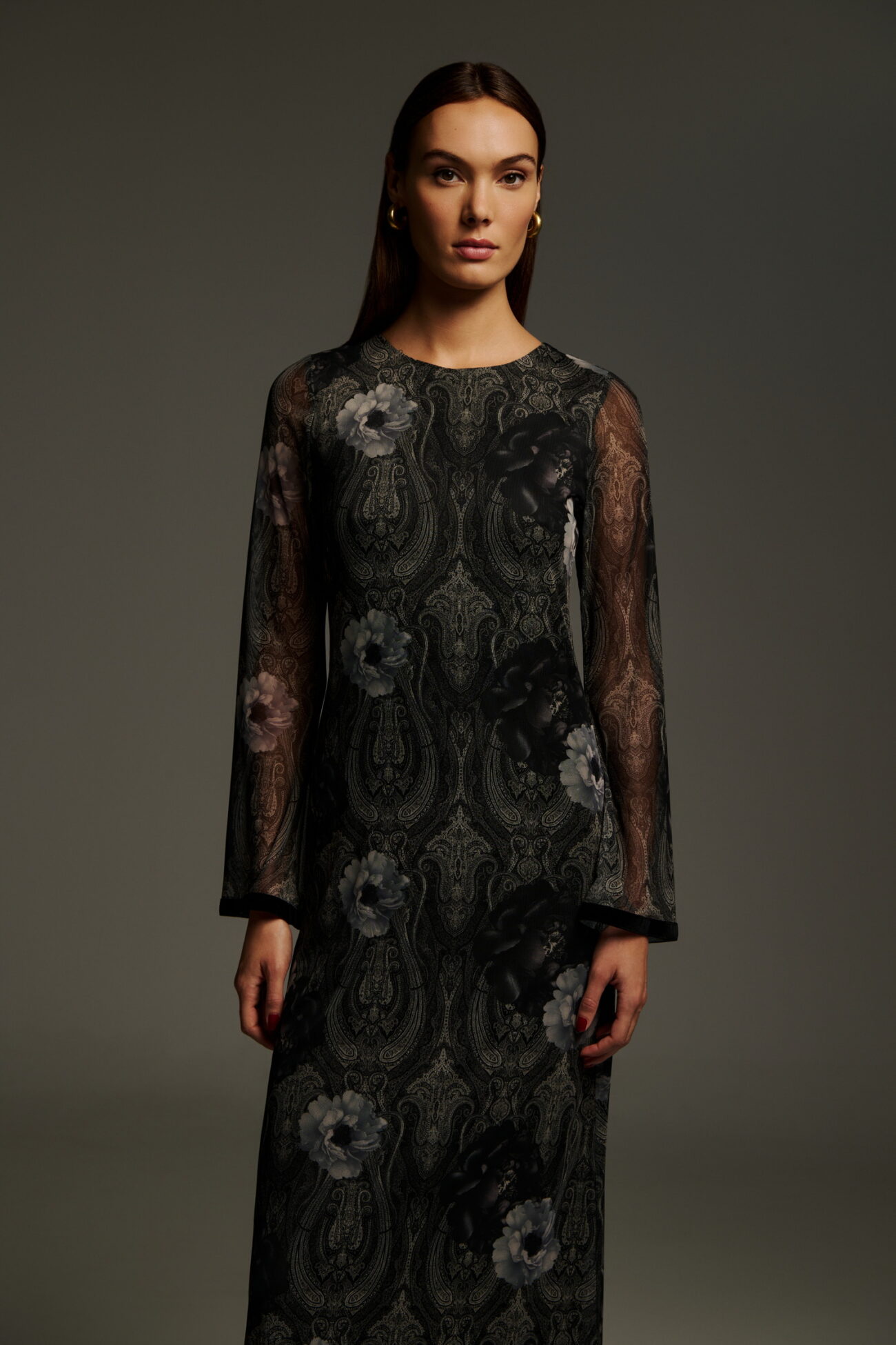 Maxi φόρεμα mesh σε γραμμή Α, με στρογγυλή λαιμόκοψη και μακριά ίσια μανίκια, σε μαύρη βάση με intricate paisley μοτίβα και διακριτικό floral all-over pattern σε γκρι, λιλά και off-white αποχρώσεις. Το ημιδιάφανο ύφασμα αγκαλιάζει την σιλουέτα χωρίς να την τονίζει, χαρίζοντας διακριτική bohemian chic πολυτέλεια. Το μήκος του αγγίζει τον αστράγαλο και συνδυάζεται μοναδικά με western ankle boots για ιδιαίτερο χαρακτήρα, αλλά και minimal κοσμήματα, διατηρώντας διακριτικότητα και κομψότητα.