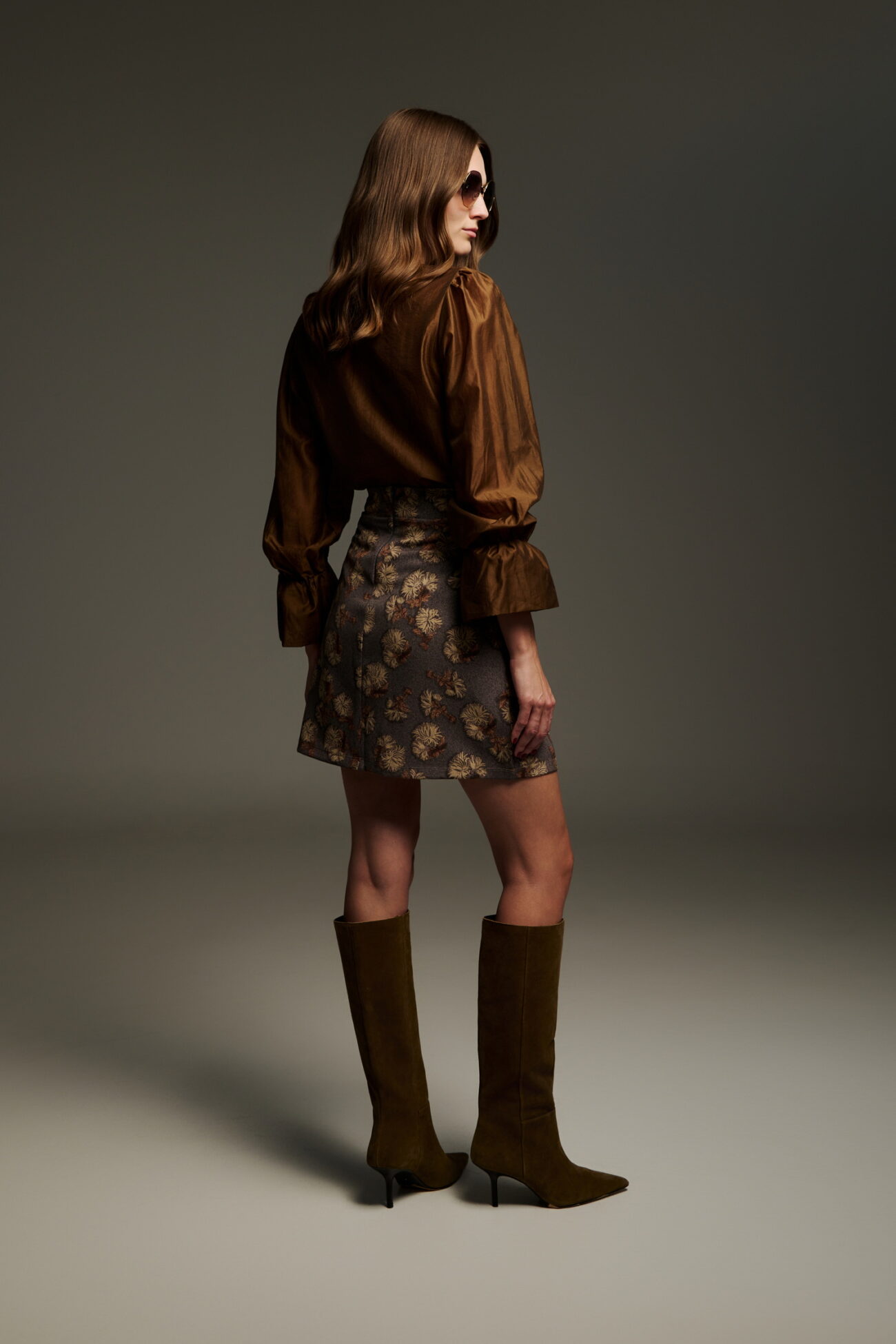Μίνι φούστα Α-γραμμής σε jacquard ύφασμα με floral μοτίβο σε μπρονζέ, χρυσό και καφέ. Ψηλόμεση, με σταθερό ύφασμα που “στέκεται”, αγκαλιάζοντας κομψά τη μέση και τα πόδια. Μοντέρνος, διαχρονικός χαρακτήρας για city ή βραδινές εμφανίσεις.