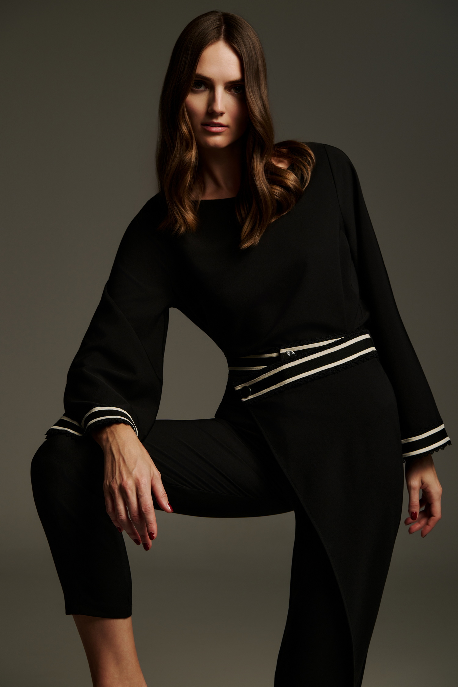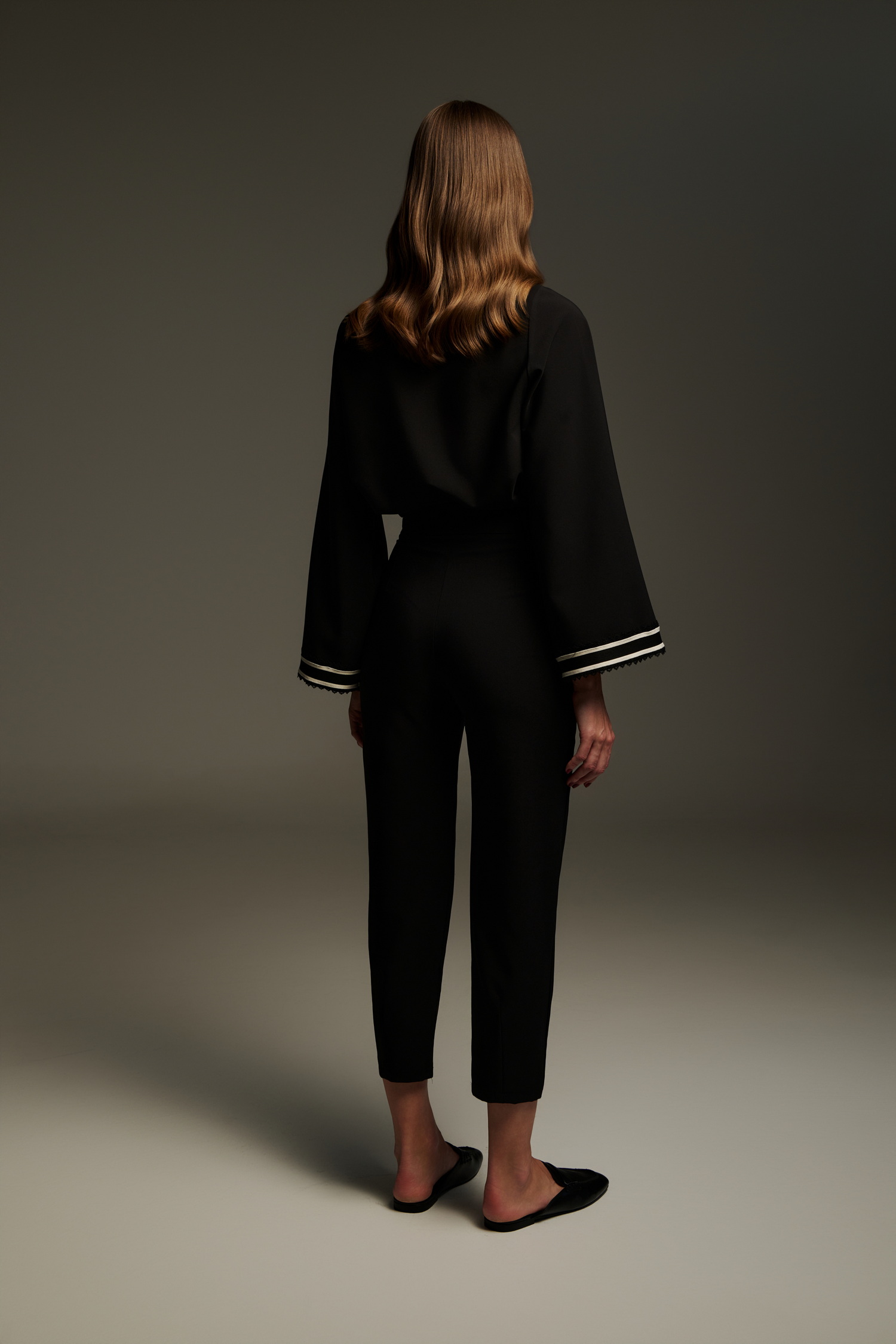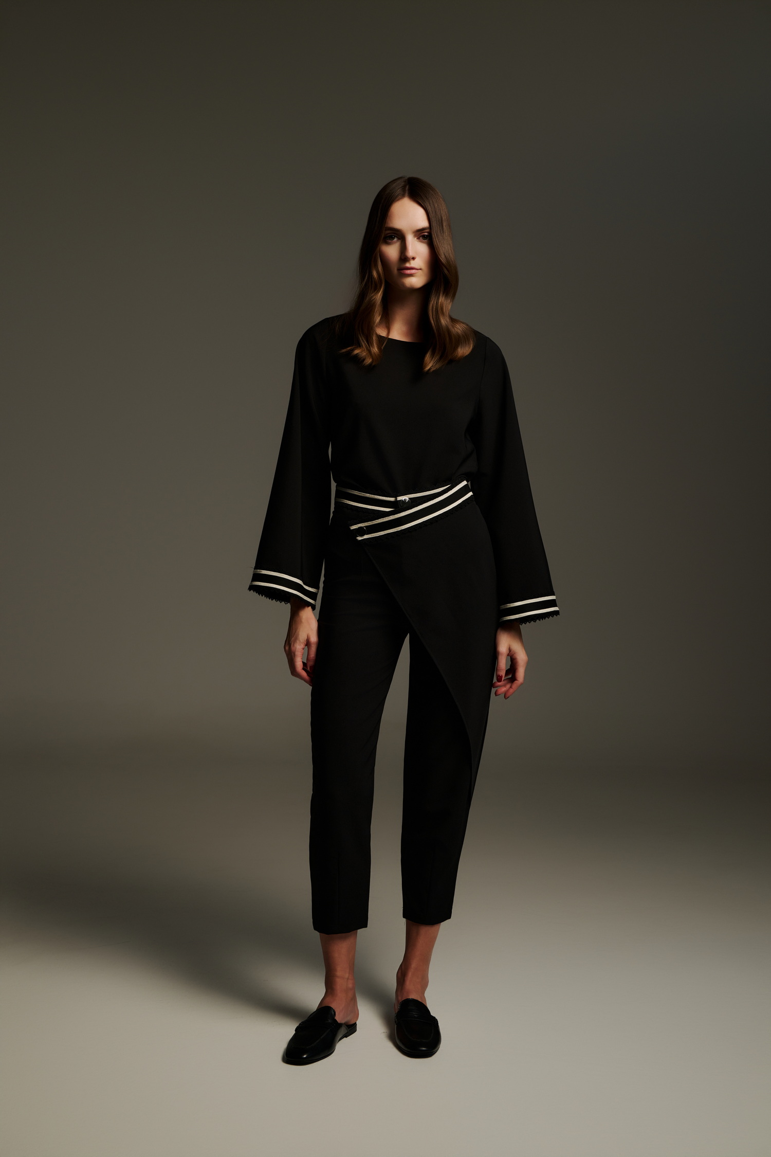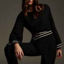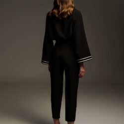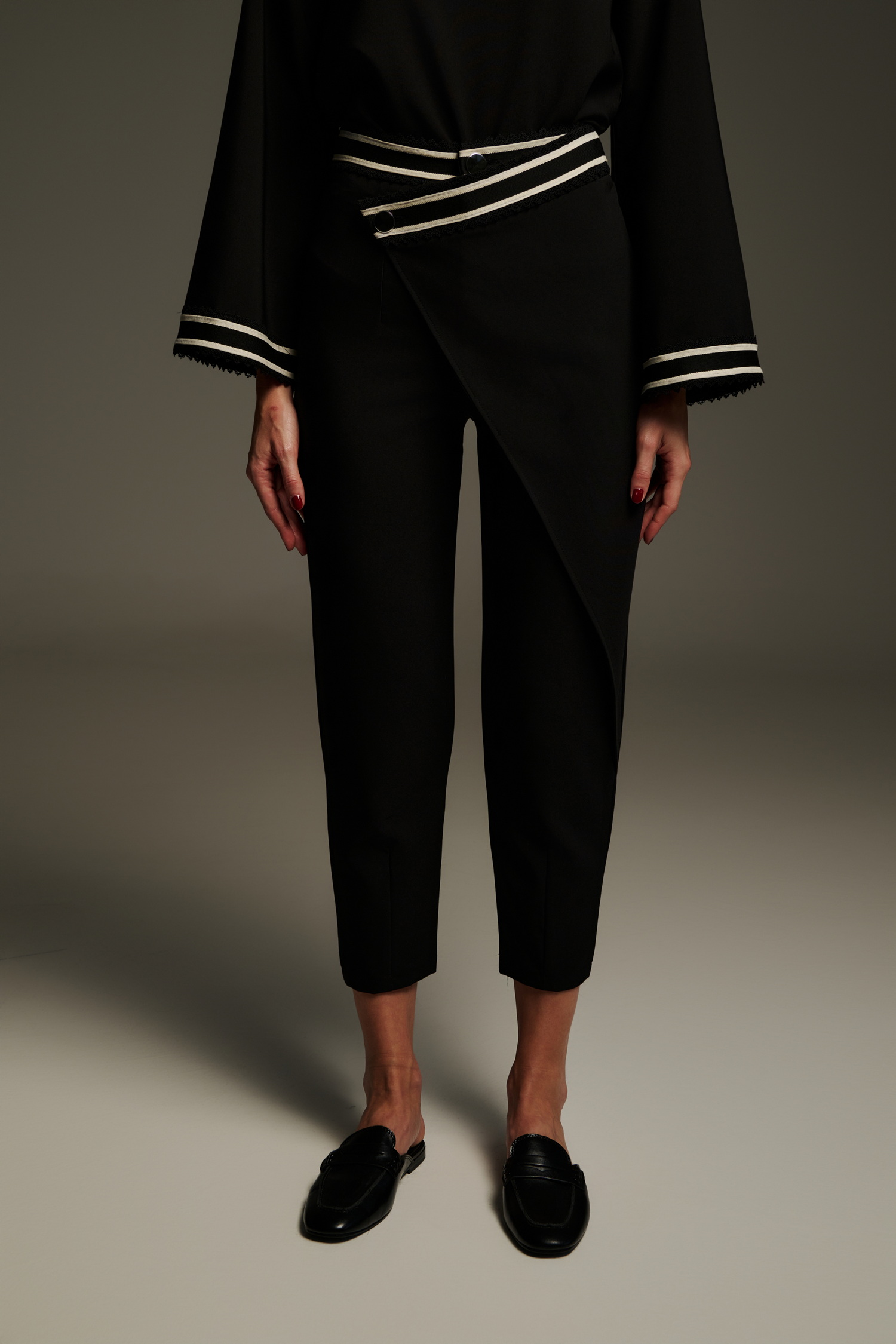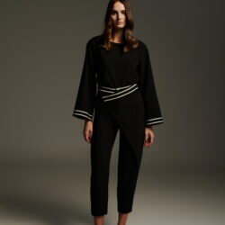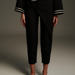 Ψηλόμεσο μαύρο cropped παντελόνι με ασύμμετρη πατιλέτα και διακοσμητική εκρού τρέσα στη μέση. Το σχέδιο χαρακτηρίζεται από το ιδιαίτερο overlap μπροστινό τελείωμα που δίνει την αίσθηση φούστας-παντελονιού, αλλά με απόλυτα modern αισθητική. Το ύφασμα είναι σταθερό, το μήκος φτάνει στον αστράγαλο και ολοκληρώνεται κομψά με loafers, mules ή ψηλοτάκουνα για ένα updated office ή city look.