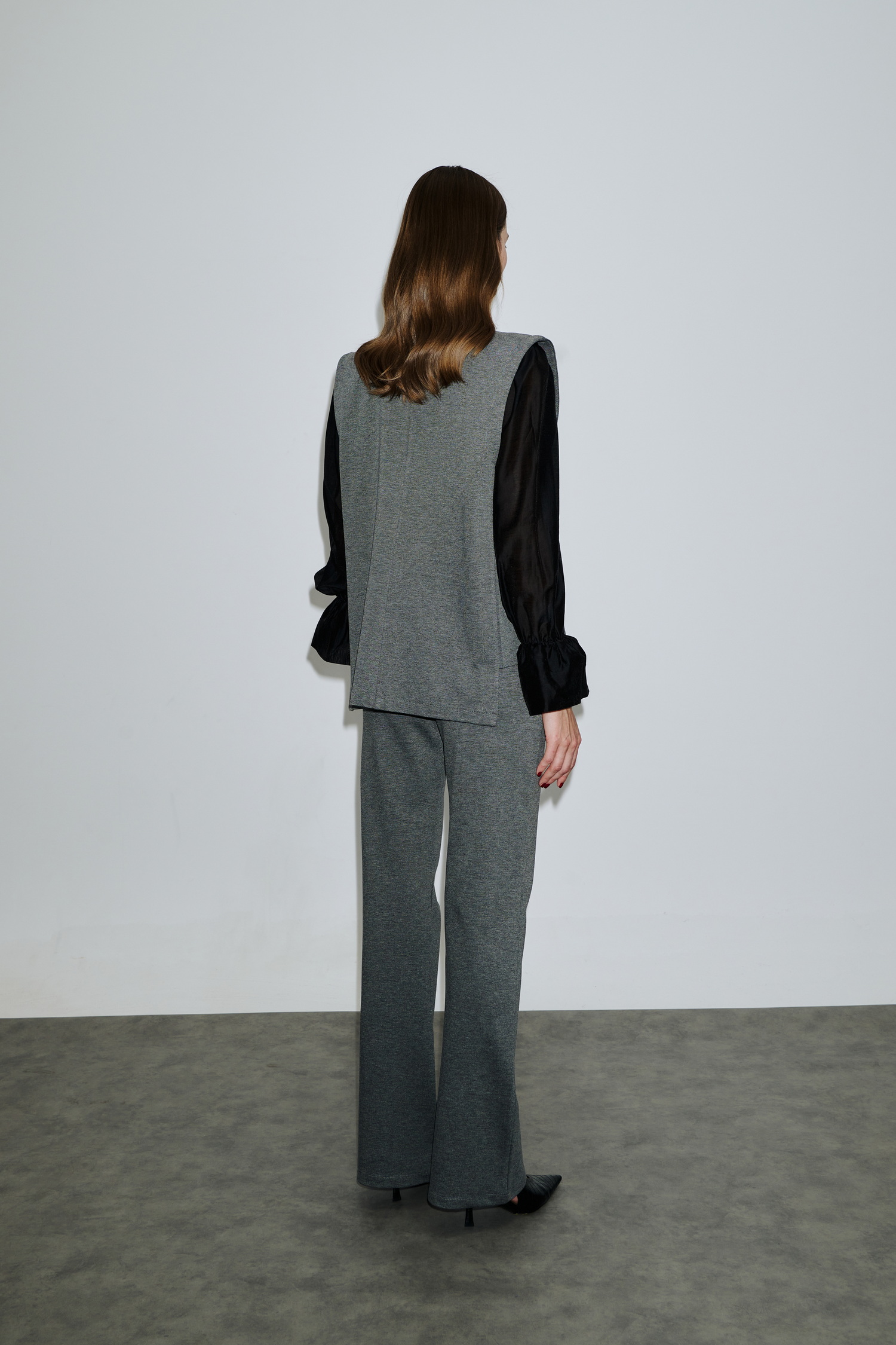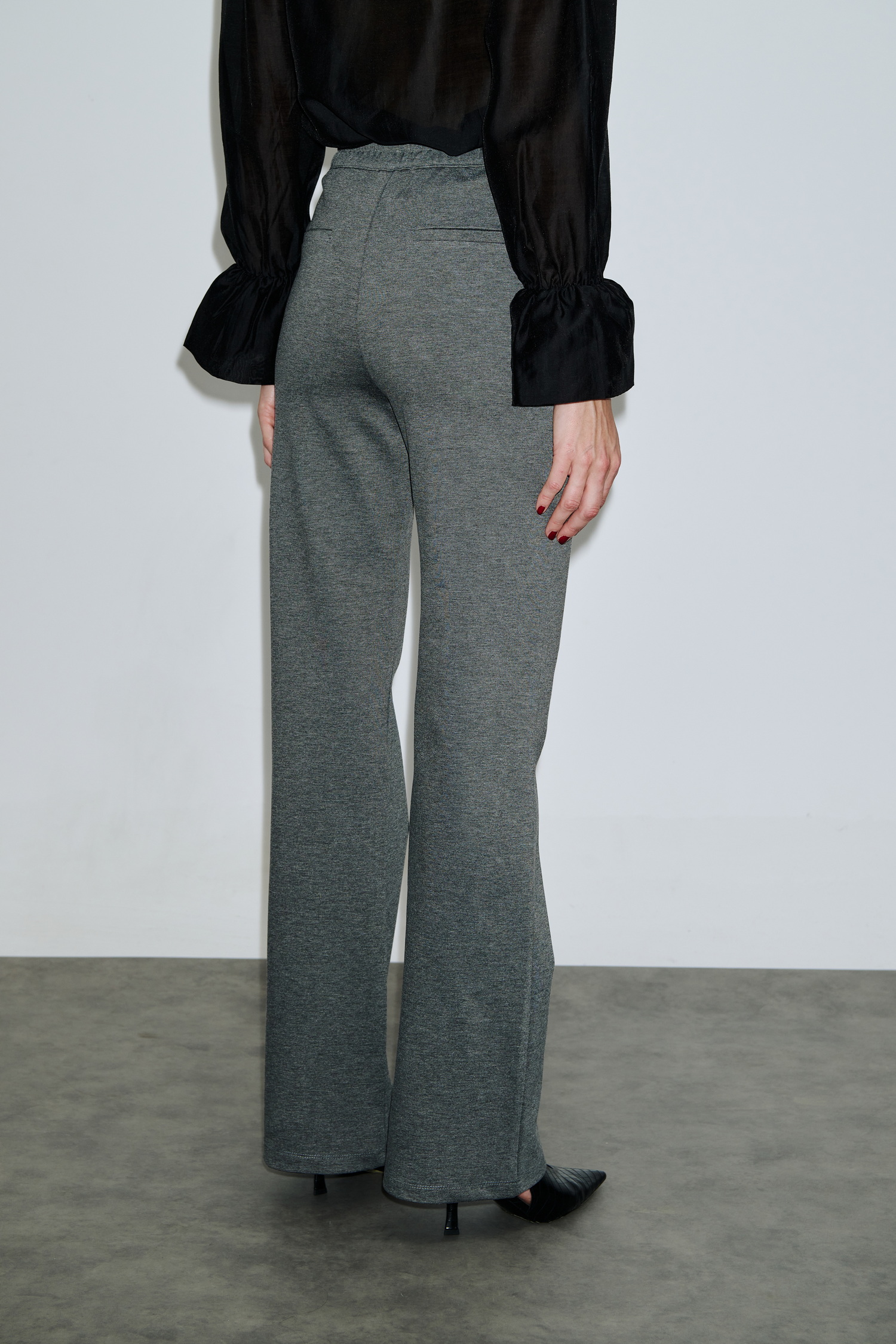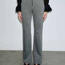 Ισιο ψηλόμεσο παντελόνι με λάστιχο και φερμουάρ στη μέση, από ελαστικό ύφασμα με μαλακή υφή. Η ίσια γραμμή του δημιουργεί κομψό αποτέλεσμα που κολακεύει τη σιλουέτα, ενώ η απλότητα του το κάνει κατάλληλο για business ή casual looks. Συνδυάζεται ιδανικά με διαφανές μαύρο πουκάμισο για μοντέρνο layering.