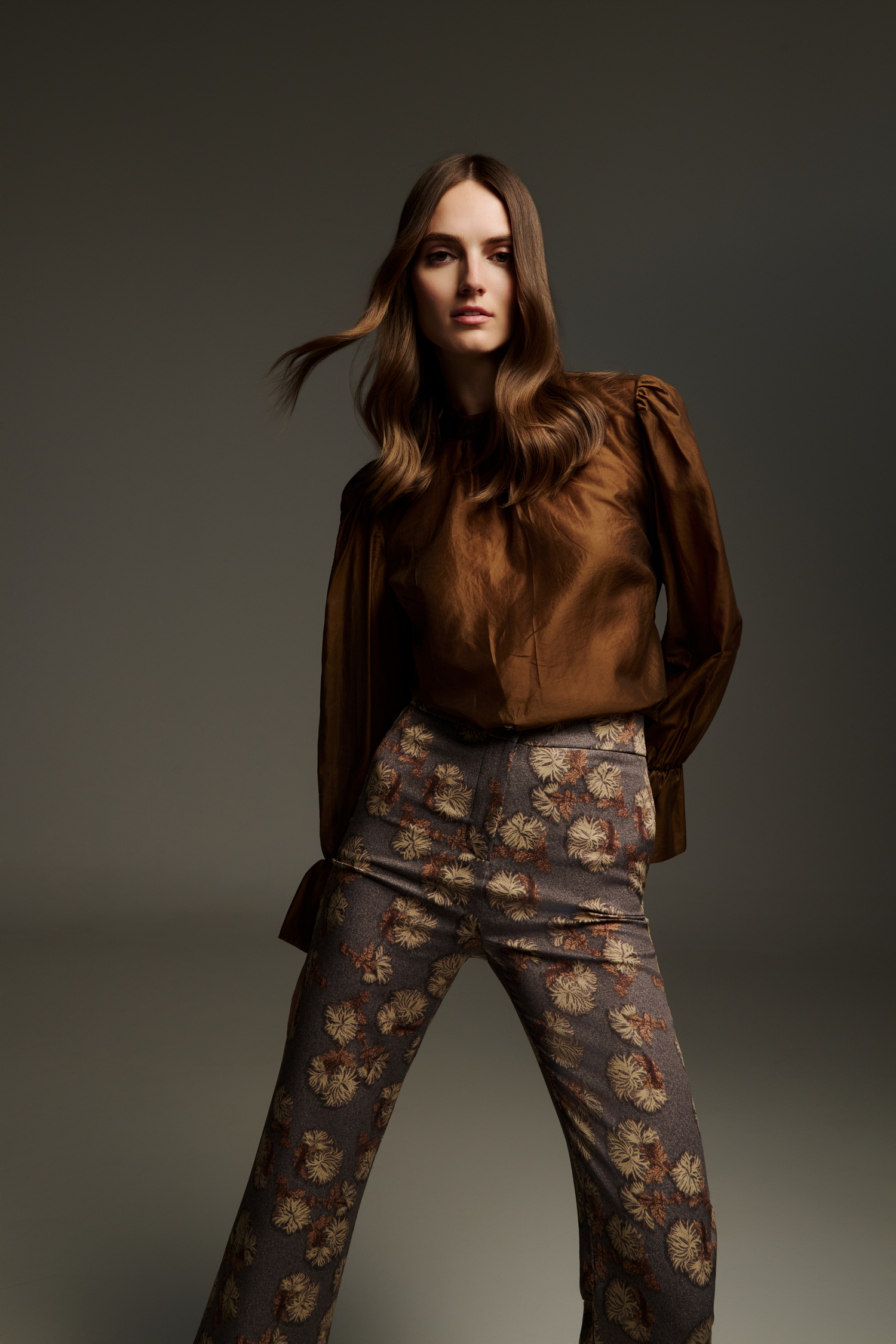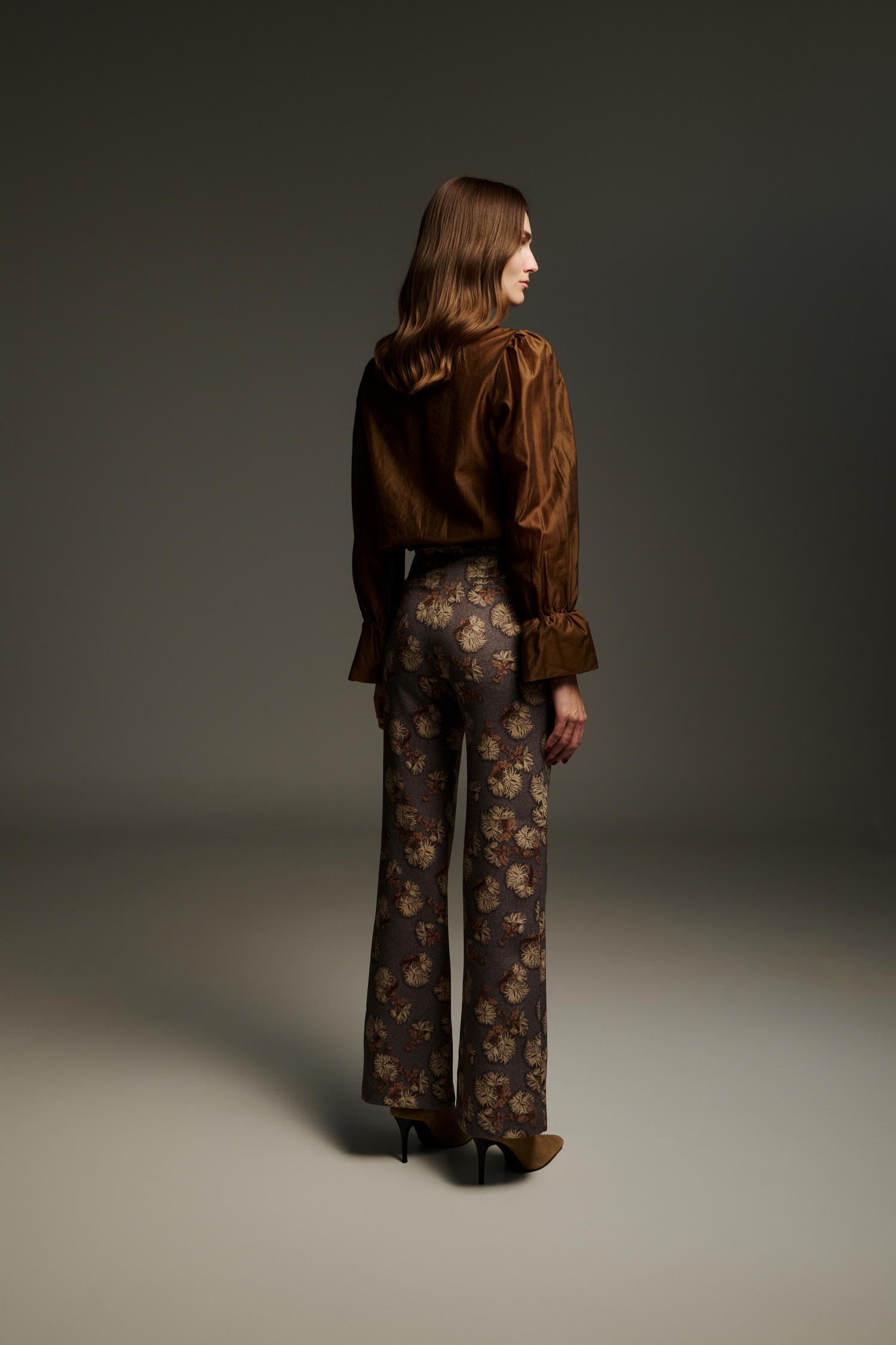 Ψηλόμεσο παντελόνι σε ίσια γραμμή και σοκολατί βάση, με ιδιαίτερο λουλουδάτο μοτίβο σε αποχρώσεις του χρυσού, μπρονζέ και καφέ. Το ύφασμα ξεχωρίζει για την πλούσια υφή του, συνδυάζοντας πολυτέλεια και boho-chic αισθητική.