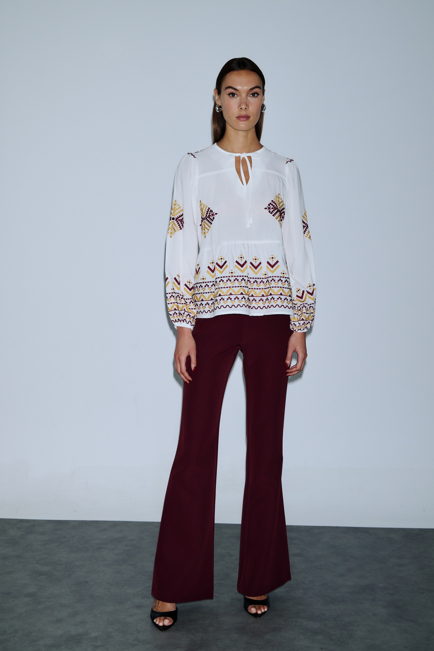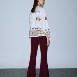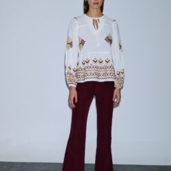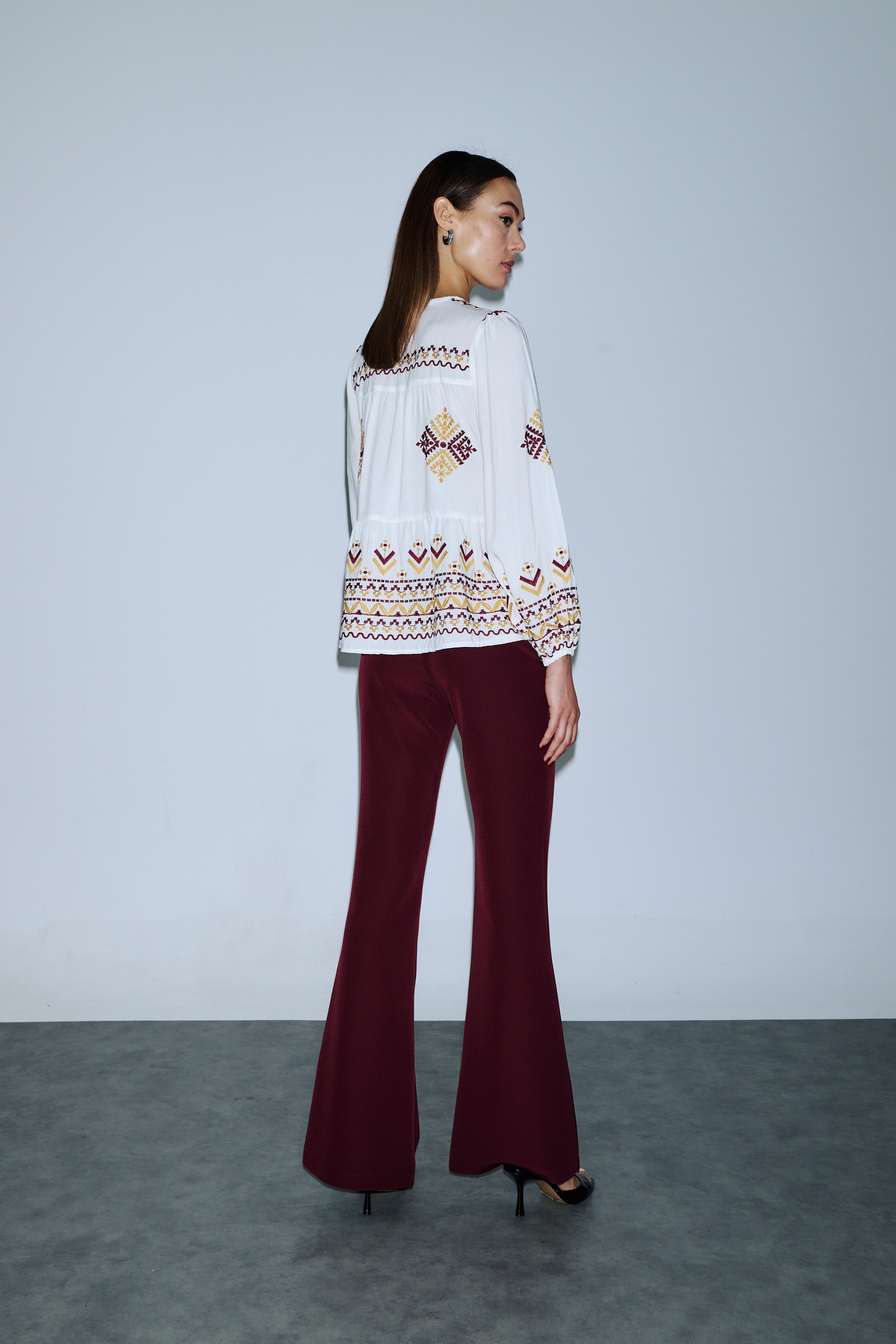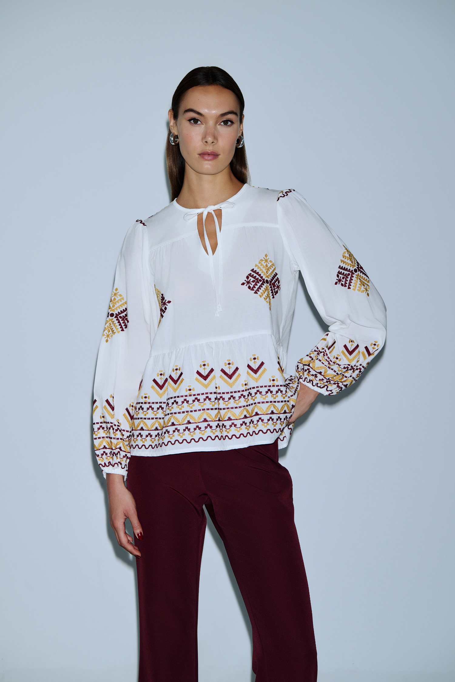 Λευκή μπλούζα με μποέμ-εθνοκεντημένα μοτίβα σε αποχρώσεις του μπορντώ και του χρυσού, με χαλαρό αέρινο ύφασμα και balloon μανίκια που καταλήγουν σε λάστιχο. Διαθέτει split ντεκολτέ με κορδονάκι και χυτό τελείωμα στο κάτω μέρος.