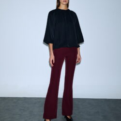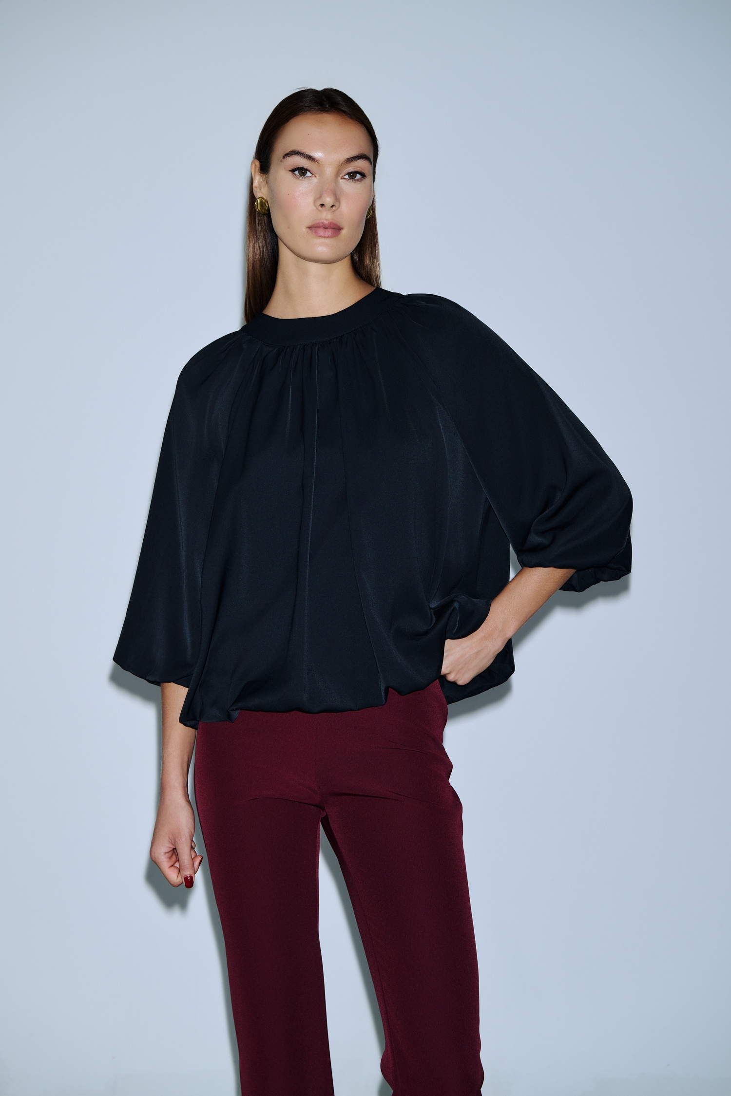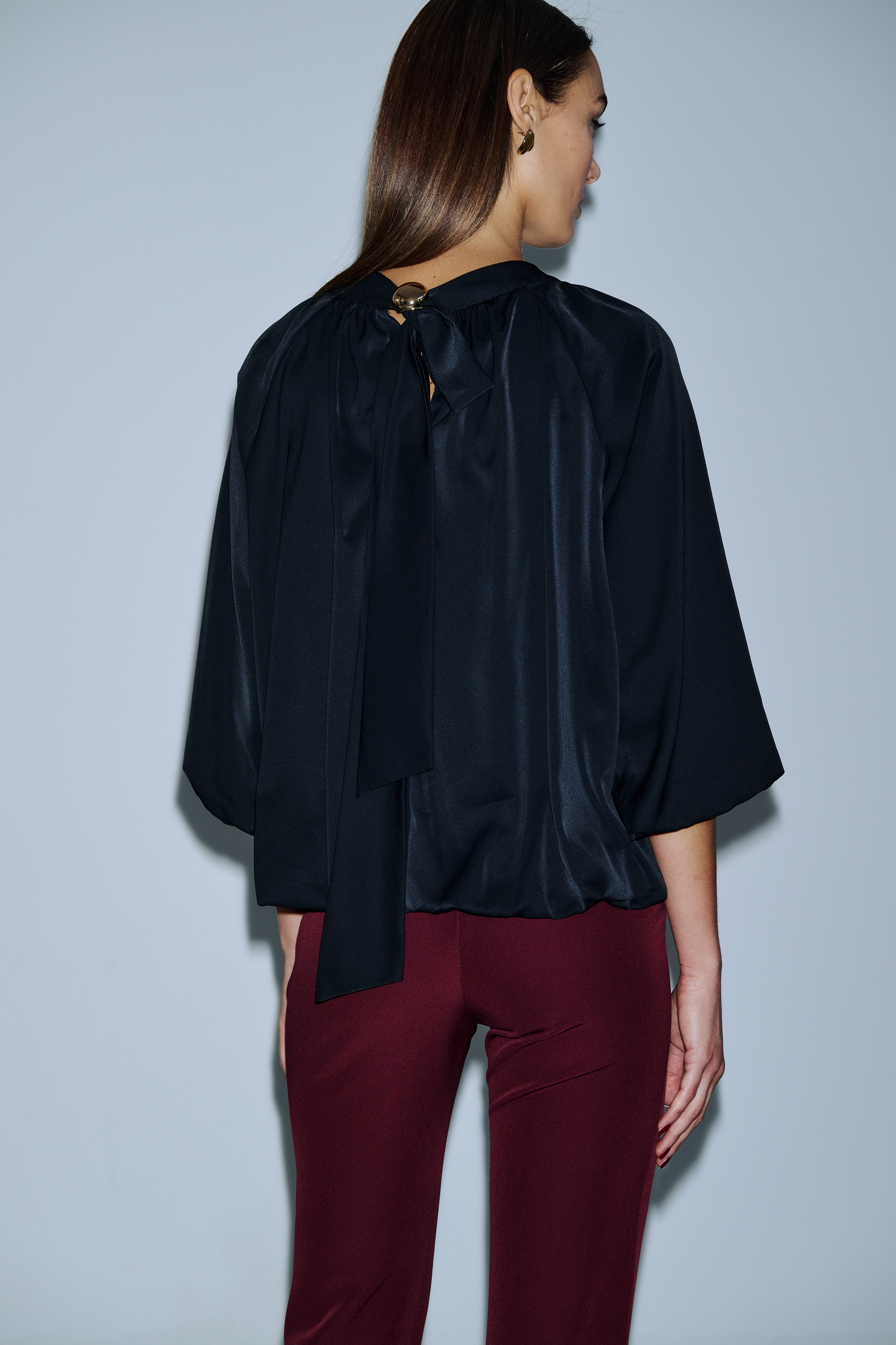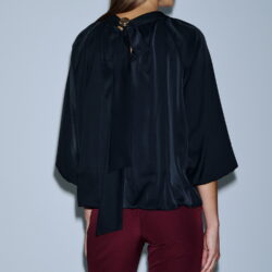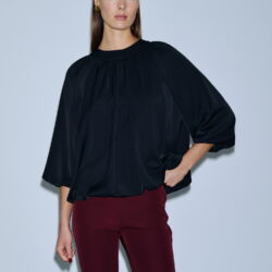 Τοπ με balloon μανίκια τριών τετάρτων, φαρδύ στρογγυλό λαιμό και φαρδύ, αέρινο κόψιμο. Διαθέτει σούρα στη λαιμόκοψη και τελείωμα, ενώ πίσω δένει με φιόγκο και χρυσή αγκράφα για επιπλέον κομψότητα. Το ύφασμα πέφτει ρευστά και προσδίδει elegant silhouette, κατάλληλο για επίσημες ή ιδιαίτερες εμφανίσεις.