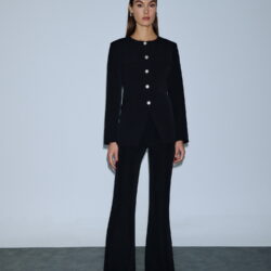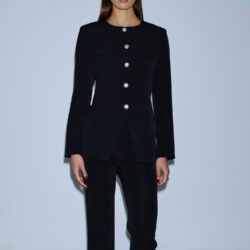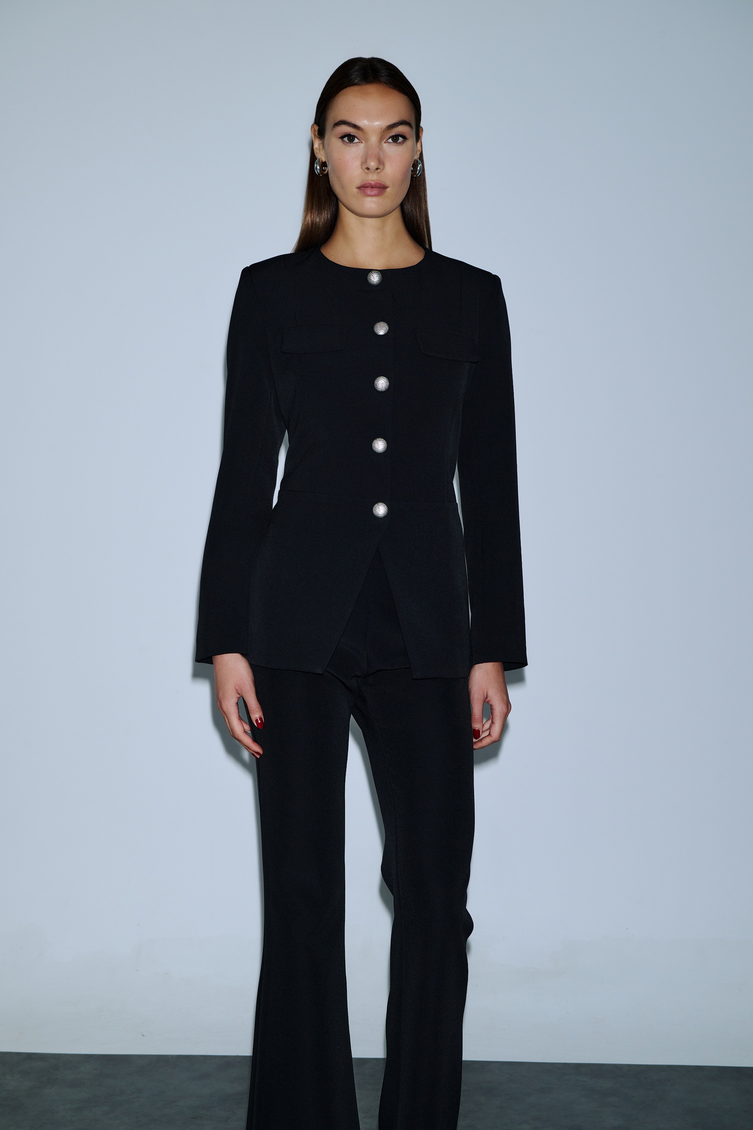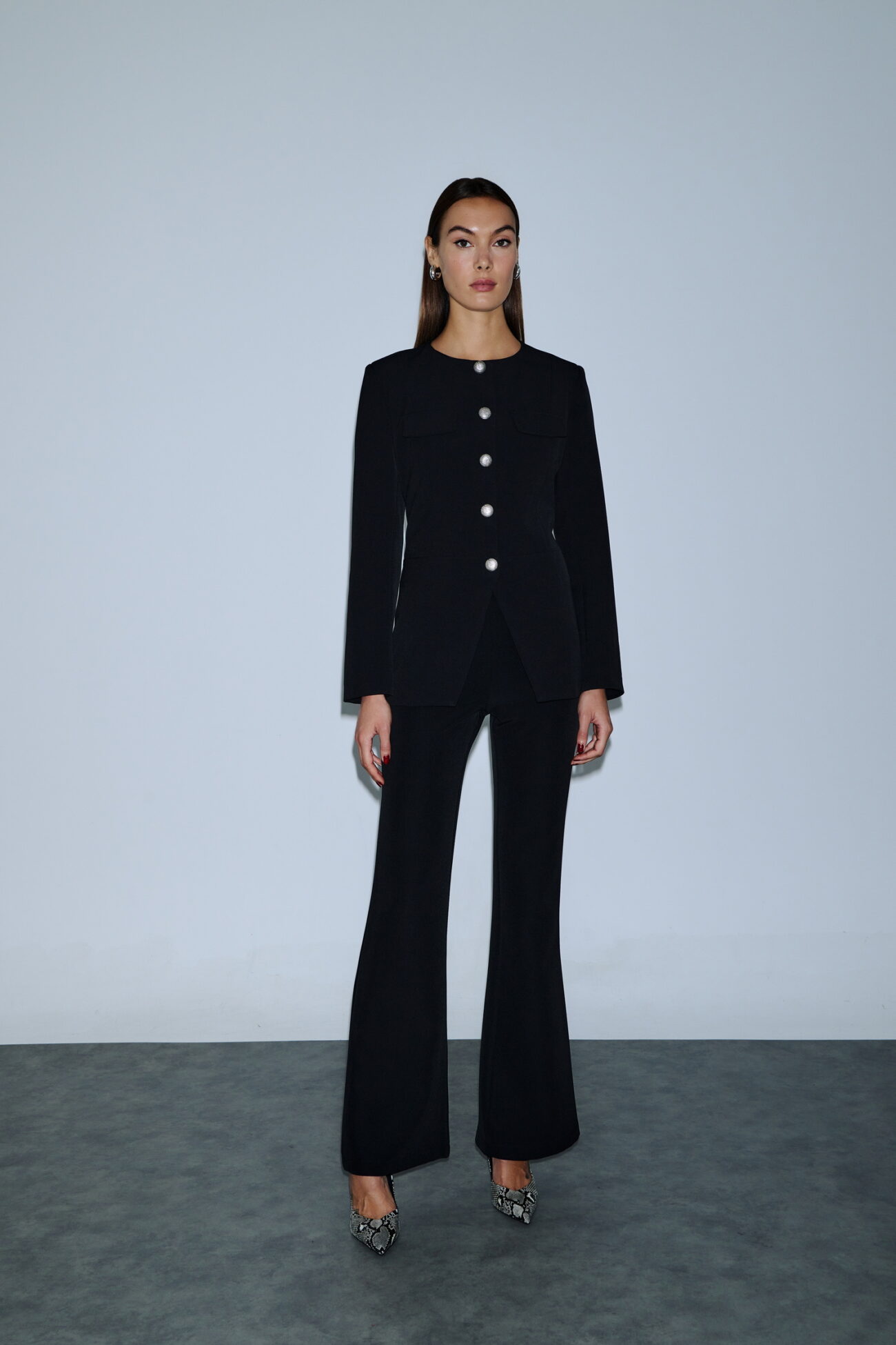 Tailored σακάκι με μεταλλικά κουμπιά και υψηλή λαιμόκοψη, σε στενή γραμμή με ιδιαίτερη λεπτομέρεια τσέπες στο στήθος. Το σακάκι κλείνει μπροστά με μεγάλες φινετσάτες πέρλες-κουμπιά και χαρίζει elegant, σοφιστικέ χαρακτήρα σε κάθε business ή βραδινή εμφάνιση. Συνδυάζεται με μαύρο παντελόνι σε ίσια γραμμή για ολοκληρωμένο formal σύνολο.