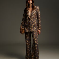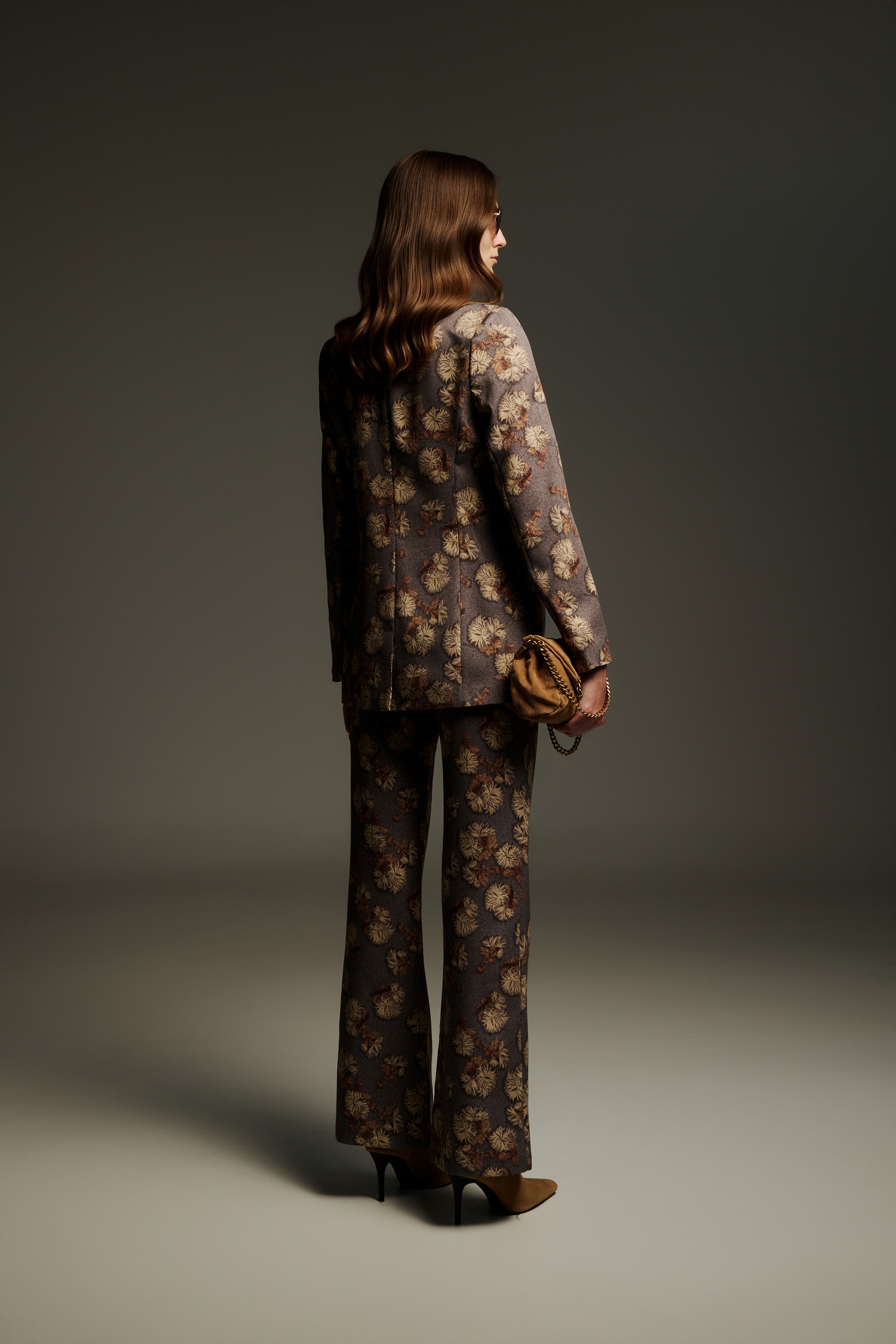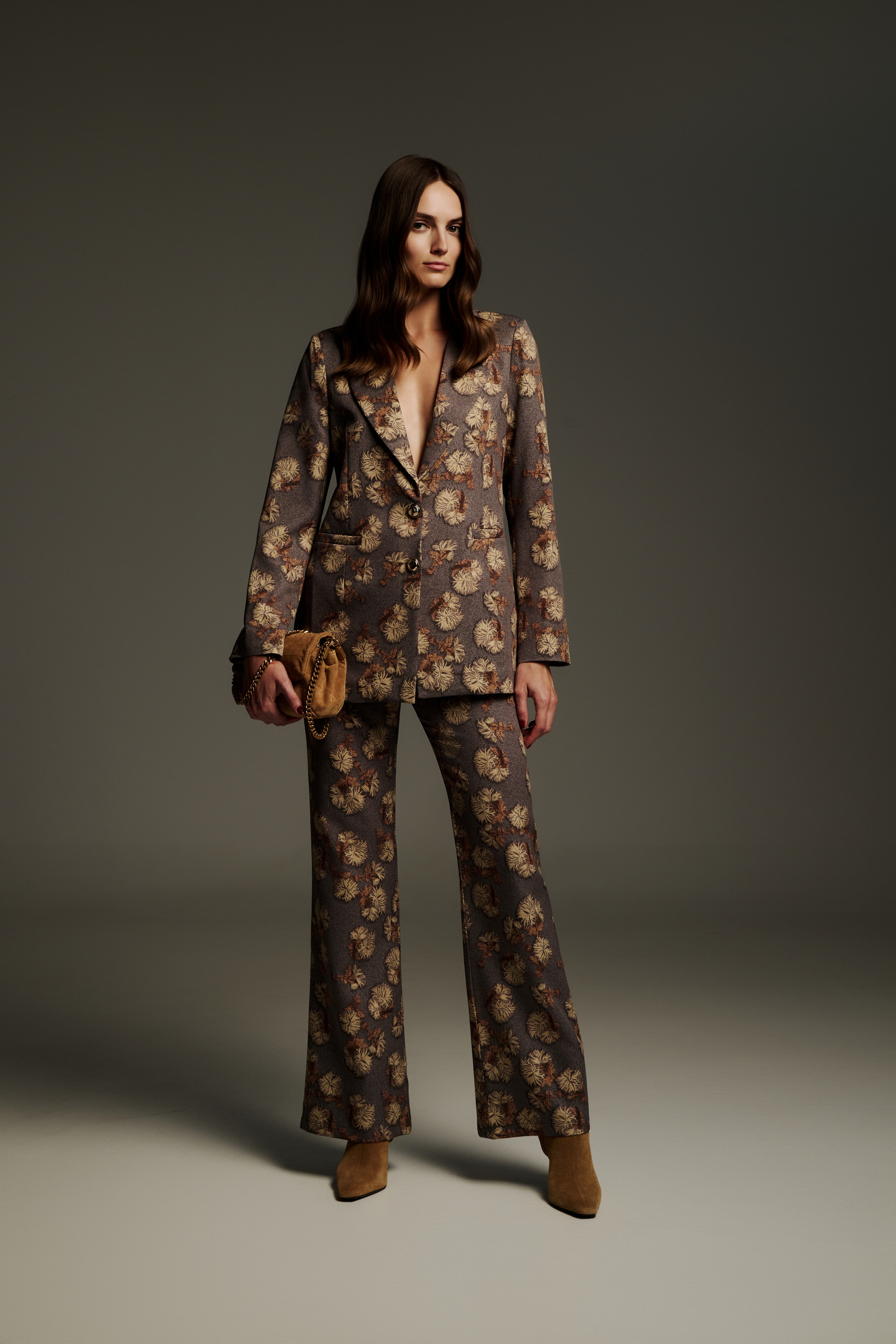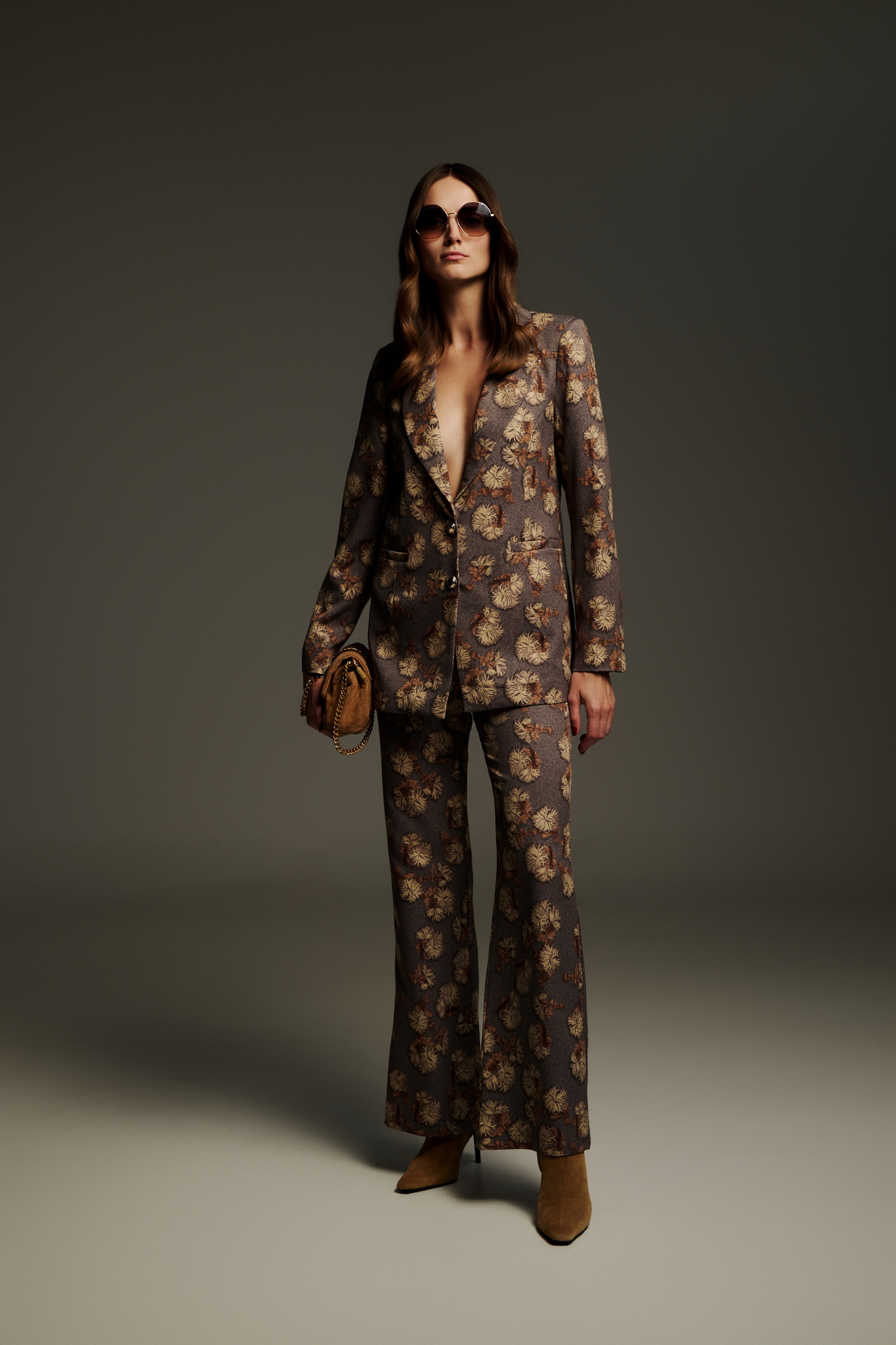 Γυναικείο blazer με ίσια γραμμή και jacquard ύφασμα, διακοσμημένο με all-over floral μοτίβο σε αποχρώσεις του μπρονζέ, χρυσού, μπεζ και καφέ. Το σακάκι έχει έντονους ώμους, μυτερά πέτα και διακοσμητικά κουμπιά, προσφέροντας glam, 70s-inspired αισθητική.