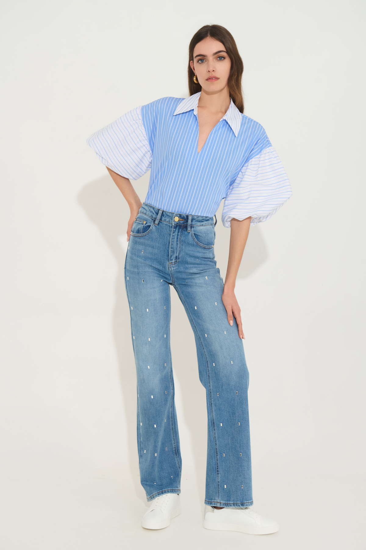 Ριγέ μπλούζα με statement φουσκωτά μανίκια και κομψό V-ντεκολτέ. Ιδανική για casual chic, office look & ανοιξιάτικες/καλοκαιρινές εμφανίσεις.