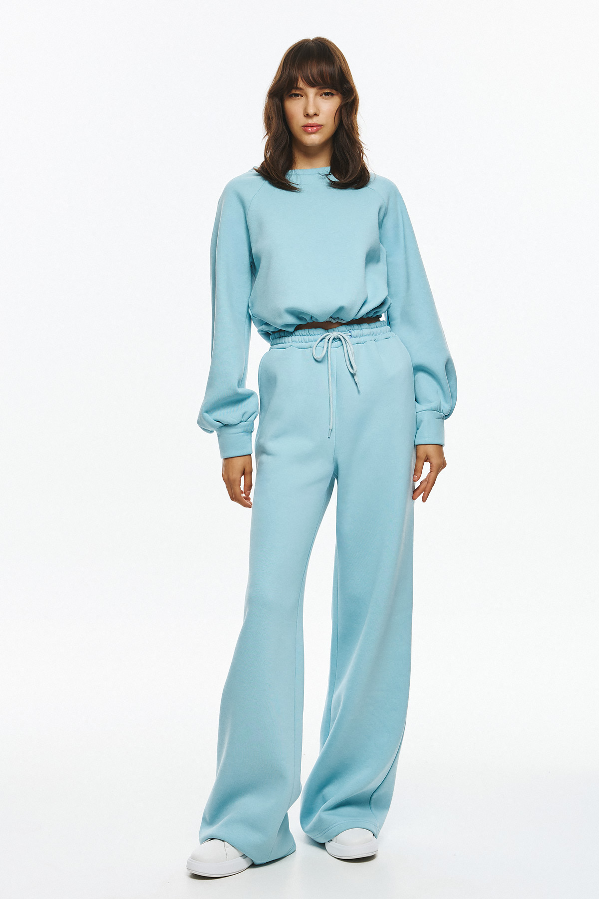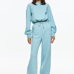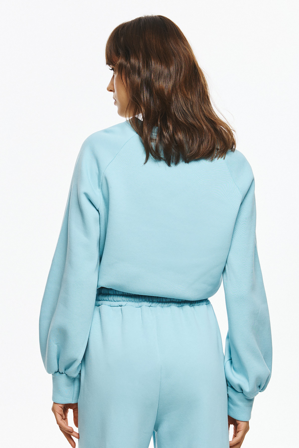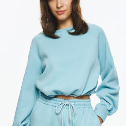Cropped φούτερ με μαλακή, απλή υφή, χωρίς στάμπες ή διακοσμητικά, φουσκωτά μανίκια με λάστιχο στις μανσέτες και φαρδύ τελείωμα κάτω από το στήθος που αγκαλιάζει τη μέση. Η εφαρμογή είναι άνετη και το μήκος του φούτερ αφήνει την κοιλιά ακάλυπτη.
