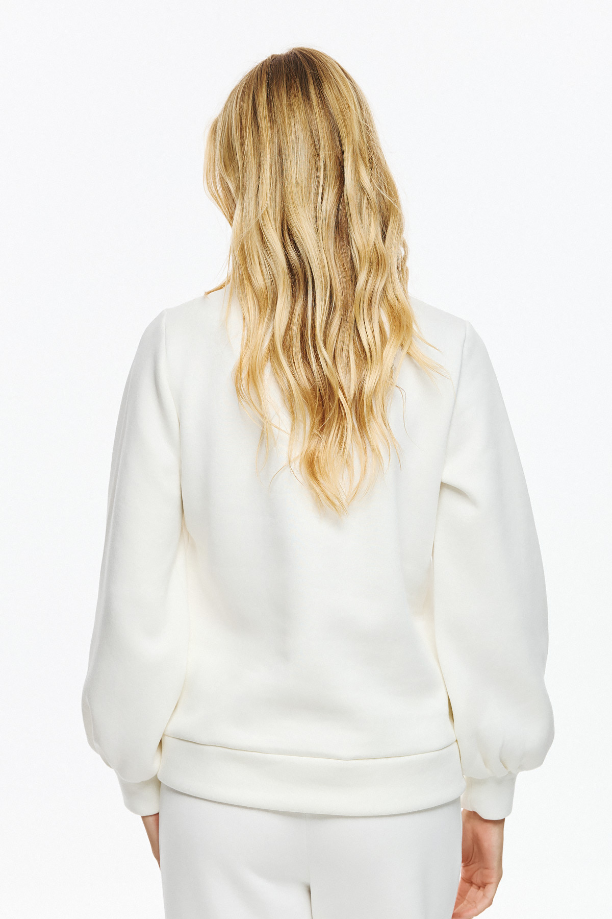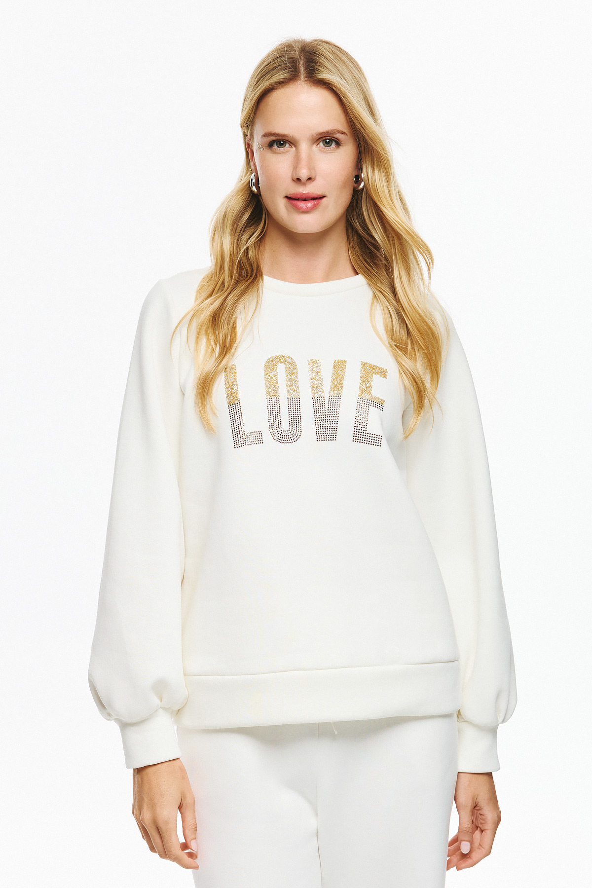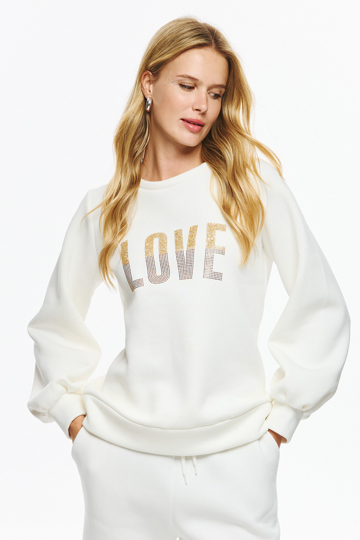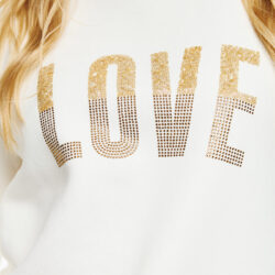 Φούτερ μπλούζα με άνετη εφαρμογή και balloon μανίκια. Στο μπροστινό μέρος αναγράφεται η λέξη “LOVE” με ιδιαίτερο σχέδιο που ξεκινάει με χρυσό glitter στο επάνω μέρος κάθε γράμματος και καταλήγει χαμηλά σε σειρές μικρών χρυσών μεταλλικών τρουκς για λαμπερό, glam αποτέλεσμα. Το ρούχο αποπνέει μοντέρνο, θηλυκό και statement χαρακτήρα, ιδανικό για stylish casual εμφανίσεις.