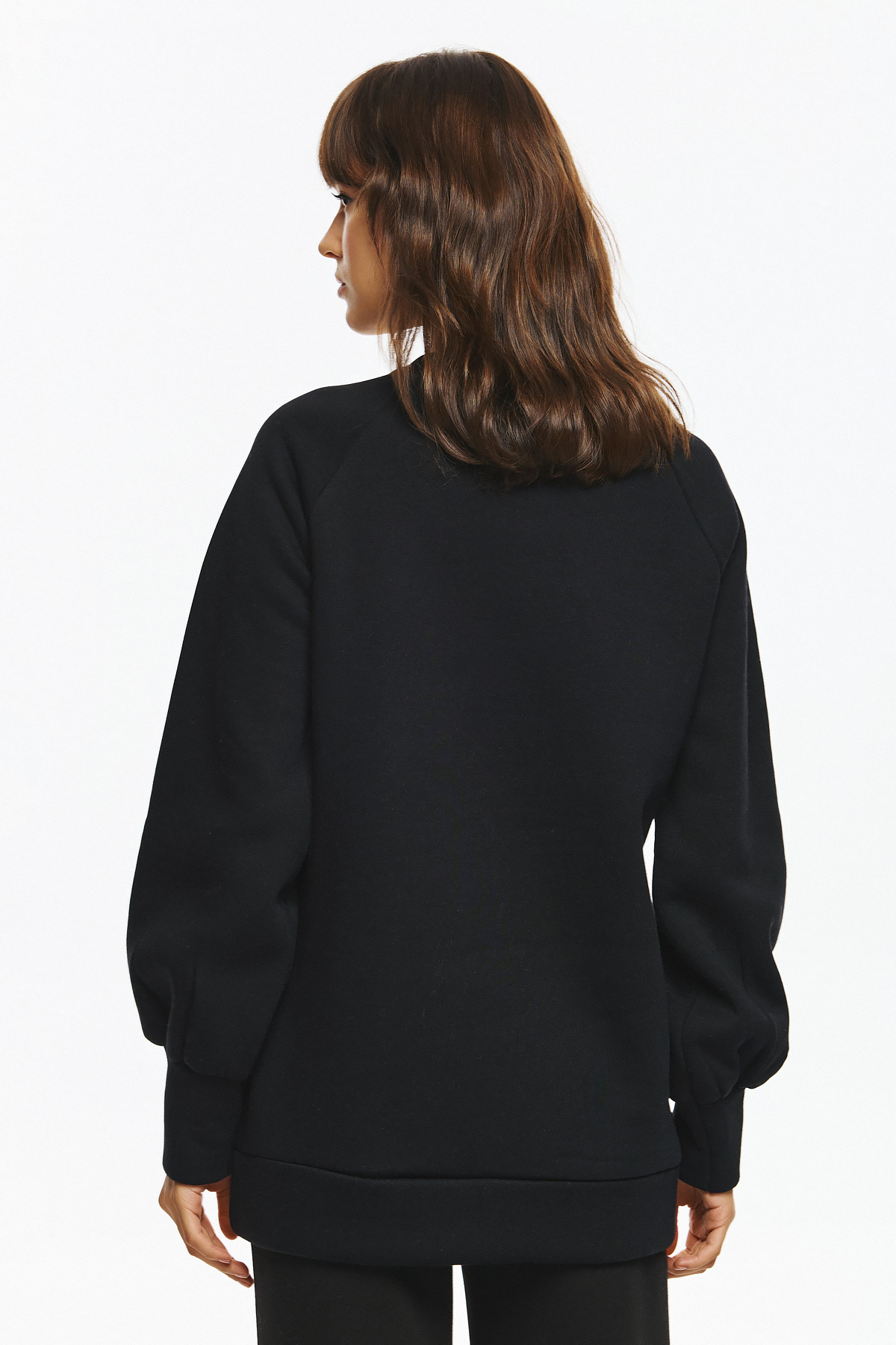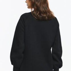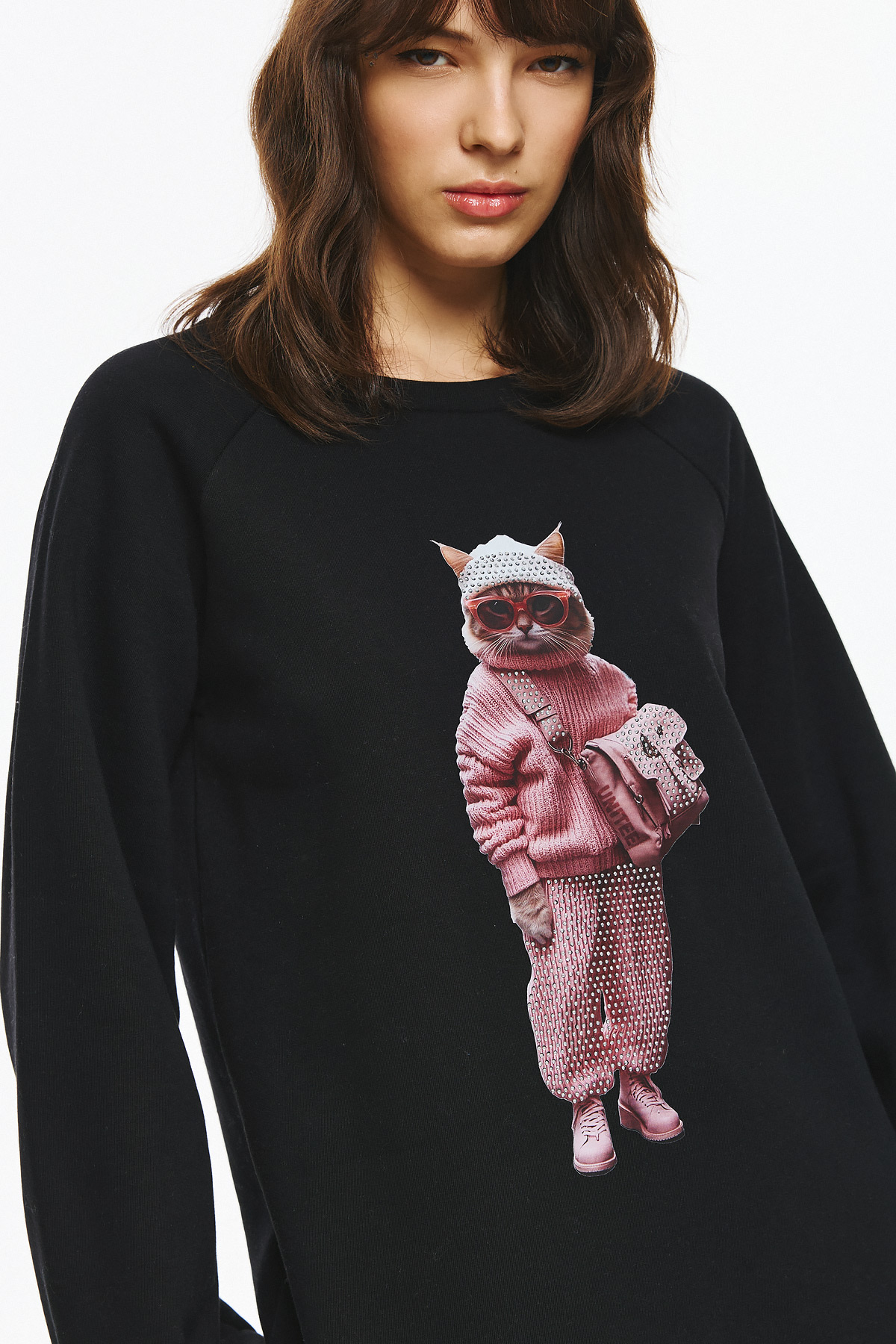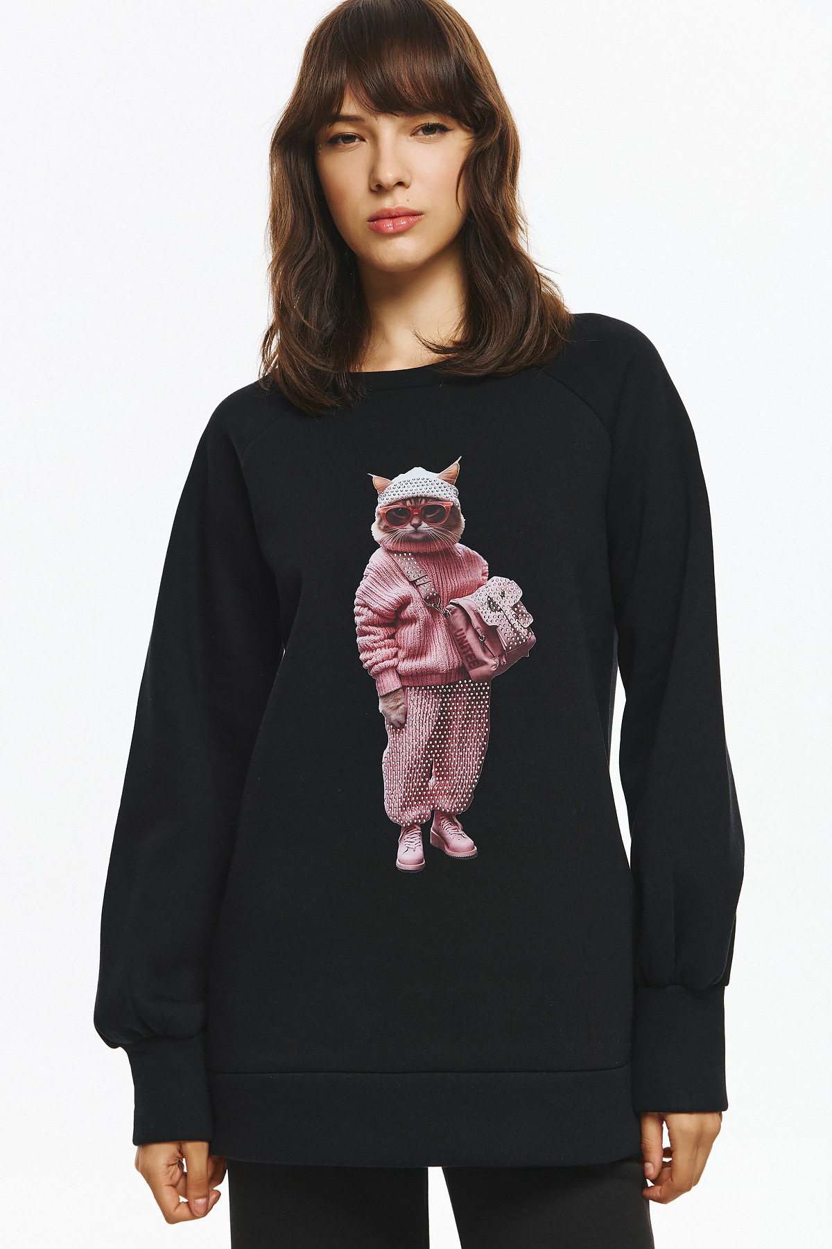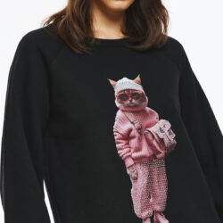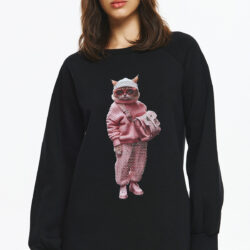 Oversized φούτερ με μακρύ μανίκι σε φουσκωτή γραμμή και μανσέτες. Στο κέντρο του στήθους έχει μεγάλο πολύχρωμο print με μια γάτα ντυμένη με ροζ πλεκτό πουλόβερ, ροζ παντελόνι με τρουκς και ροζ τσάντα ώμου, φορώντας επίσης ροζ γυαλιά ηλίου και σκούφο, δημιουργώντας ένα χαριτωμένο και μοντέρνο σχέδιο.