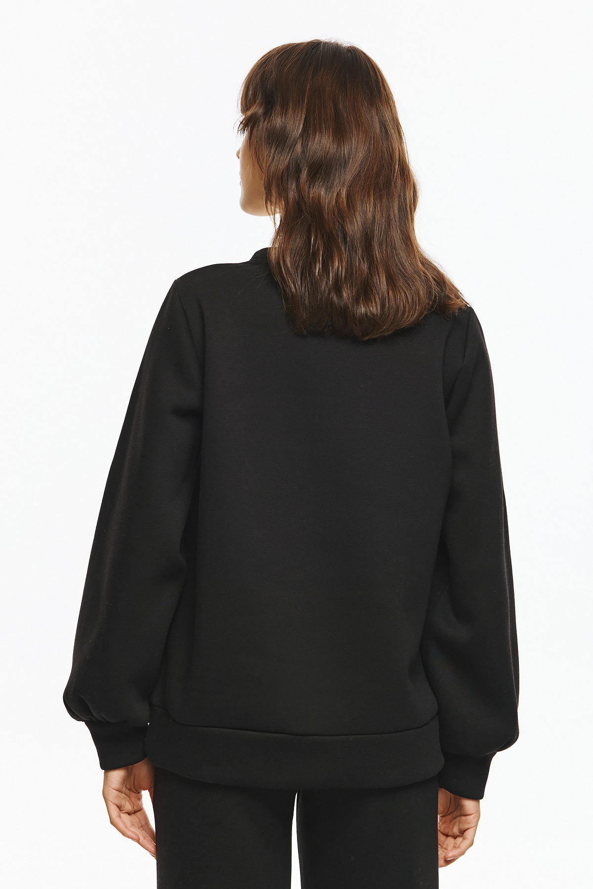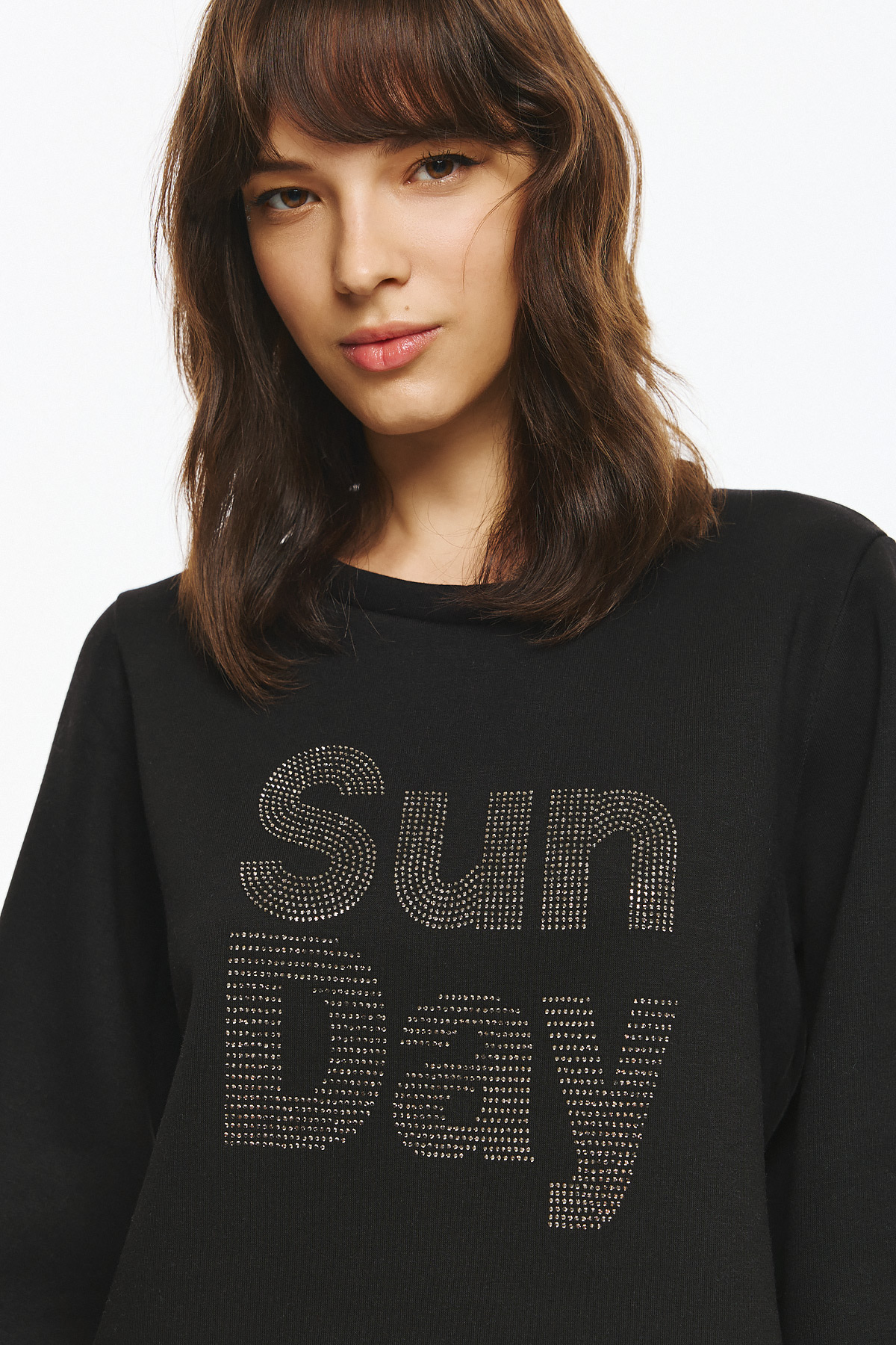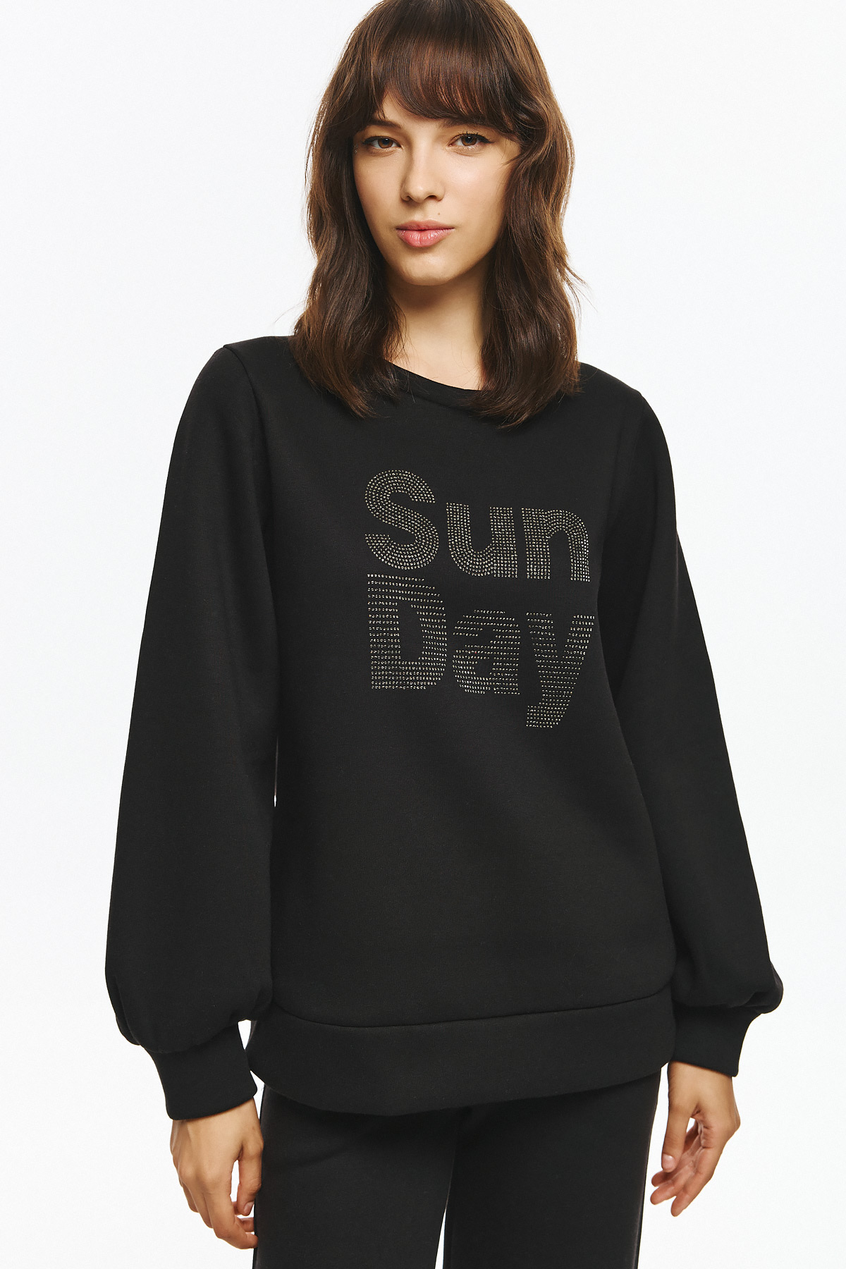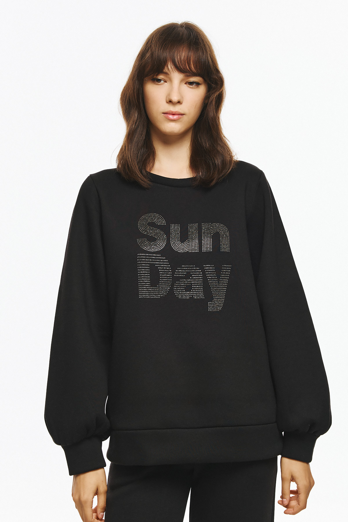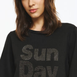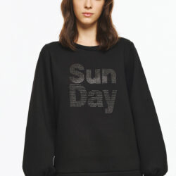 Φούτερ μπλούζα με balloon μανίκια και κλασικό λαιμό, με στάμπα “Sun Day” σχηματισμένη με μικρά διακριτικά στρας. H στάμπα δίνει μοντέρνα, minimal αισθητική και προσθέτει λάμψη στο statement look και το χαλαρό fit την καθιστούν κατάλληλη για καθημερινή, casual χρήση με στιλ.