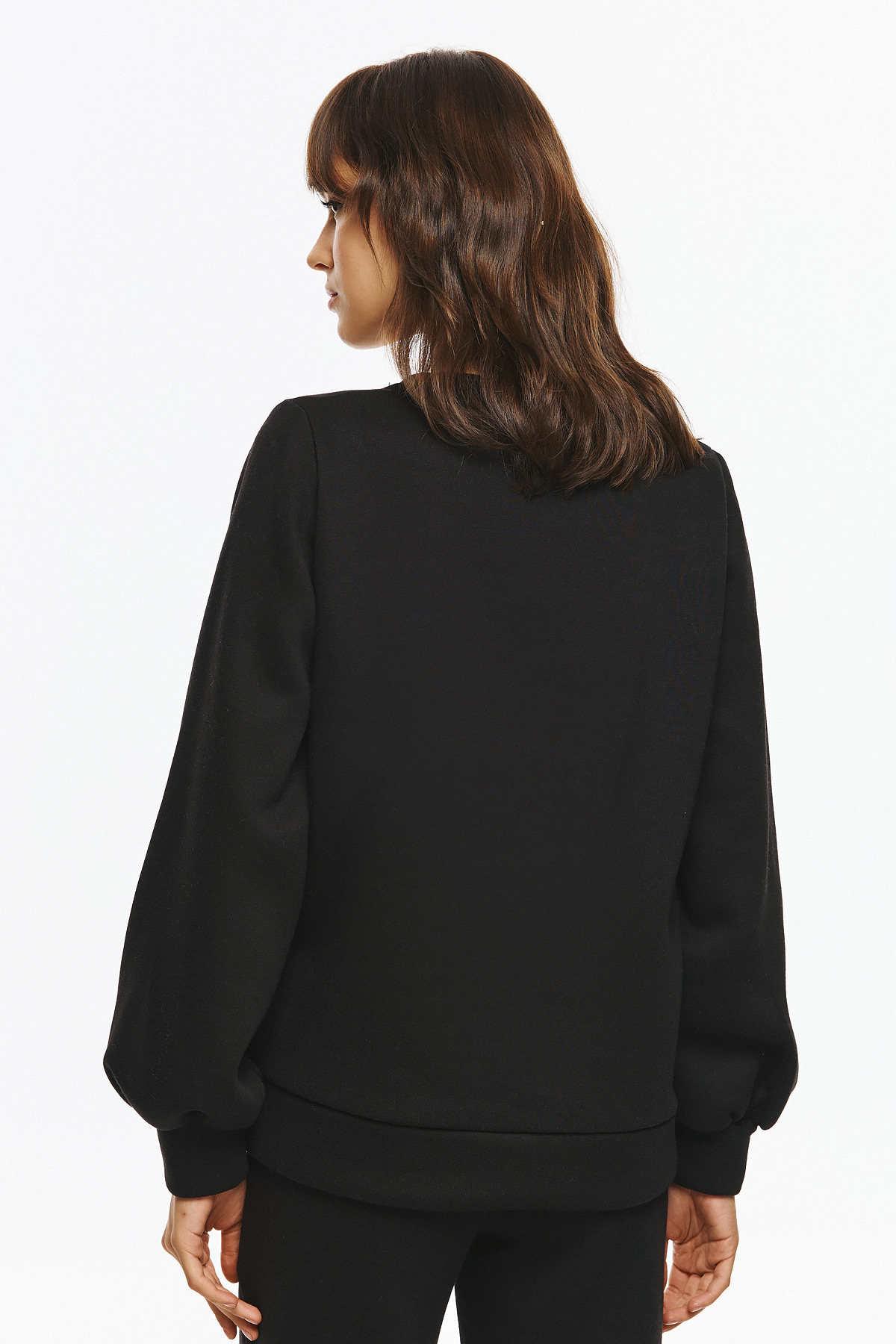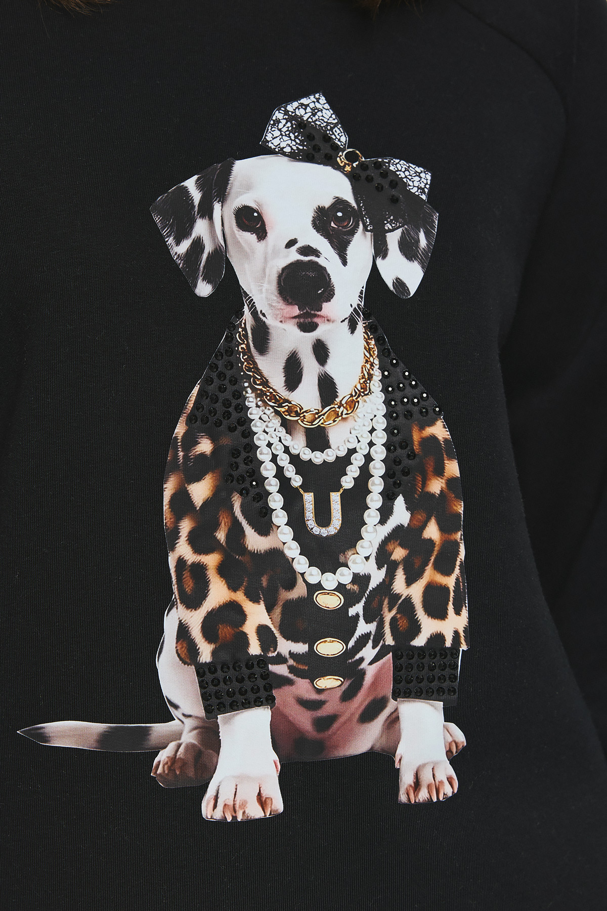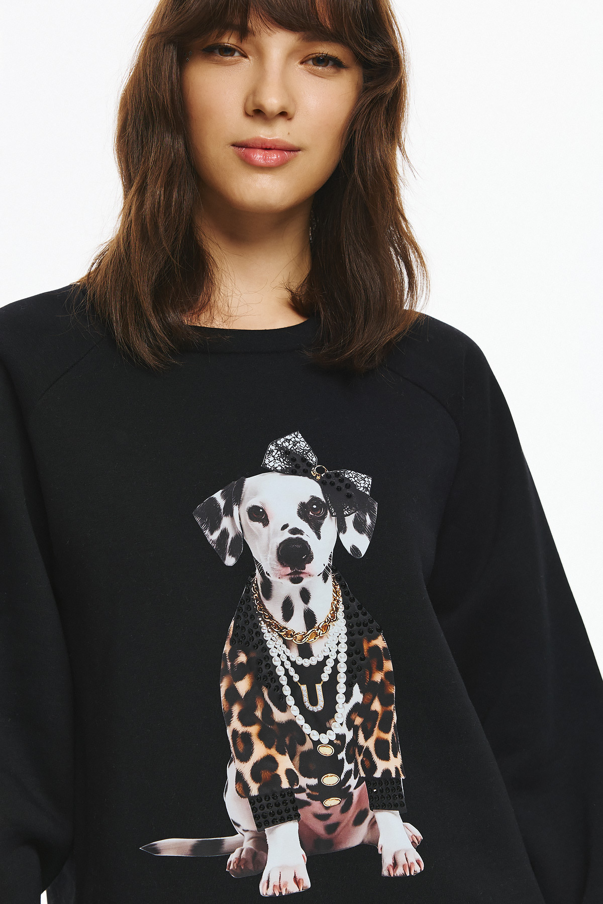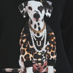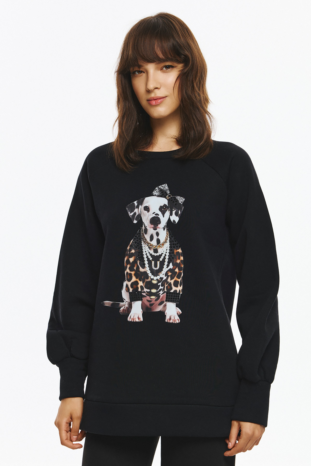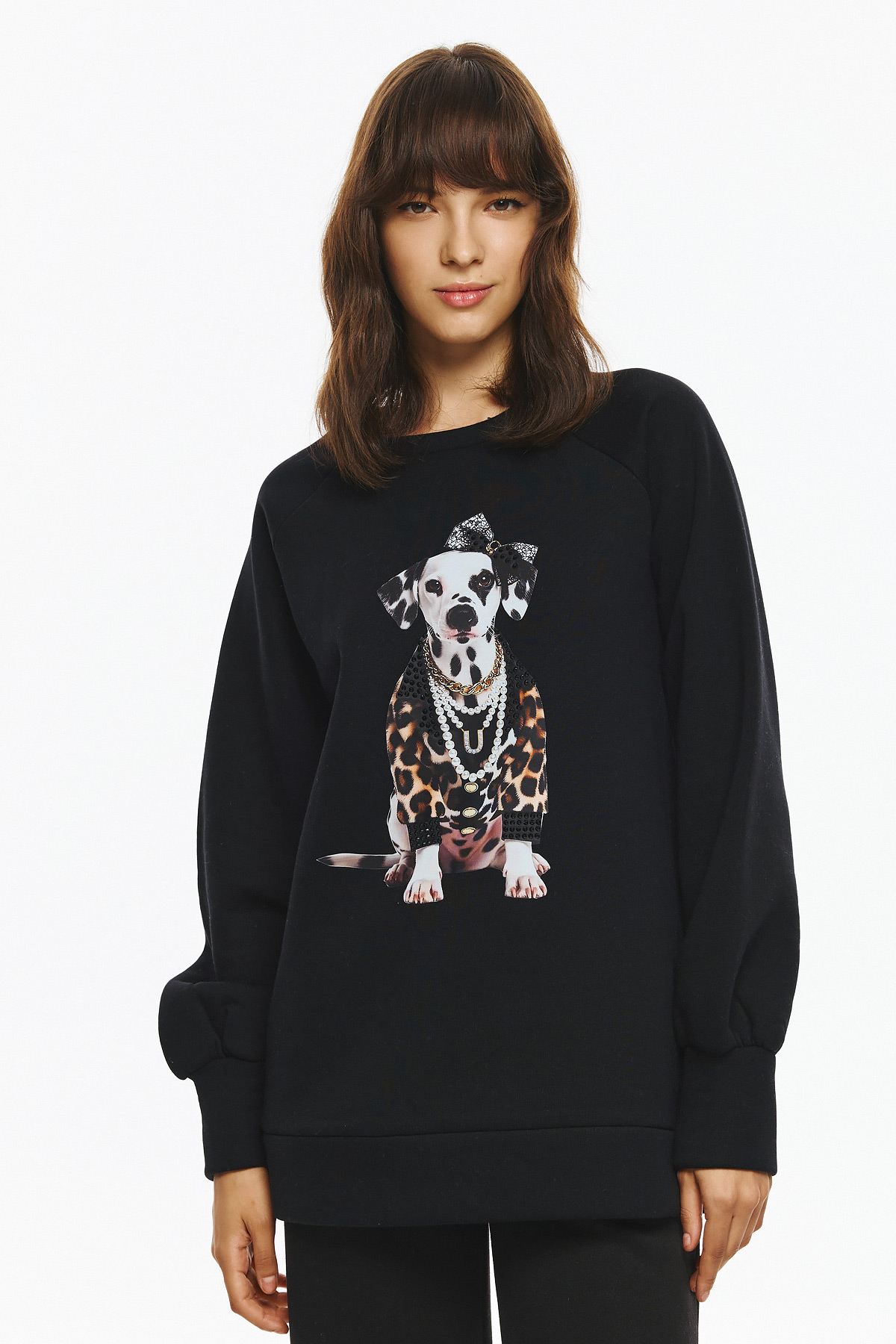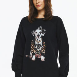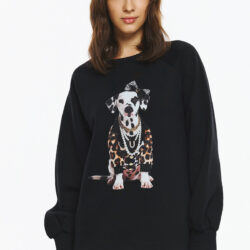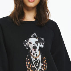 Φούτερ με φουσκωτά μανίκια, φαρδιά γραμμή και στρογγυλή λαιμόκοψη. Στο μπροστινό μέρος του φούτερ υπάρχει στάμπα με σκύλο, ντυμένο με leopard print ρούχο, πέρλες και φιόγκο, δημιουργώντας ένα παιχνιδιάρικο και fashion-forward look.