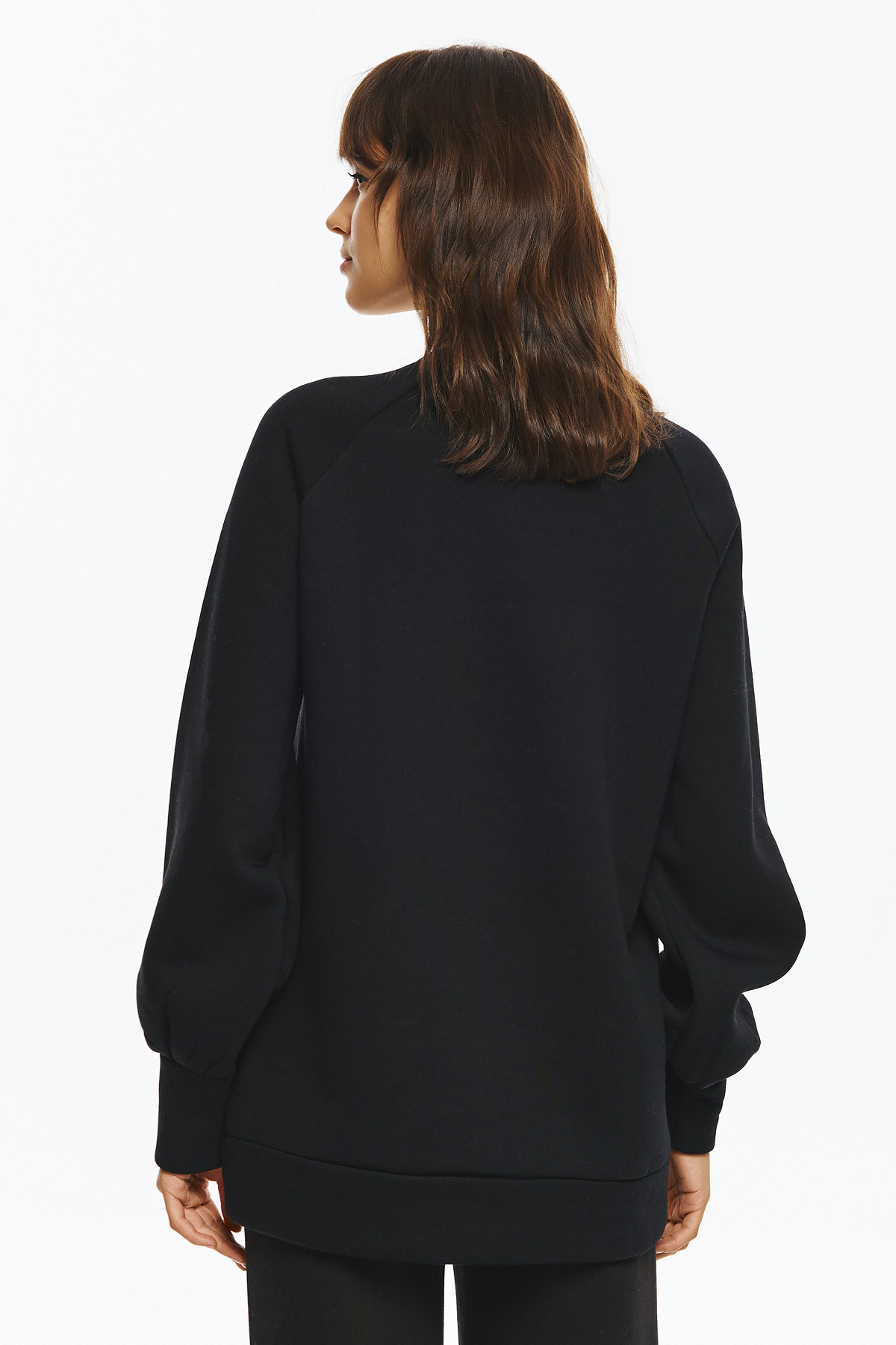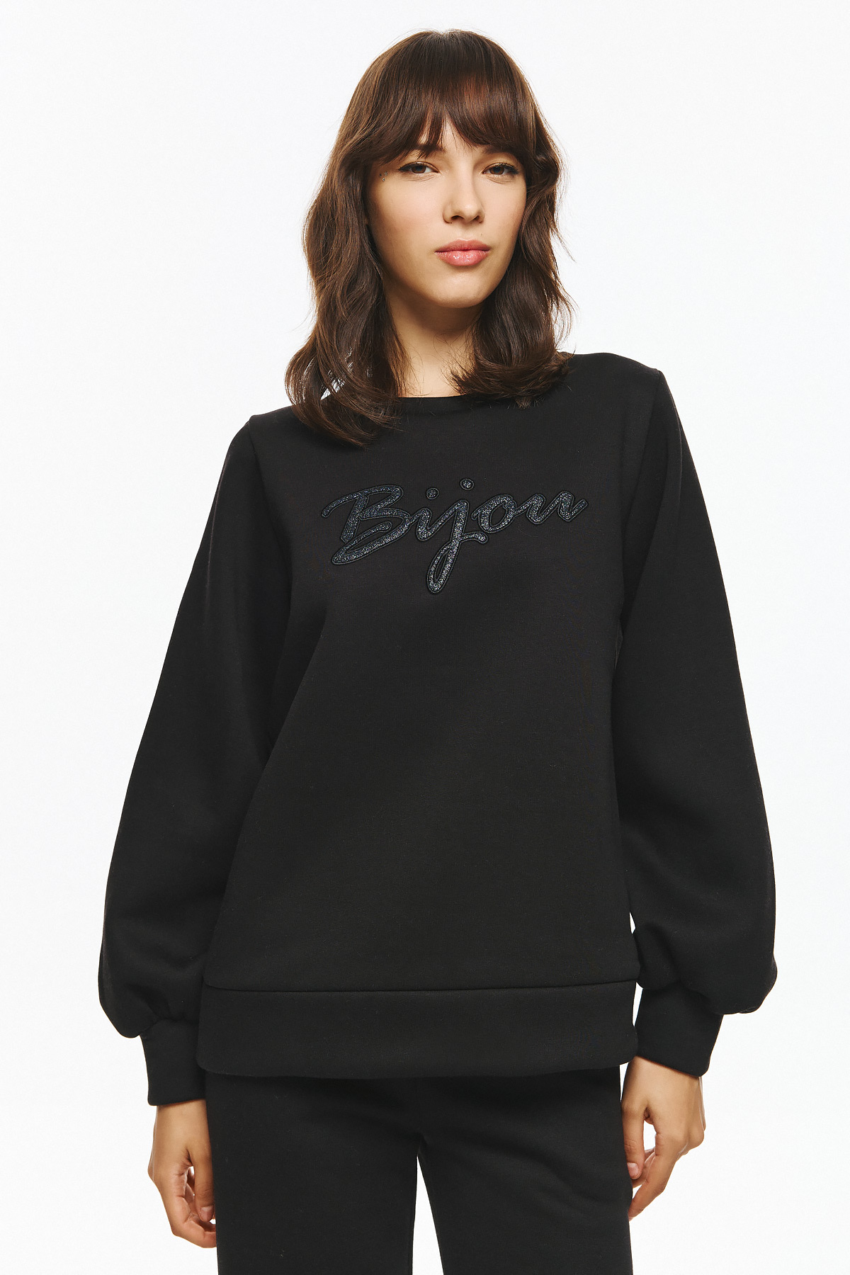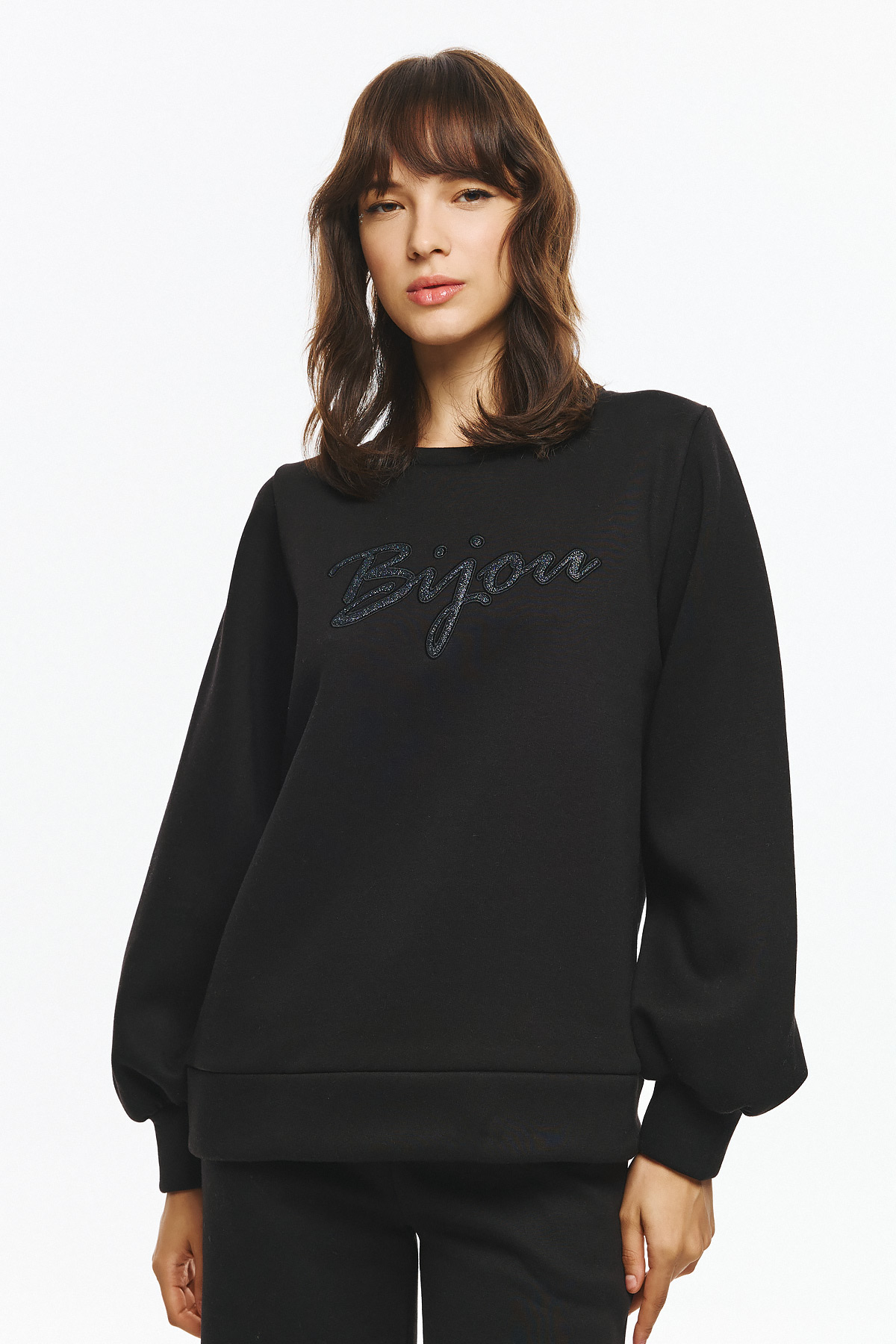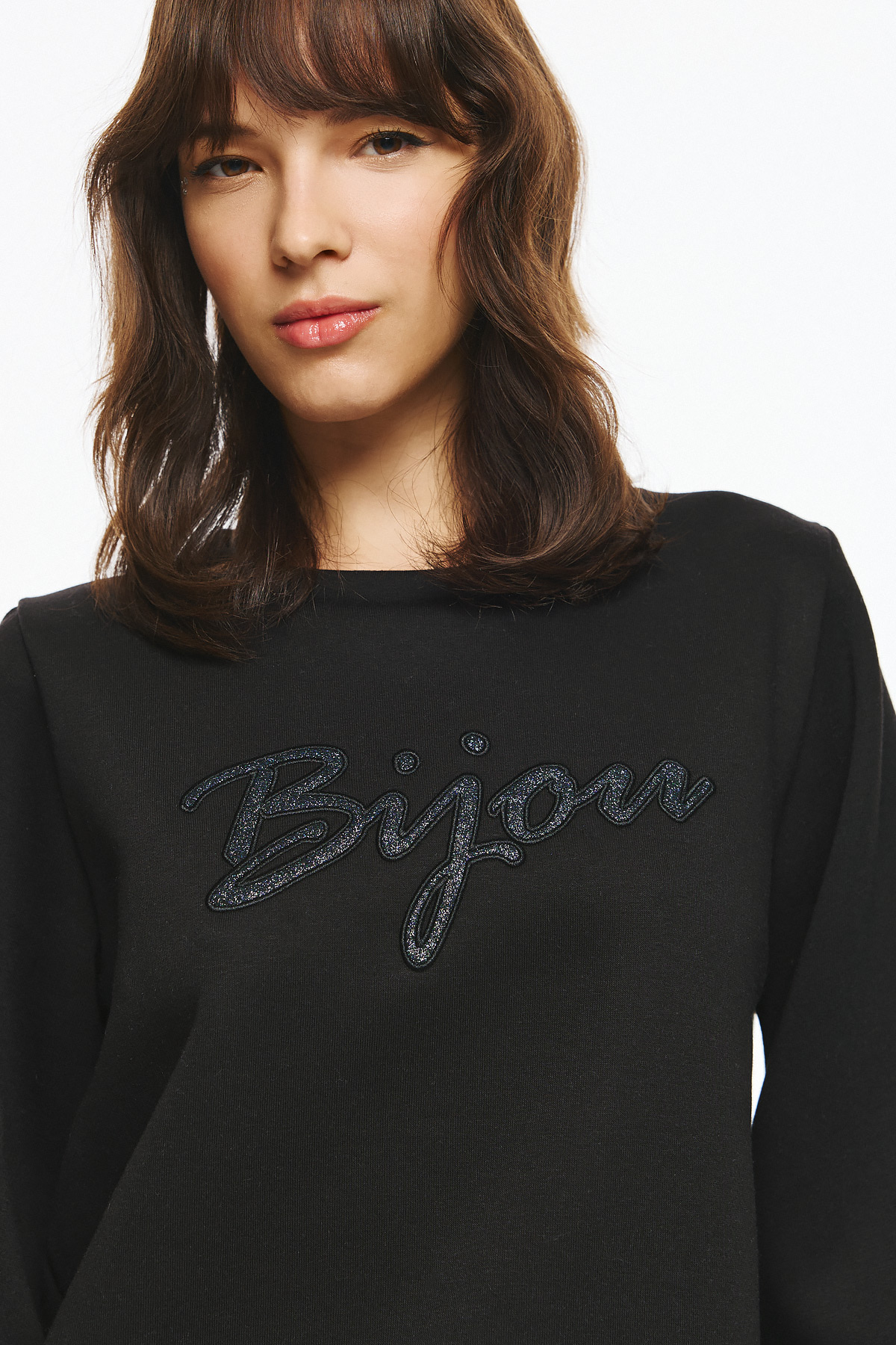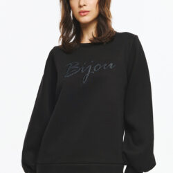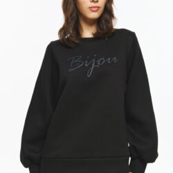 Φούτερ με μακριά μανίκια και κανονική εφαρμογή. Διακοσμείται στο εμπρός μέρος με τη λαμπερή λέξη “Bijou” με glitter λεπτομέρειες. Το σχέδιο αποπνέει φρέσκια, νεανική και playful αισθητική, ενώ συνδυάζεται ιδανικά με παντελόνι φόρμας για ολοκληρωμένο minimal look.