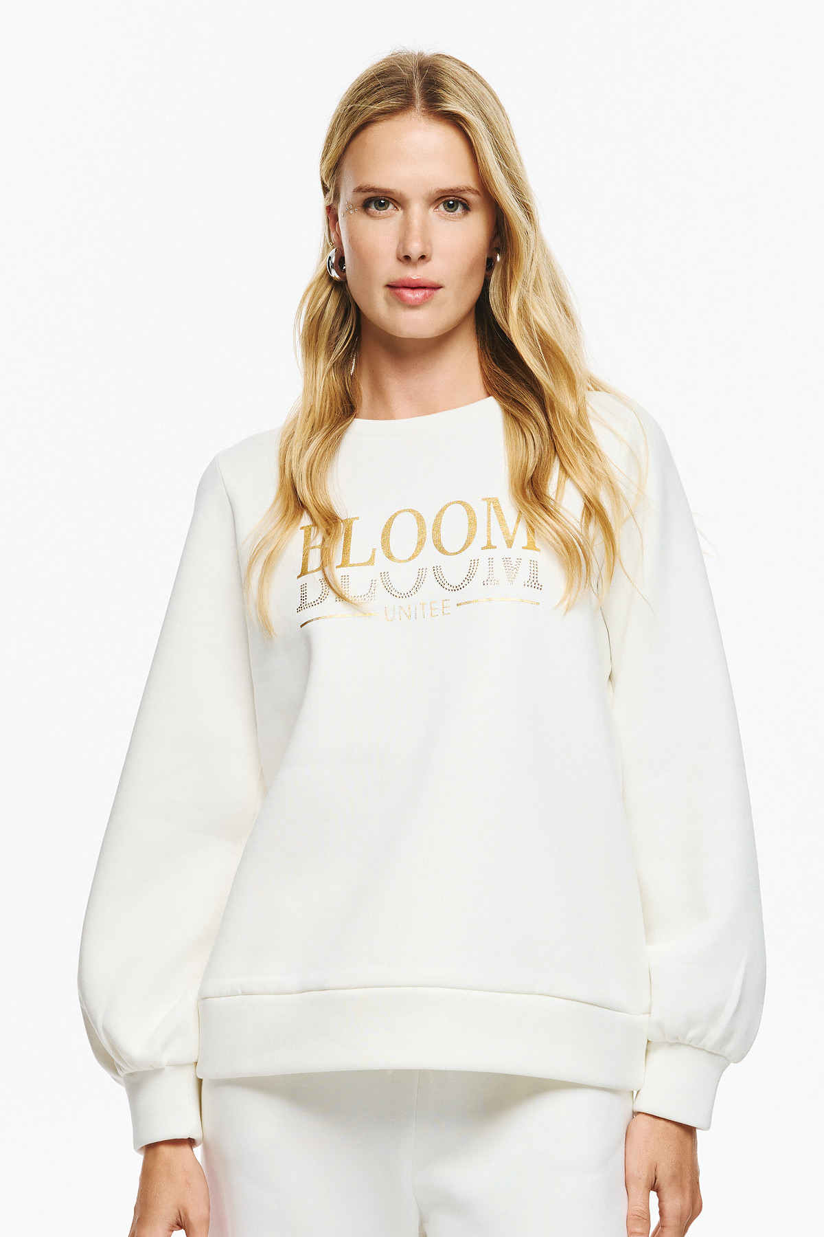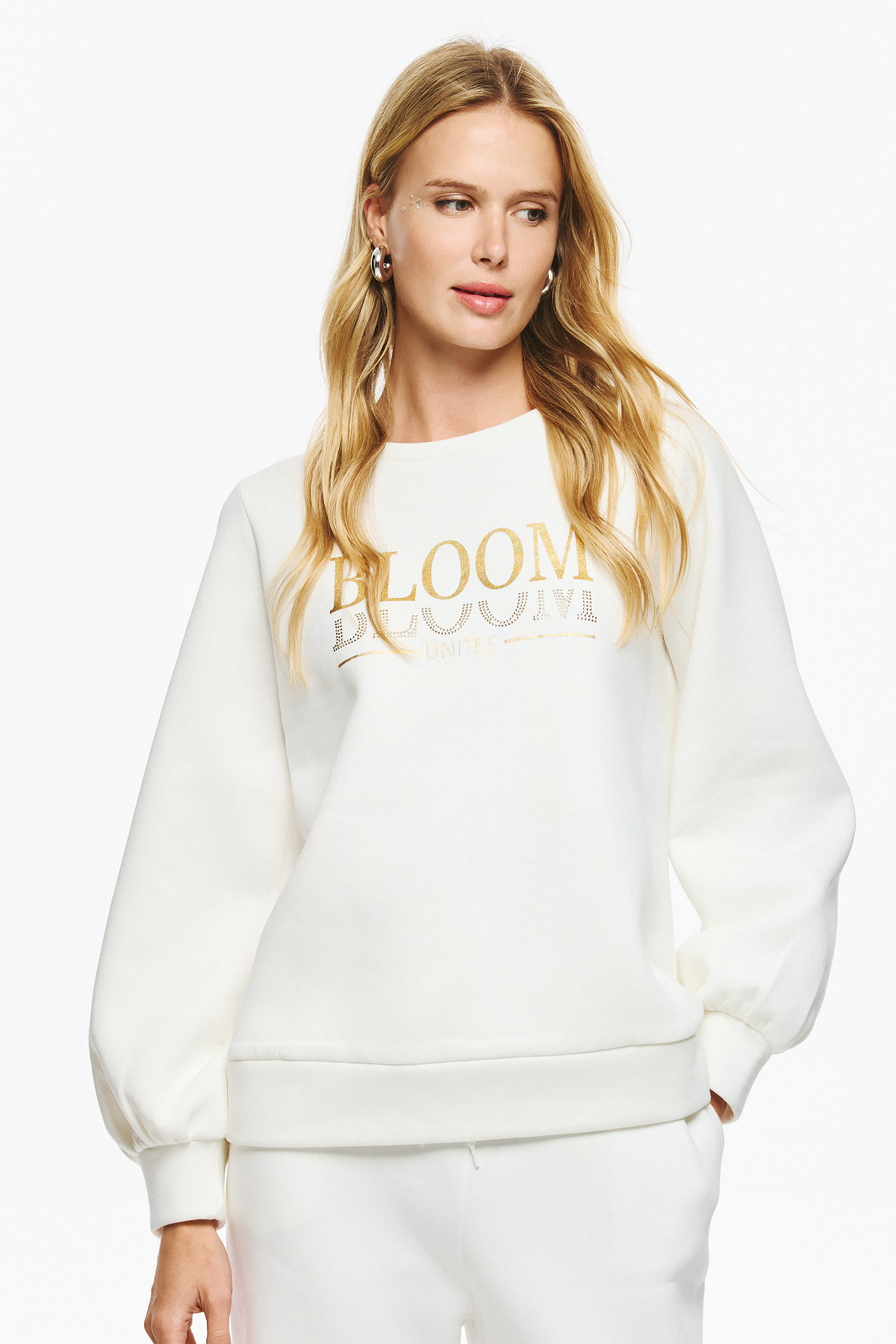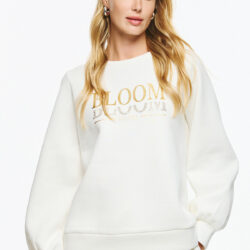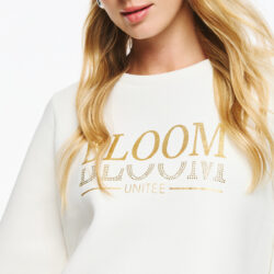 Φούτερ μπλούζα με balloon μανίκια, χαλαρή εφαρμογή και κλασικό λαιμό. Η πρόσοψη της μπλούζας διακοσμείται με χρυσό τύπωμα που γράφει “BLOOM” και “UNITEΕ”, ενώ το δεύτερο “BLOOM” είναι σχεδιασμένο με χρυσά στρας για πιο ιδιαίτερο statement αποτέλεσμα. Πρόκειται για fashion forward επιλογή που μπορεί να συνδυαστεί εύκολα σε μοντέρνα streetwear ή casual εμφανίσεις.