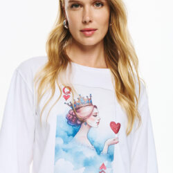 T-shirt με άνετη, φαρδιά γραμμή και 3/4 μανίκι καμπάνα Το print στο μπροστινό μέρος απεικονίζει φιγούρα queen of hearts με χρωματιστά μαλλιά και κορώνα, περιτριγυρισμένη από σύννεφα, ενώ κρατά διακοσμητική καρδιά με κόκκινα στρας. Το πίσω μέρος είναι μίνιμαλ, χωρίς σχέδια ή prints, αναδεικνύοντας τη μοντέρνα, καθαρή του γραμμή.