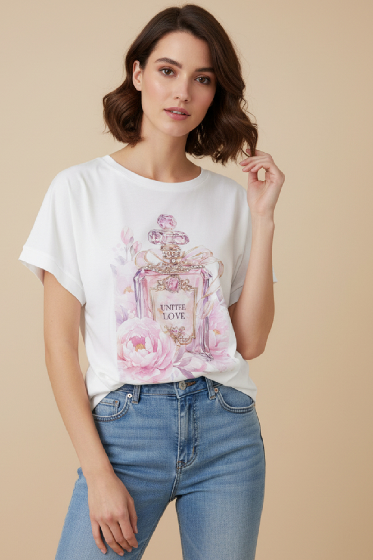 Γυναικείο t-shirt με εντυπωσιακή στάμπα μπουκαλιού αρώματος και ροζ φλοράλ μοτίβα. Άνετη γραμμή, ιδανικό για casual chic εμφανίσεις.